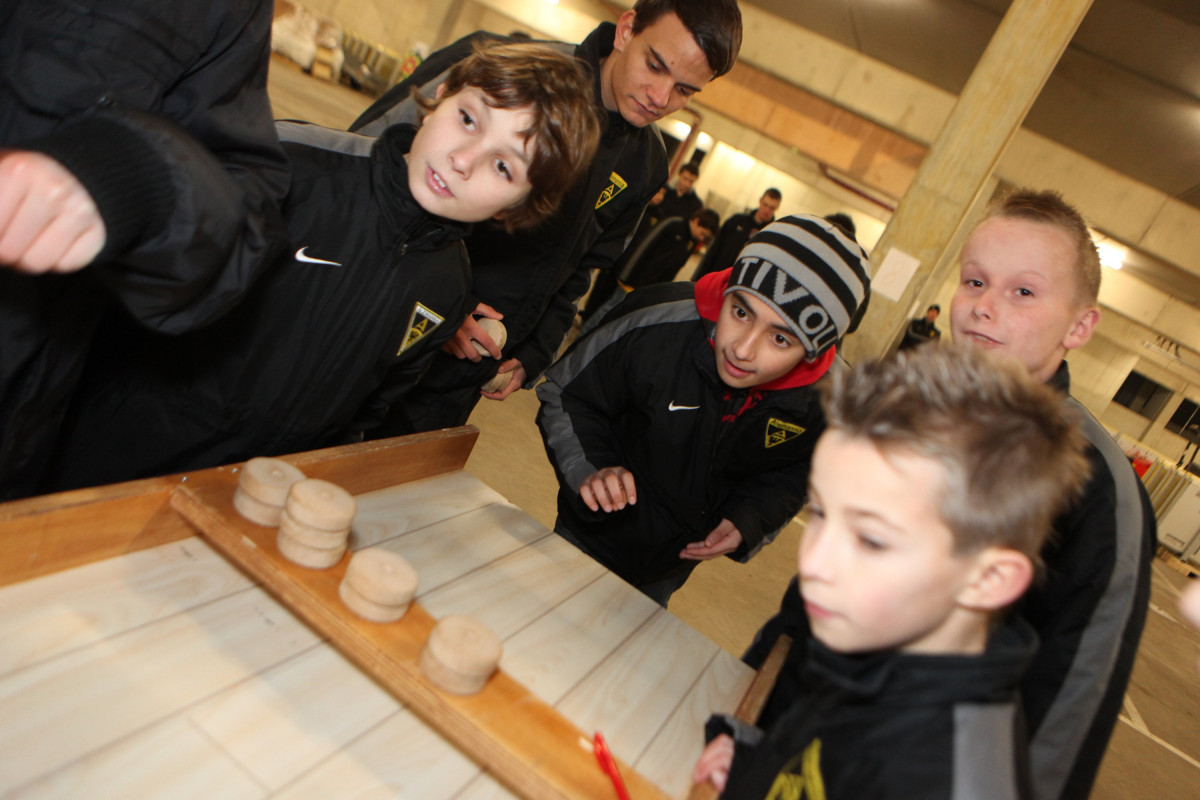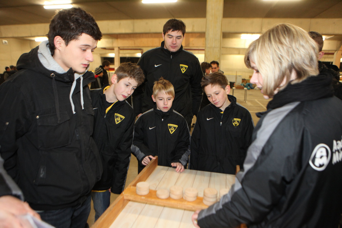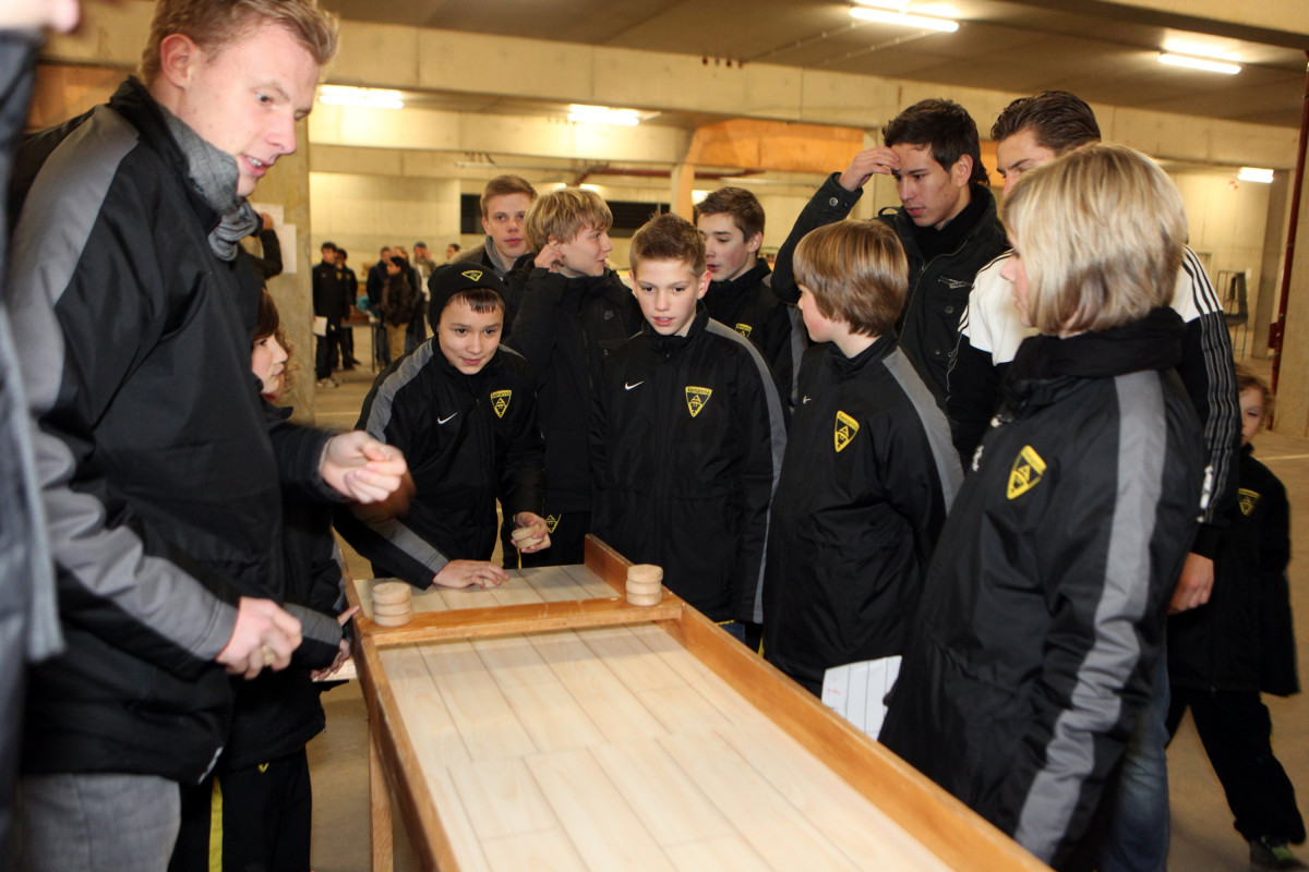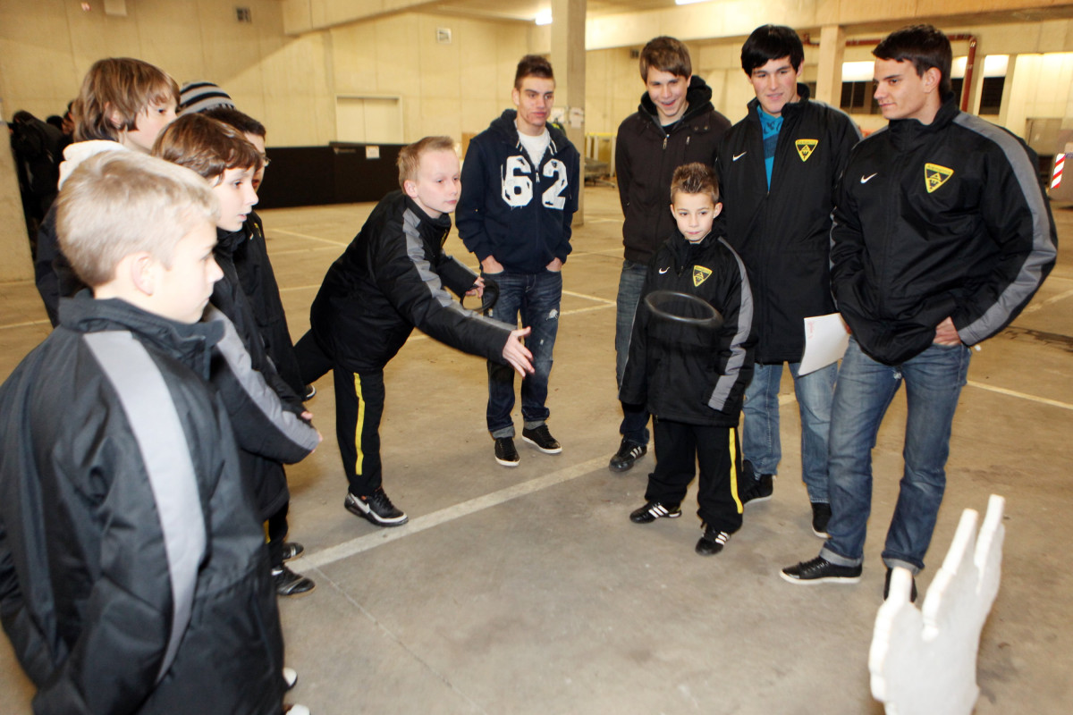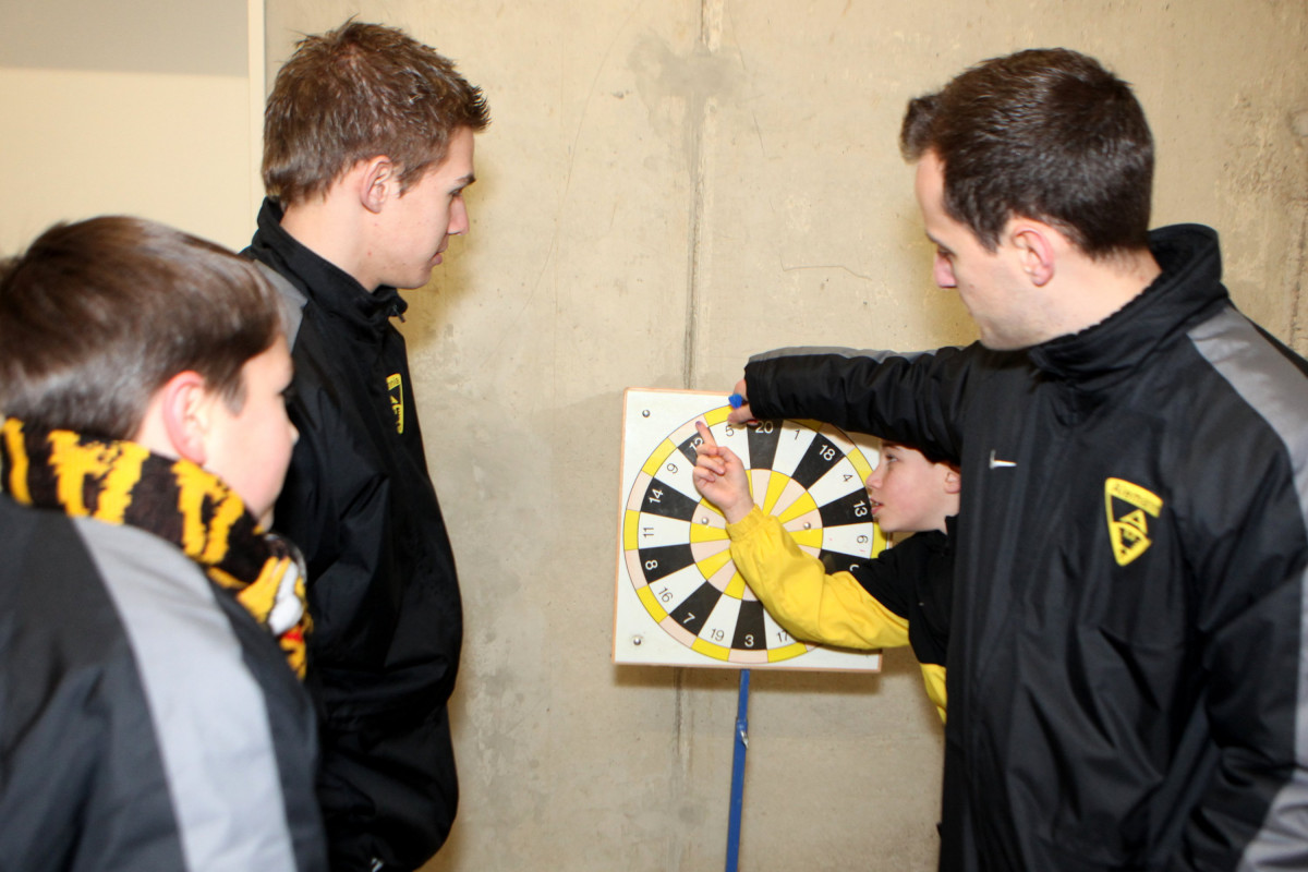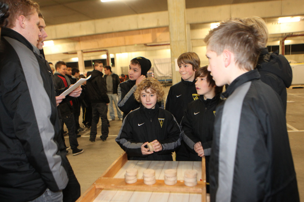 Vierzehn Teams wurden aus den 160 Spielern zusammengestellt, die auf einem Stationsparcours im und rund um das Stadion viele interessante und lustige Spiele und Aufgaben zu bewältigen hatten. Geschicklichkeit, Ballgefühl, Schnelligkeit und Orientierung waren nur einige Anforderungen, die die Gruppen beim Dosenwerfen, Minigolf, Zielschießen, Kegeln, gemeinsamen Skifahren und vielen anderen Spielen zu meistern hatten. Das Besondere dabei: Jedes Team war gemischt zusammengestellt und bestand also aus Spielern jeder Mannschaft. Schnell konnte man merken, wie sich in den Teams Ehrgeiz und Teamgeist entwickelten und es war schön zu beobachten, wie gegenseitig Tipps und Hilfestellung gegeben wurden. Die Großen kümmerten sich um die Kleinen und es ging teilweise richtig lautstark zur Sache. Oft sorgten die Kleinen für die Punkte in ihrem Team.