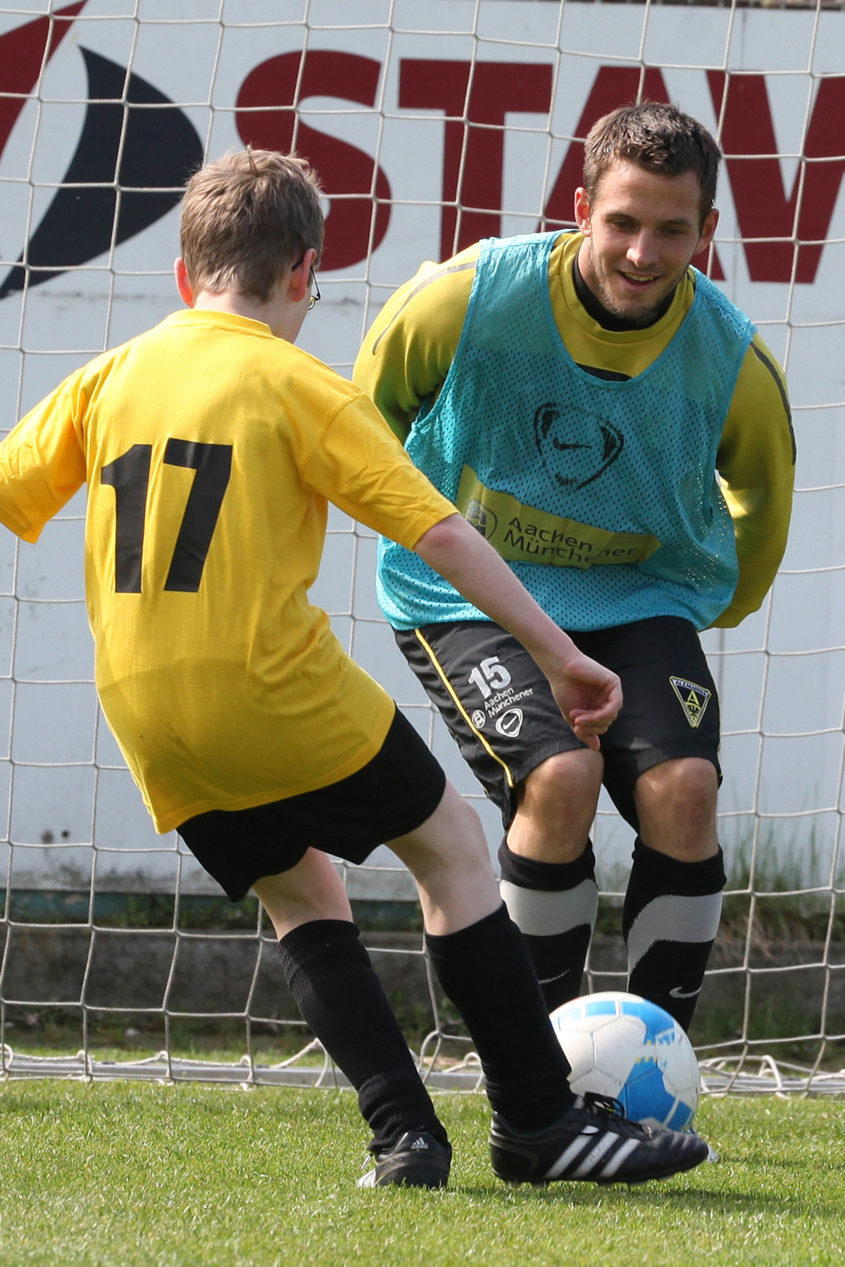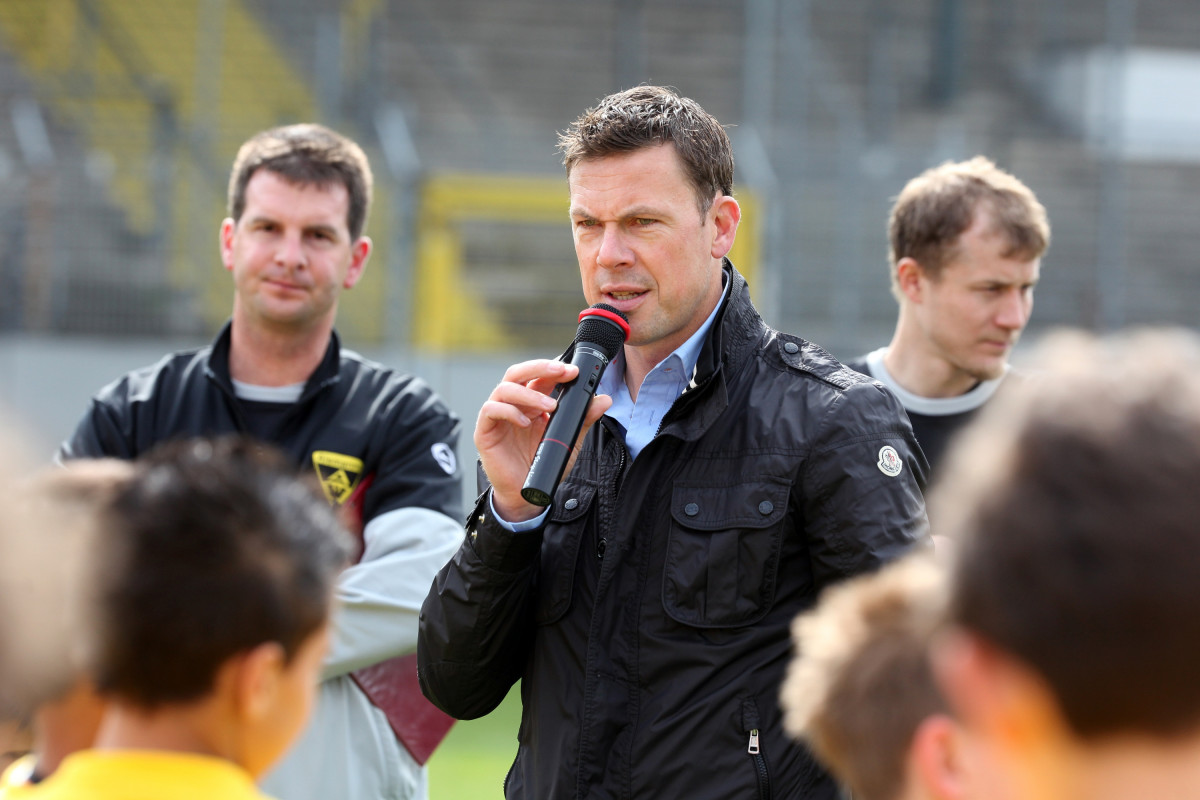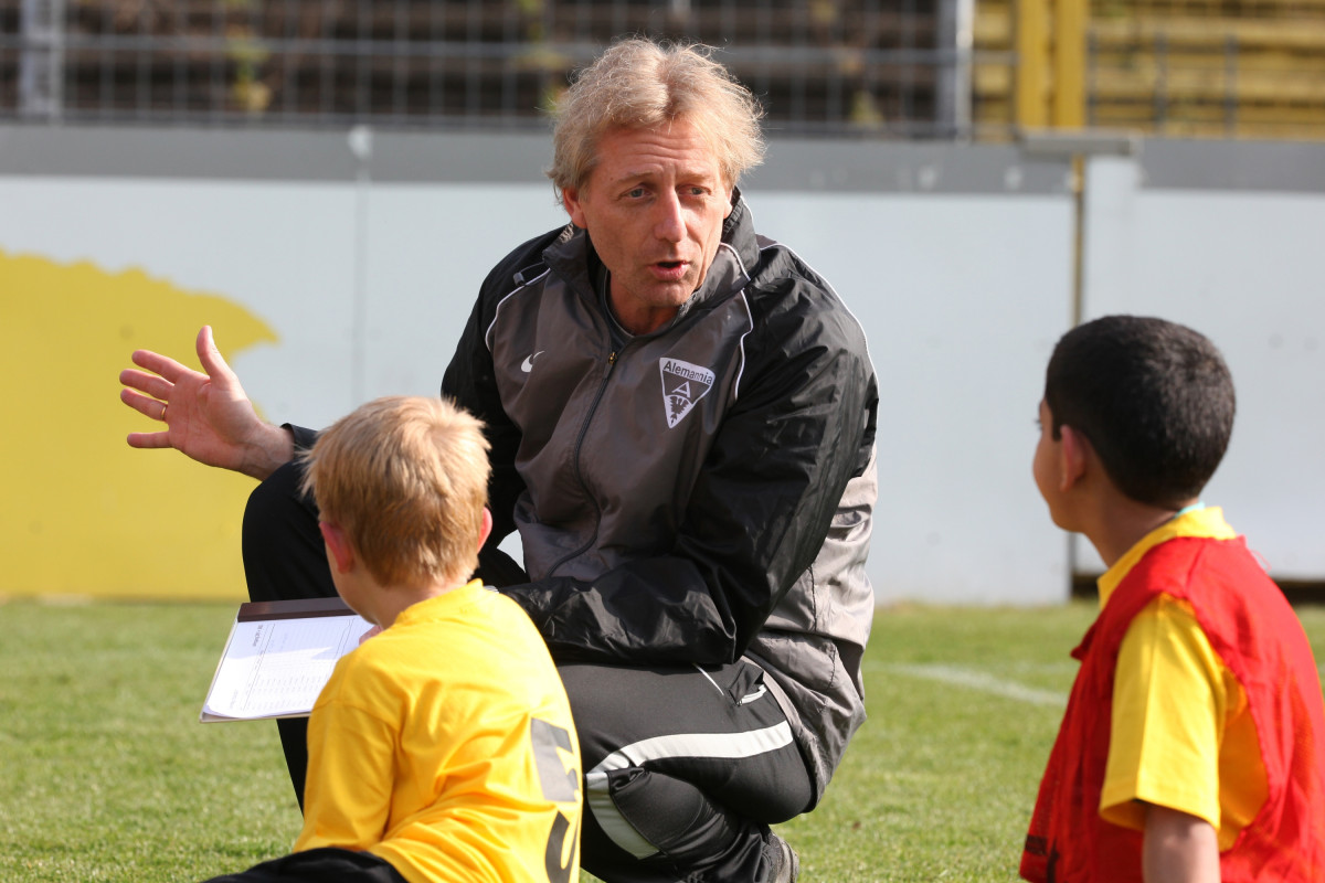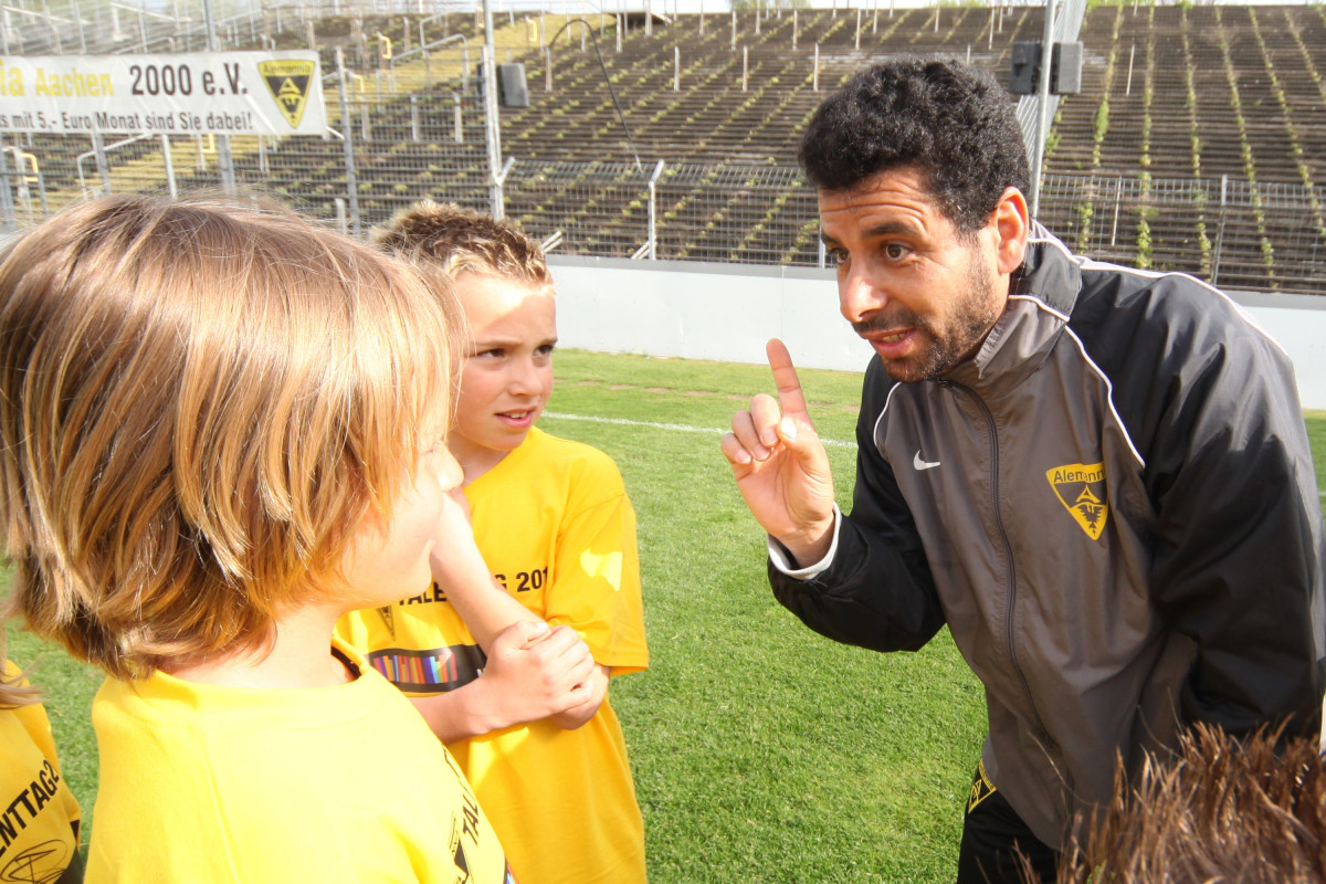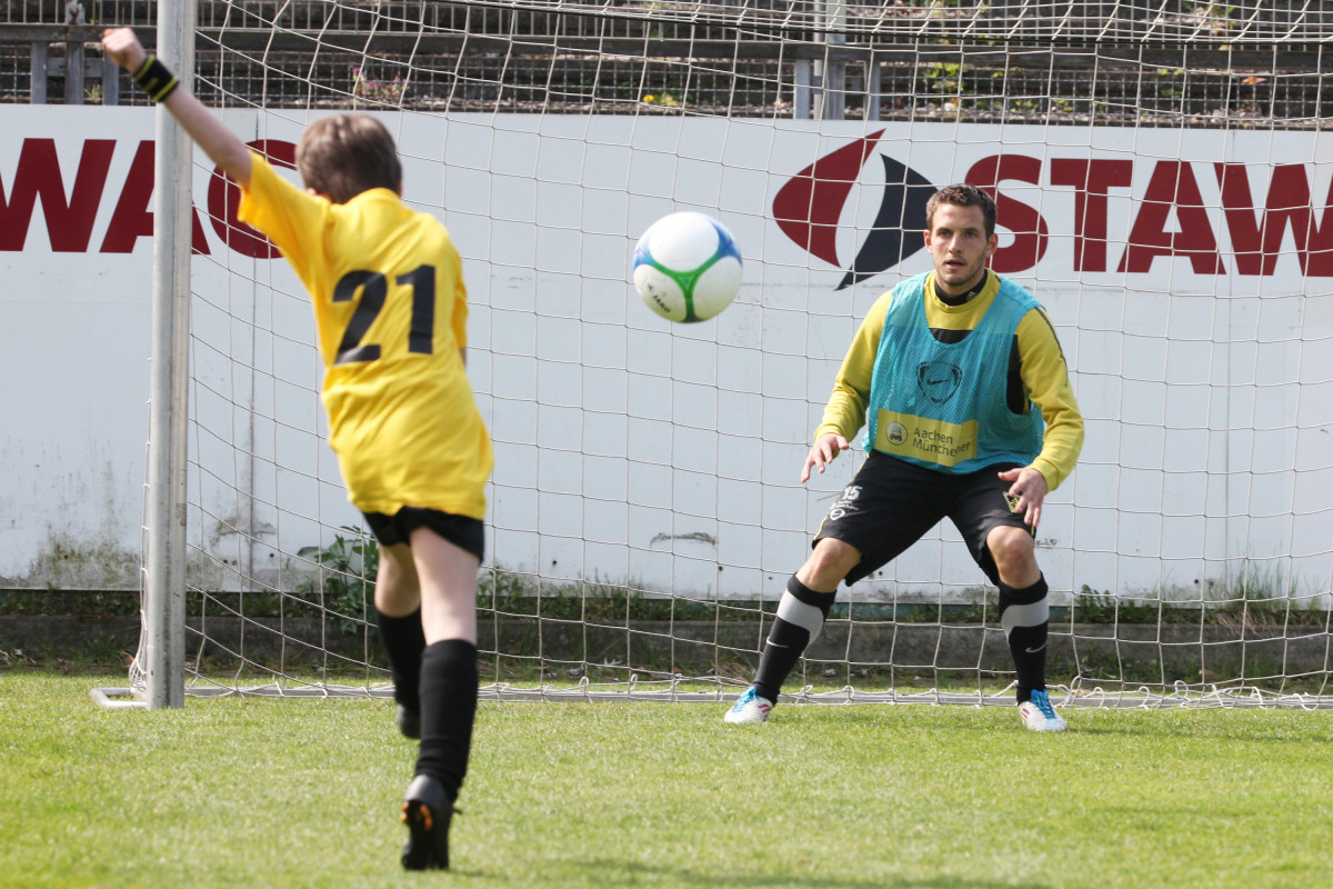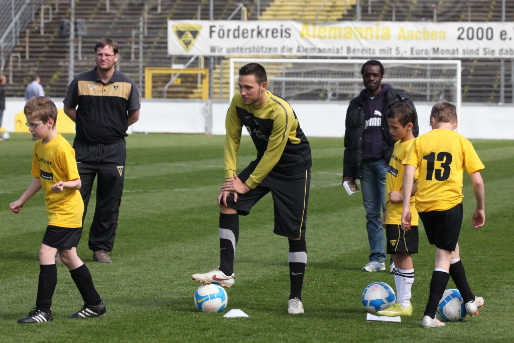 Apropos David Hohs, Marco Höger und Co: Der Besuch einiger Profis sorgte bei den jungen Talenten für die besondere Motivation. Benny Auer, Manuel Junglas, Tobias Feisthammel und Hohs statteten den Kids schon vor dem Profi-Training einen Besuch ab, bei dem Junglas es sich nicht nehmen ließ, selbst am Technikparcours teilzunehmen. Der Tatendrang des Mittelfeldspielers wurde von drei seiner Kollegen noch überboten: Am Mittag stiegen Timo Achenbach, Kevin Kratz und Marco Höger voll ein und trainierten mit den restlos begeisterten Kindern. Für die Teilnehmer war das ein wahres Highlight, denn wer kann schon von sich behaupten, zusammen mit Alemannias Stammspielern gekickt zu haben? Doch damit nicht genug: Während Maskottchen Al-Aix für gute Laune sorgte, hatte Sportdirektor Erik Meijer noch den einen oder anderen Tipp im Gepäck: „Das Wichtigste ist, dass ihr den Spaß beibehaltet. Wenn ihr Spaß am Spiel habt, kommt der Rest von ganz alleine“, riet Meijer den jungen Fußballern ein.