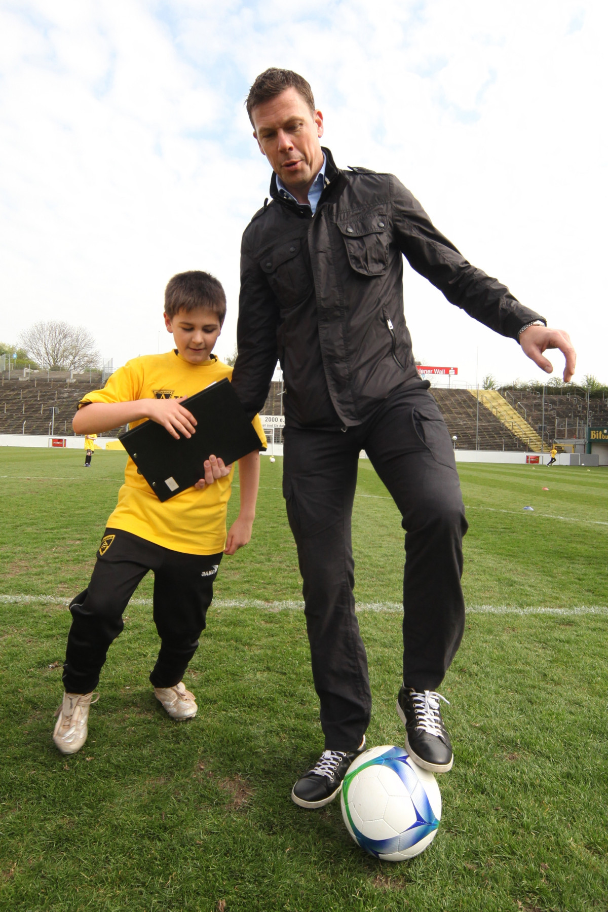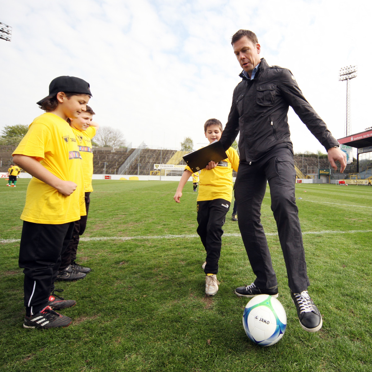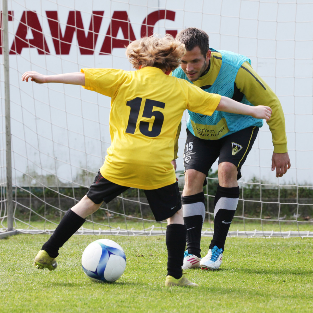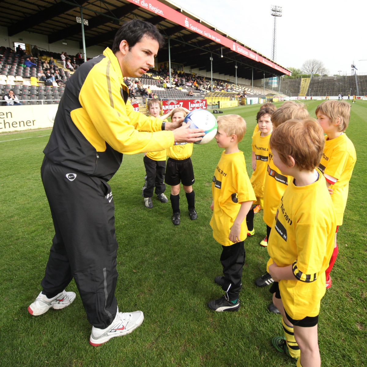 Apropos David Hohs, Marco Höger und Co: Der Besuch einiger Profis sorgte bei den jungen Talenten für die besondere Motivation. Benny Auer, Manuel Junglas, Tobias Feisthammel und Hohs statteten den Kids schon vor dem Profi-Training einen Besuch ab, bei dem Junglas es sich nicht nehmen ließ, selbst am Technikparcours teilzunehmen. Der Tatendrang des Mittelfeldspielers wurde von drei seiner Kollegen noch überboten: Am Mittag stiegen Timo Achenbach, Kevin Kratz und Marco Höger voll ein und trainierten mit den restlos begeisterten Kindern. Für die Teilnehmer war das ein wahres Highlight, denn wer kann schon von sich behaupten, zusammen mit Alemannias Stammspielern gekickt zu haben? Doch damit nicht genug: Während Maskottchen Al-Aix für gute Laune sorgte, hatte Sportdirektor Erik Meijer noch den einen oder anderen Tipp im Gepäck: „Das Wichtigste ist, dass ihr den Spaß beibehaltet. Wenn ihr Spaß am Spiel habt, kommt der Rest von ganz alleine“, riet Meijer den jungen Fußballern ein.