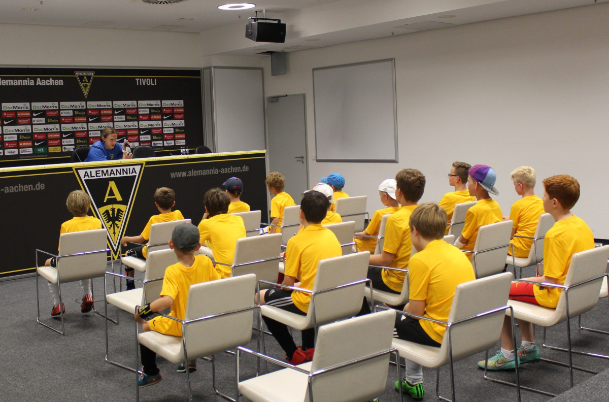 Angepasst an die Hitze hatten Trainer Sven Schaffrath und sein Team ein interessantes Programm auf die Beine gestellt. Neben den täglich zwei Trainingseinheiten auf dem Platz, bei denen die Nachwuchskicker zahlreiche Tricks und Kniffe lernten, rundeten eine exklusive Stadionführung, eine Pressekonferenz sowie ein Besuch des Trainings der Alemannia-Profis das erste Camp ab. Auch Profi-Torwart Frederic Löhe nahm sich Zeit für die Kids plauderte nach einer gemeinsamen Übungsstunde aus dem Nähkästchen.