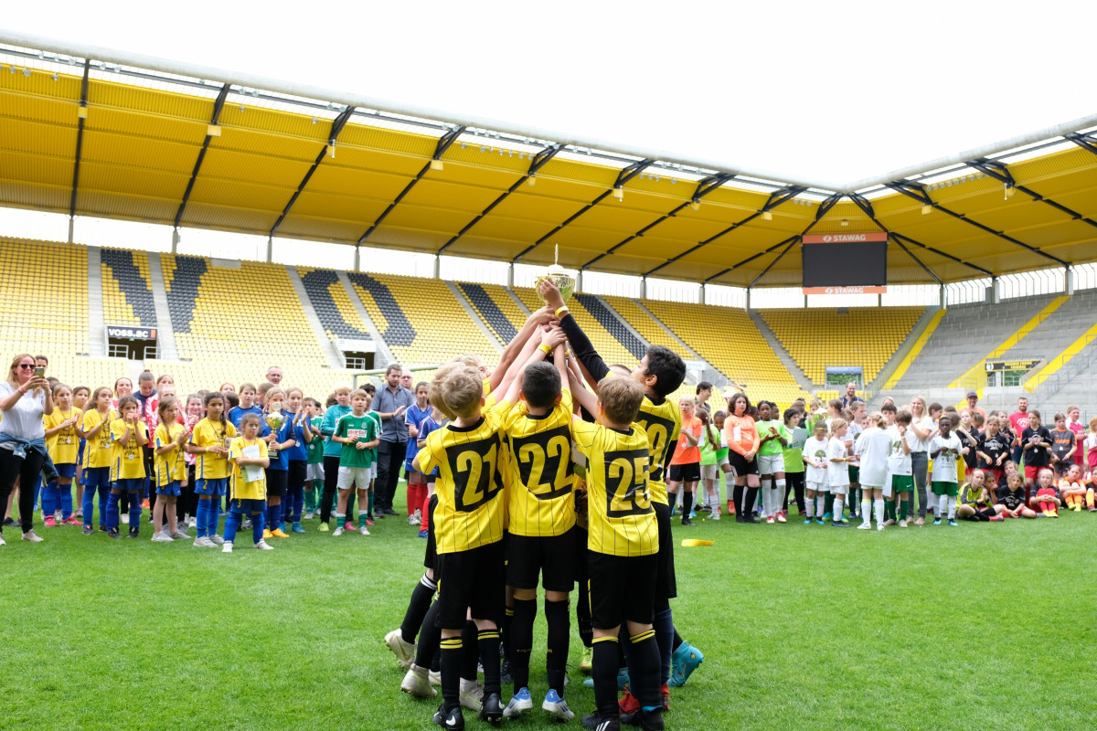 Neben allerhand Fußball – die Spiele wurden bei strahlendem Sonnenschein auf dem Trainingsplatz des Parkhausdachs und auf dem Rasen des Tivoli selbst ausgetragen – bot sich für die Nachwuchskickerinnen und -kicker ein buntes Rahmenprogramm. Dies beinhaltete unter anderem aufregende Stadionführungen durch das weite Rund und die Möglichkeit, das DFB-Fußballabzeichen abzulegen.