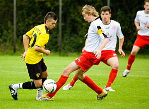 Die Schwarz-Gelben Nachwuchskicker kamen sehr gut in die Partie und Marvin Schmidt hätte bereits in der 3. Minute den Führungstreffer erzielen könne. Der 16-Jährige spielte den Ball aber ab, anstatt selber den Abschluss zu suchen. In der 13. Minute machte er es besser: Erst erkämpfte er sich den Ball, um ihn dann uneigennützig auf Leonhard Schäfer abzulegen, der das 1:0 erzielte. Zwei Minuten später musste der Düsseldorfer Fazliu wegen Unsportlichkeit den Platz verlassen. Die Aachener konnten ihren zusätzlichen Freiraum jedoch nicht lange ausnutzen, da der Torschütze zum Führungstreffer, Leonhard Schäfer, ebenfalls vom Schiedsrichter vorzeitig unter die Dusche geschickt wurde. Auch beim Spiel zehn gegen zehn war es die Alemannia, die das Spiel machte. So schraubte die Birk-Elf das Ergebnis in der 32. Minute auf 2:0 rauf. Torschütze des zweiten Treffers war Marvin Schmidt.