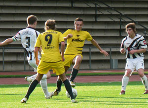 In beiden Fällen war es Manuel Junglas, der den Führungstreffer verpasste: Zuerst zielte der Angreifer knapp am Gladbacher Gehäuse vorbei (5.), kurze Zeit später scheiterte er an Borussen-Keeper Schmadtke (9.). Der Gastgeber präsentierte sich hingegen wesentlich treffsicherer: Nach einem Freistoß lauerte Jantschke am zweiten Pfosten und er erzielte das 1:0 für sein Team (15.). Der Rückstand brachte die Schwarz-Gelben nicht aus dem Konzept und sie versuchten mit aller Kraft den Rückstand umzubiegen. Genau das sollte ihnen jedoch zum Verhängnis werden: Nach einem Ballverlust im Mittelfeld schalteten die Gladbacher blitzschnell auf Konter um und Bäcker markierte nach rund einer halben Stunde den zweiten Treffer. Da in der Folgezeit auf beiden Seiten nicht mehr viel passierte, ging es mit dem 0:2 in die Kabine.
