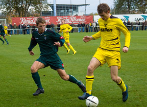 Schon in der Anfangsphase merkte man beiden Teams an, dass sie auf Sieg spielten. Weder die Alemannen, noch die Borussen versteckten sich, so dass sich ein offener Schlagabtausch entwickelte. Nach einigen kleineren Chancen setzte der Aachener Nachwuchs in der 23. Minute das erste Ausrufezeichen: Da die Gladbacher den Ball nicht aus dem Sechzehner klären konnten, kam Lewis Holtby an den Ball und erzielte das 1:0. Die Gäste steckten nicht auf und erzielten postwendend den Ausgleich: Nach einer Ecke erzielte Schumacher das 1:1 per Kopf (25.). Auch in der Folgezeit ging es ähnlich munter weiter und noch vor dem Ende der ersten Halbzeit fiel der nächste Treffer: Nachdem Manuel Junglas nach einem schönen Konter nur den Pfosten getroffen hatte, schnappten sich die Borussen den Ball und machten es besser. Bäcker erzielte den 1:2-Halbzeitstand aus Sicht der Schwarz-Gelben (42.).
