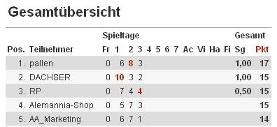 Der Zwischenstand der TOP 5 nach dem 1. Spieltag lautet wie folgt: