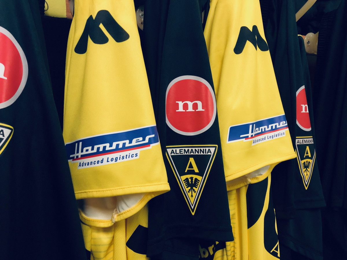 Ab sofort trägt die Alemannia das Logistikunternehmen „Hammer – Advanced Logistics“ auf dem Trikotärmel und „Martello Immobilien-Management“ auf der Spielhose. Erstmals in dieser Spielzeit erlaubt der Westdeutsche Fußballverband, dass die Spielhose der Regionalliga West-Vereine mit einem Sponsor versehen werden dürfen. Die beiden Logos auf Ärmel und Hose prangen bereits am kommenden Samstag im ersten Heimspiel der Saison 19/20 gegen Fortuna Düsseldorf U23 auf Trikot und Hose unserer 1. Mannschaft. In Ergänzung zu dem schon vorhandenen Engagement werden beide Partner zudem fortan als Euregio-Partner geführt.