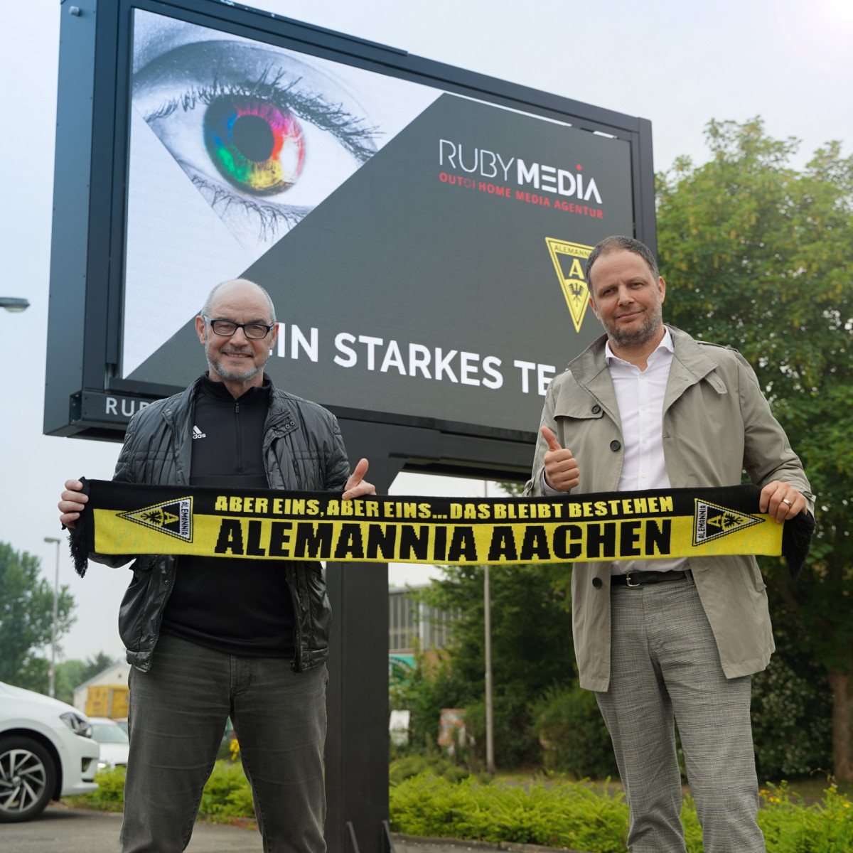 Rubymedia bietet seit rund einem Jahr großformatige LED Videowände in der Städteregion an. „Neben dem Standort an der Roermonder Straße gehen wir in diesem Jahr mit zwei weiteren Werbetafeln in Würselen und Eschweiler on Air“, sagt Markus Jussen, Geschäftsführer der Rubymedia GmbH. „Unsere Videowände bieten Dank moderner Technik große Gestaltungsspielräume für kreative und aufmerksamkeitsstärke Werbekampagnen.“ Das Engagement bei Alemannia Aachen ist für Jussen eine Herzensangelegenheit. „Als echter Öcher und weltoffener Lokalpatriot ist es mir ein Anliegen, speziell Aachener Vereinen, Unternehmen und Einzelhändlern attraktive Werbemöglichkeiten anzubieten.“ Da passt die Zusammenarbeit mit Alemannia genau in das Firmenkonzept. „Wir unterstützen sportliche, soziale sowie kulturelle Projekte und stellen dafür 20 Prozent unserer Spots zur Verfügung“, so Jussen, der Hans-Peter Lipka in seiner neuen Funktion als Geschäftsführer alles Gute und der Alemannia eine erfolgreiche Saison 2020/2021 wünscht.
