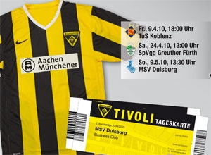 Das „VIP-Tricket“ ist bereits zum Spiel gegen die TuS Koblenz (Freitag, 9. April 2010) erhältlich. Ein entsprechendes Bestellformular kann per Anfrage über www.alemannia-aachen.de/tivoli/business-seats angefordert werden. Gerne beraten wir Sie unter 01805-018011 über unsere Hotline (14 Cent pro Minute aus dem dt. Festnetz, Mobilfunkpreis maximal 42 ct./min.). Dieses exklusive Angebot gilt nur solange der Vorrat reicht.