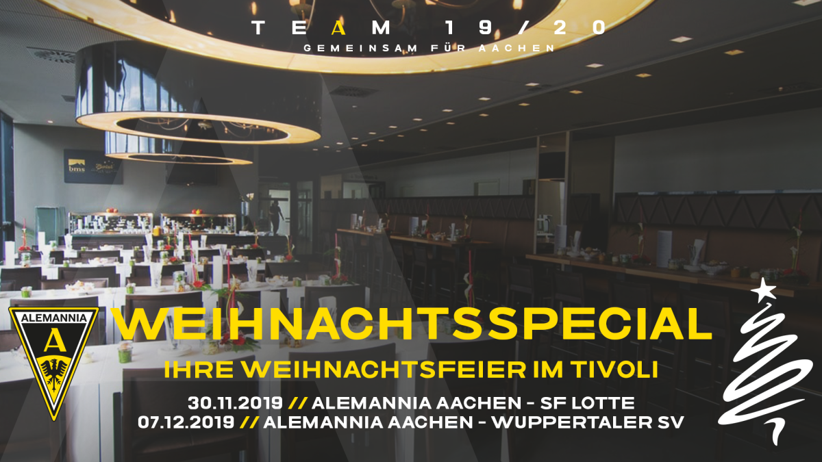 Diese Möglichkeit möchten wir Ihnen in unseren Business-Räumlichkeiten bei exklusivem Catering und spannendem Regionalliga-Fußball bieten. Zu den Heimspielen gegen die Sportfreunde aus Lotte (30.11.2019) und den Wuppertaler SV (07.12.2019) möchten wir Ihnen mögliche Weihnachtsfeiern im Business-Bereich für 130,00 € (zzgl. MwSt.) und im Logen-Bereich für 150,00 € (zzgl. MwSt.) pro Person anbieten.