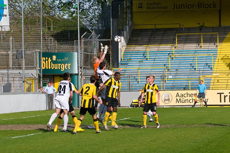 Fünf Minuten nach dem Seitenwechsel klingelte es nach einer weiteren Standardsituation wieder im Aachener Kasten. Dehnen zielte einen Freistoß aus 25 Metern ins rechte Eck, Krumpen lenkte das Leder zwar noch an den rechten Innenpfosten, der das Leder jedoch auch diesmal über die Linie lenkte – 1:2 (50.). Die Alemannia zeigte sich in der Folgezeit bemüht, hatte aber außer einem Kopfball von Schattner (59.) zunächst nichts entgegenzusetzen. Das sollte sich in der Schlussphase nach der Hereinnahme von Faton Popova ändern. Neun Minuten vor dem Ende zirkelte der Mittelfeldakteur einen Freistoß aus 20 Metern über die Mauer hinweg zum Ausgleich ins linke Eck (81.). Da Sendag eine Minute später die Ampelkarte sah, drängten die jungen Alemannen in Überzahl sogar noch auf den Sieg. Eine Freistoßflanke von Popova wurde länger und länger und prallte ans Lattenkreuz (84.). Zwei Minuten vor dem Ende kam Muhovic nach einer scharfen Hereingabe von Popova eine Fußspitze zu spät und als Tim Krumpen in der Nachspielzeit aus der eigenen Hälfte noch einen Freistoß in Richtung des voll versammelten Klever Strafraums schoss, beendete der Schiedsrichter zur allgemeinen Verwunderung kurzerhand die Partie.