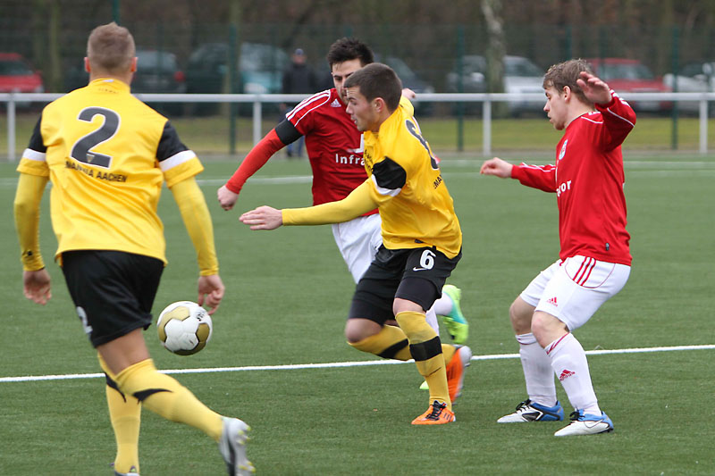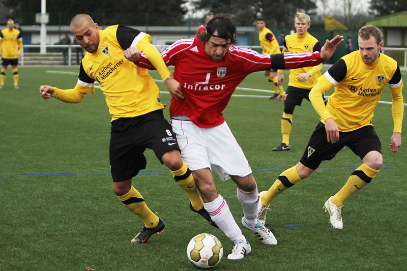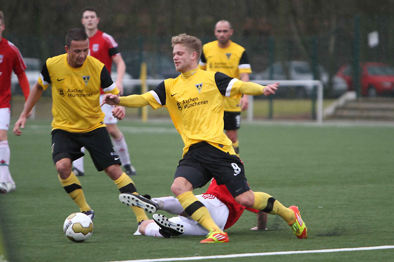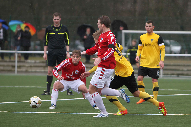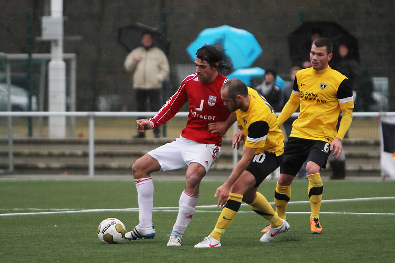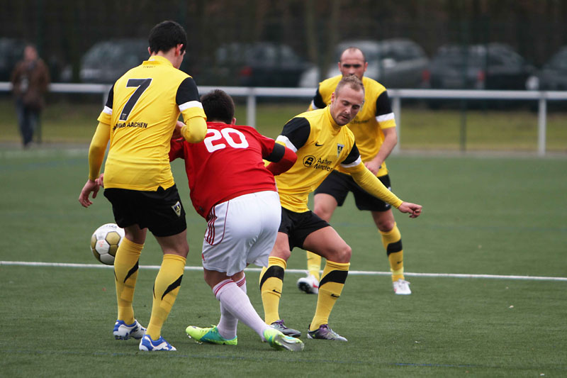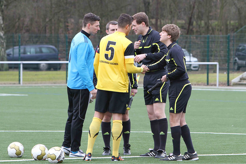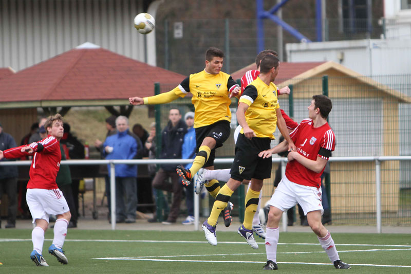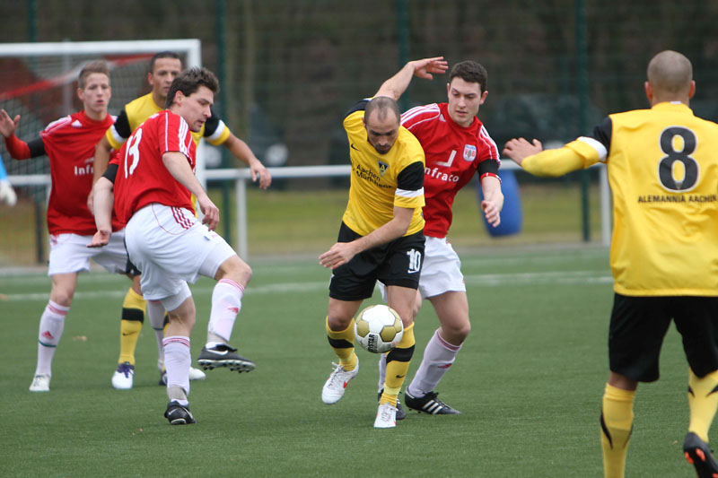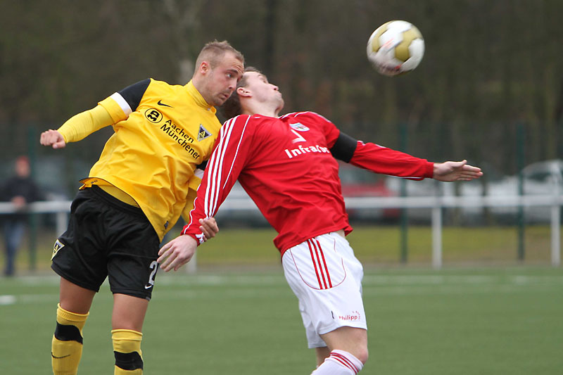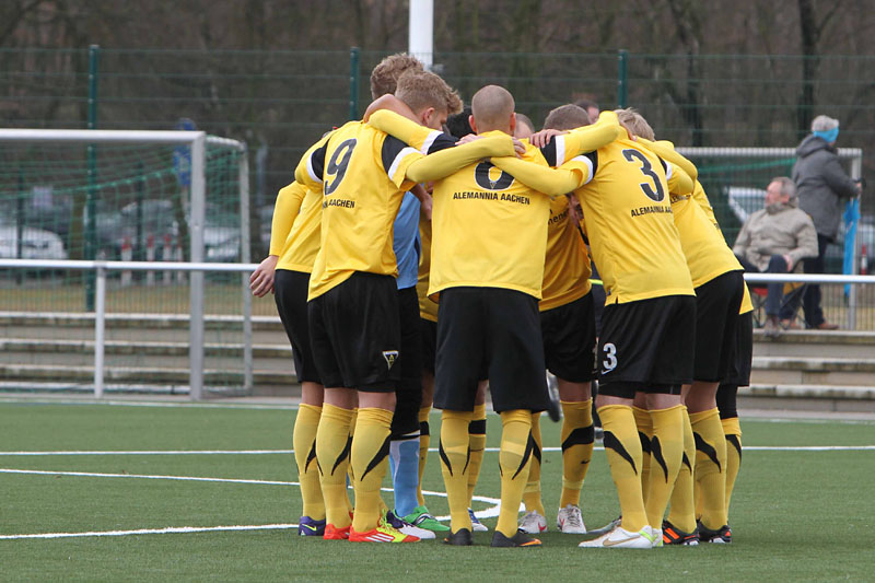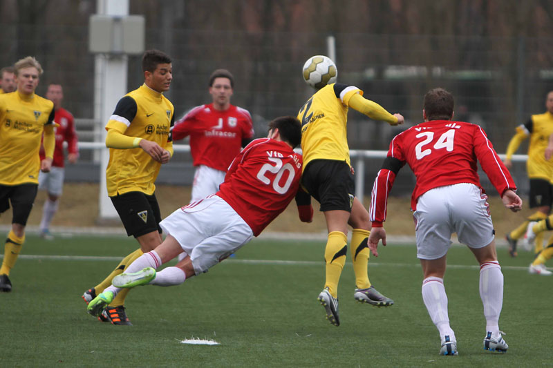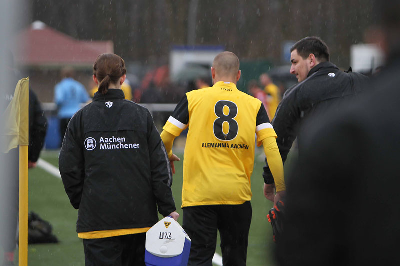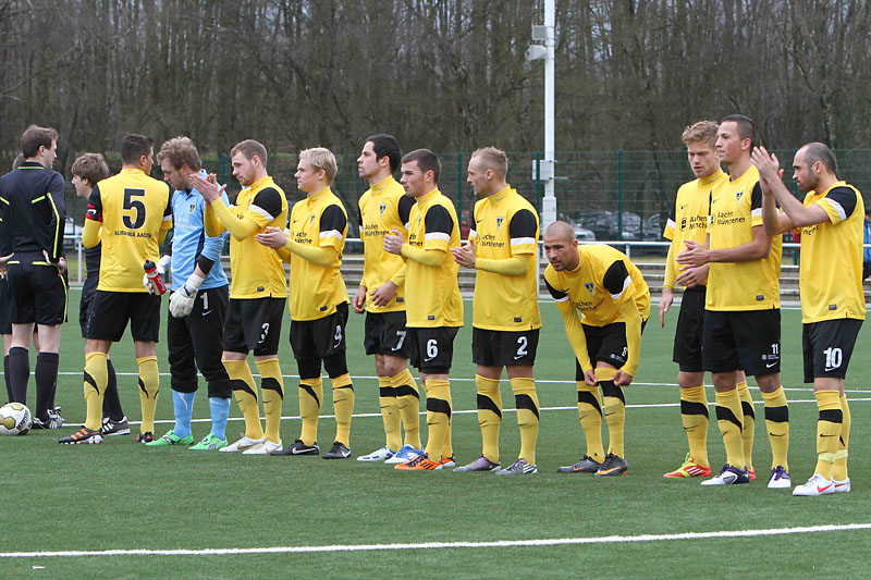 Bereits am Tag vor dem Spiel ereilte Trainer Ralf Aussem eine neue Hiobsbotschaft. Nach der Fuß-OP von Top-Torjäger Daniel Engelbrecht verletzte sich auch Mittelfeldstratege Marc Beckert im Training schwer, und die Untersuchungen am Freitag ergaben einen Bruch des Wadenbeins sowie einen Riss des Syndesmosebandes. Auch Narciso Lubasa (Muskelfaserriss) meldete sich kurzfristig ab. Immerhin kamen mit David Hohs, Andreas Korte und Bilal Cubukcu drei Akteure aus dem Profikader zum Einsatz. Nach gut 20 Minuten Spielzeit gab es den nächsten Rückschlag für die junge Aachener Elf, als Winterneuzugang Raimund Schmitz mit Oberschenkelproblemen vom Feld musste. In einer ereignisarmen ersten Hälfte hatten die kompakt agierenden Schwarz-Gelben eine Minute vor der Pause nur eine Schrecksekunde zu überstehen, als VfB-Stürmer Erwig den Ball bereits über den herauseilenden Hohs gelupft hatte und Wilschrey in höchster Not noch vor der Linie retten konnte.