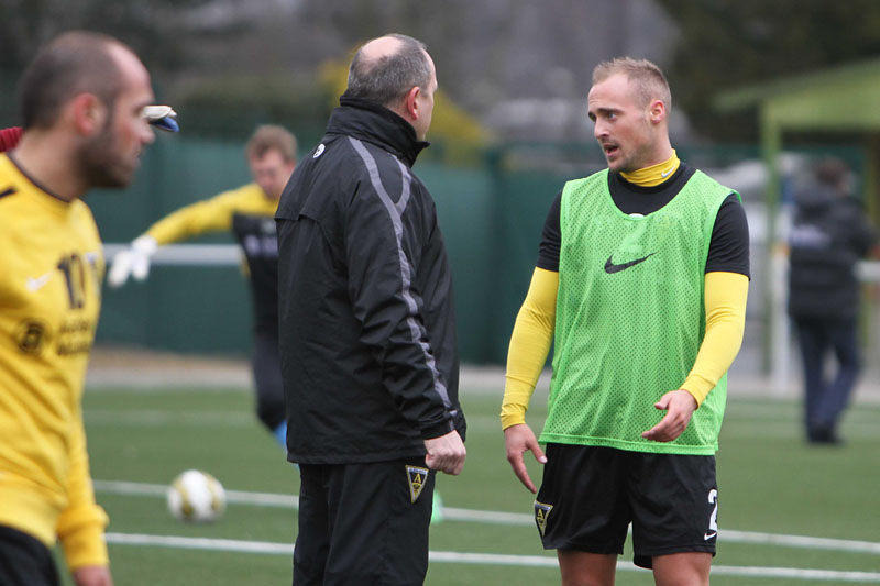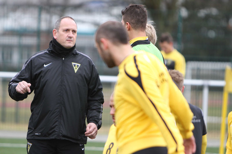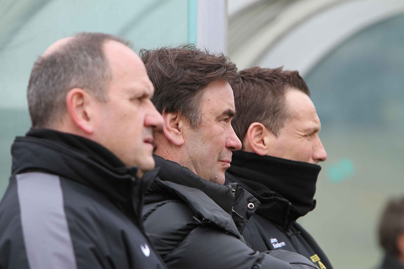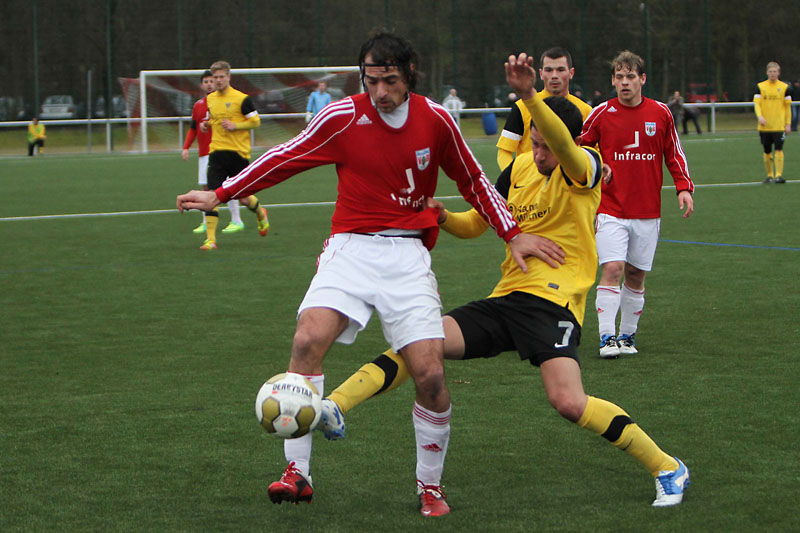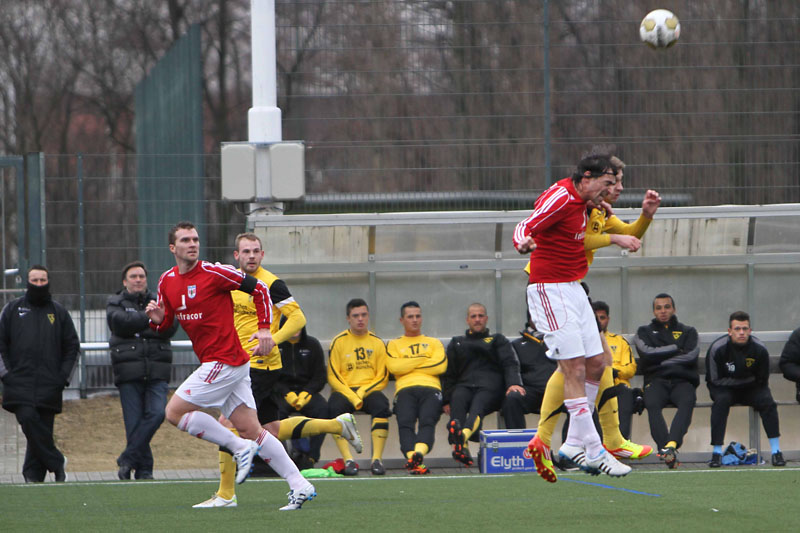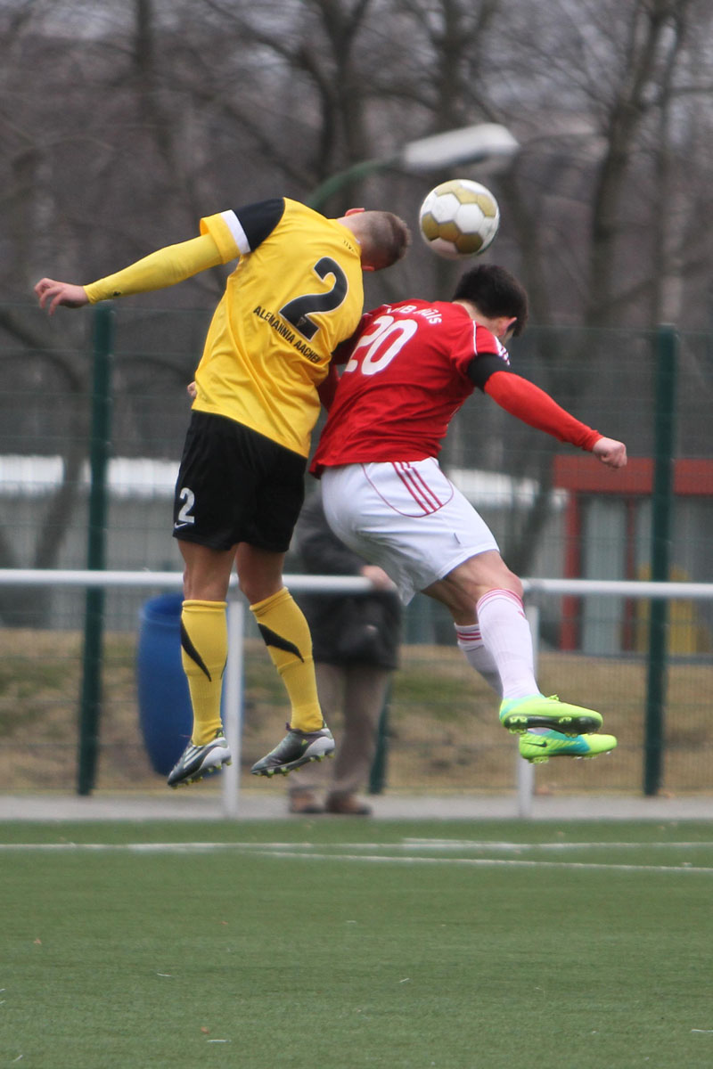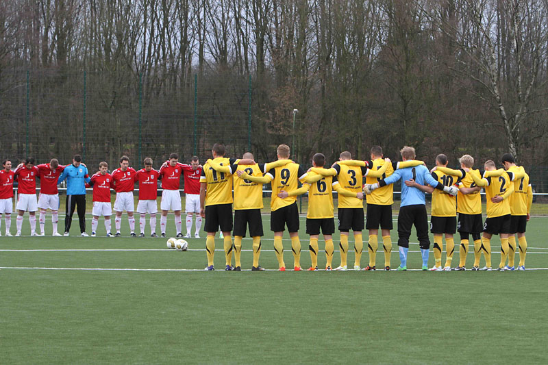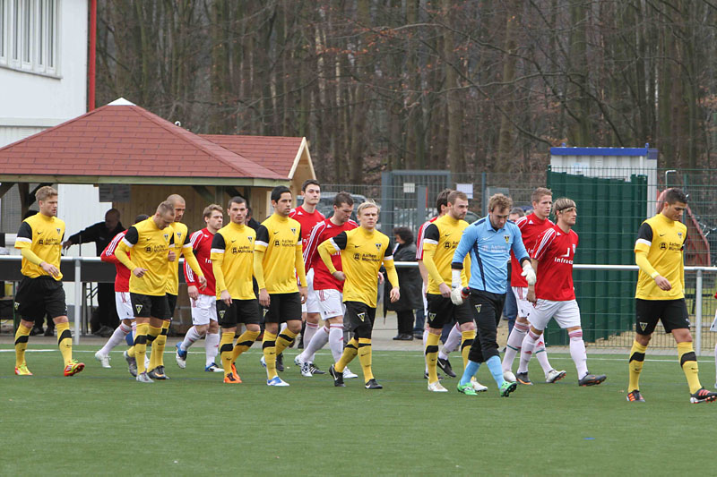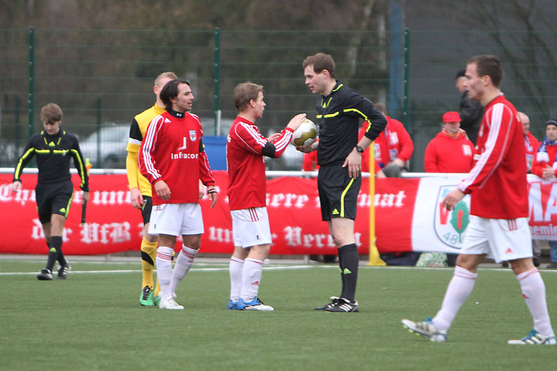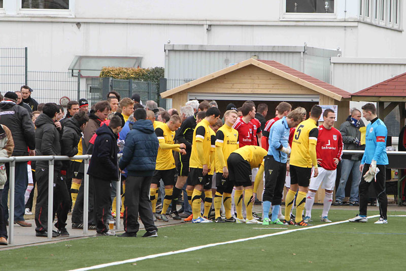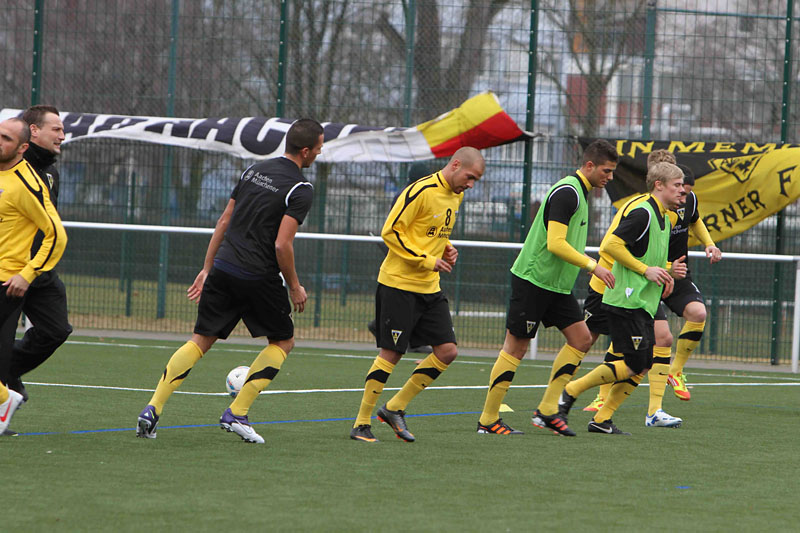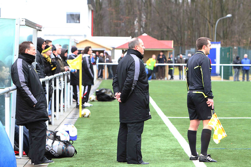 Bereits am Tag vor dem Spiel ereilte Trainer Ralf Aussem eine neue Hiobsbotschaft. Nach der Fuß-OP von Top-Torjäger Daniel Engelbrecht verletzte sich auch Mittelfeldstratege Marc Beckert im Training schwer, und die Untersuchungen am Freitag ergaben einen Bruch des Wadenbeins sowie einen Riss des Syndesmosebandes. Auch Narciso Lubasa (Muskelfaserriss) meldete sich kurzfristig ab. Immerhin kamen mit David Hohs, Andreas Korte und Bilal Cubukcu drei Akteure aus dem Profikader zum Einsatz. Nach gut 20 Minuten Spielzeit gab es den nächsten Rückschlag für die junge Aachener Elf, als Winterneuzugang Raimund Schmitz mit Oberschenkelproblemen vom Feld musste. In einer ereignisarmen ersten Hälfte hatten die kompakt agierenden Schwarz-Gelben eine Minute vor der Pause nur eine Schrecksekunde zu überstehen, als VfB-Stürmer Erwig den Ball bereits über den herauseilenden Hohs gelupft hatte und Wilschrey in höchster Not noch vor der Linie retten konnte.