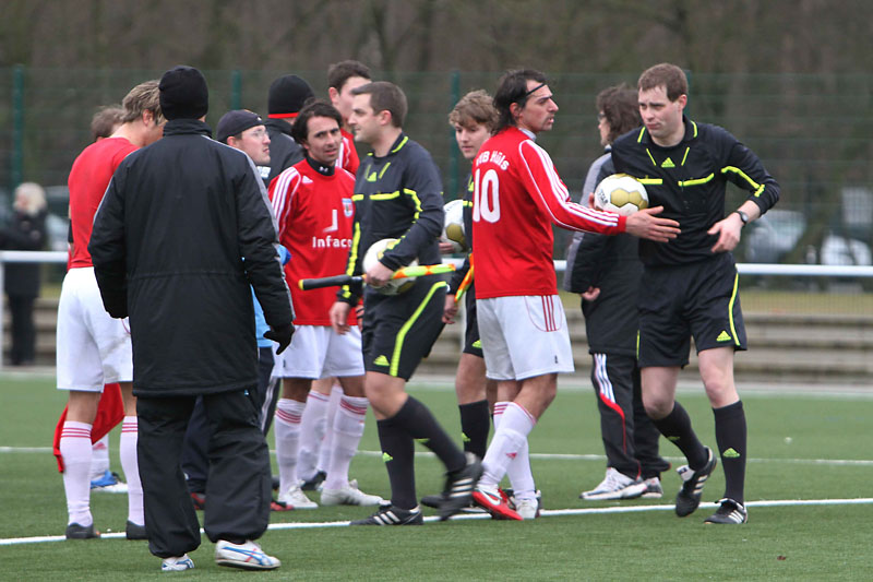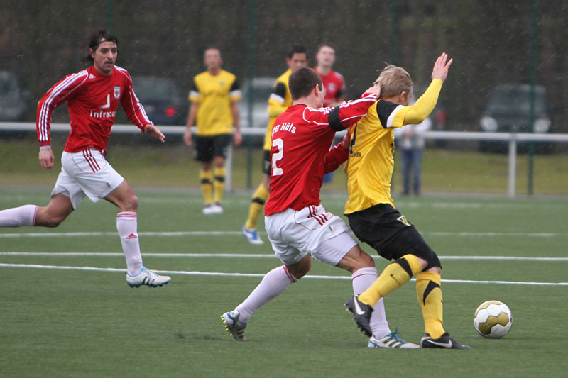 Nach dem Seitenwechsel meldeten sich die Tivoli-Kicker auch in der Offensive zu Wort. Eine Rechtsflanke von Wilschrey köpfte Pozder wenig druckvoll in die Arme von Keeper Rantzow (54.). Drei Minuten später hatte der Sturmführer die beste Aachener Gelegenheit, als er eine Hereingabe von Philippe mit der Brust annahm und die Kugel dann aus der Drehung knapp über die Querlatte jagte (57.). Zwölf Minuten vor dem Ende musste Andreas Korte nach einem Schlag auf den Knöchel ebenfalls noch verletzt vom Feld. Als nach einem rüden Einsteigen des Hülsers Erwig auch noch die Gesundheit des eingewechselten Mostowfi auf dem Spiel stand, zückte Schiri Gropengießer kurz vor dem Ende noch die rote Karte (86.).