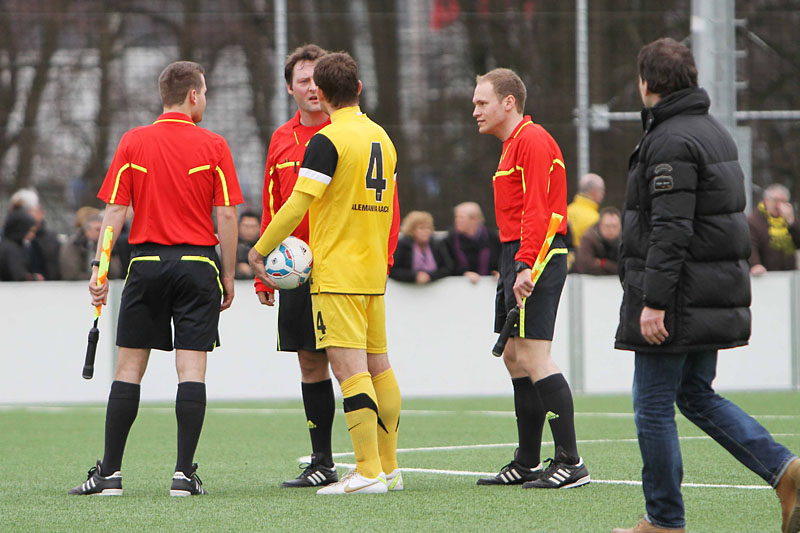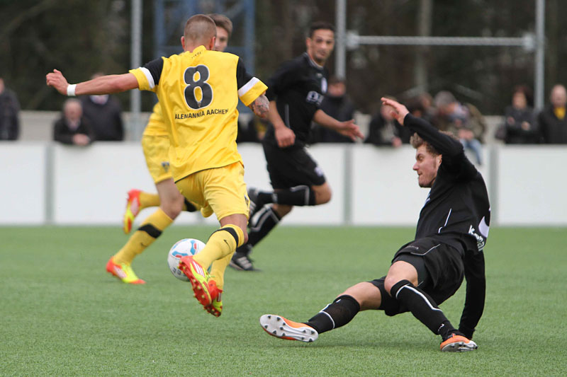 Der Sonntagnachmittag hätte bei frühlingshaften Temperaturen um einiges entspannter verlaufen können, wenn Marquet nach dem Seitenwechsel das dritte Tor erzielt hätte. Der Ex-Leverkusener, der in der Vorwoche noch dreimal erfolgreich war, scheiterte jedoch freistehend an Carpentier (54.). Und so stemmten die Gäste aus dem Duisburger Stadtteil sich nochmal energisch gegen die Niederlage. Der eingewechselte Bougjdi tauchte frei vor Krumpen auf, doch der Aachener Schlussmann reagierte stark (66.). Drei Minuten später fand auch Sogolj mit einem wuchtigen Kopfball in Krumpen seinen Meister (69.). „Wenn wir in dieser Phase ein Gegentor kassiert hätten, wäre es nochmal richtig eng geworden“, ärgerte sich Ralf Aussem später über die kurzzeitigen Nachlässigkeiten seiner Truppe. Als Hadouir dreizehn Minuten vor dem Ende eine Ecke auf den Kopf von Frau zirkelte, war die Partie entschieden. Zwar scheiterte der Innenverteidiger zunächst noch an Carpentier, im Nachsetzen jedoch sicherte er seinen ersten „Doppelpack“ im Alemannia-Dress zum 3:0 (77.). In der Nachspielzeit legte Lekesiz gegen die resignierenden Gäste sogar noch das 4:0 nach (90. +3.).