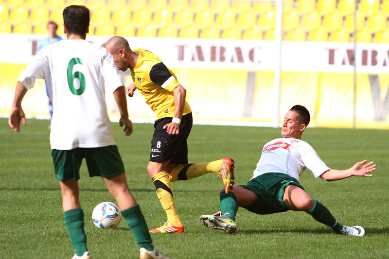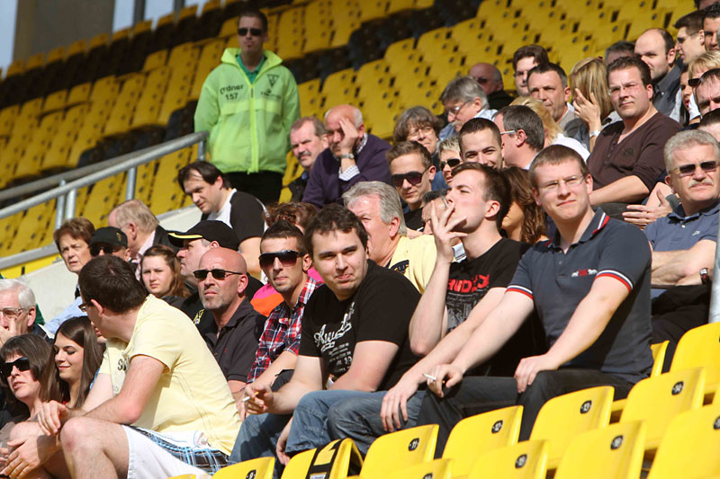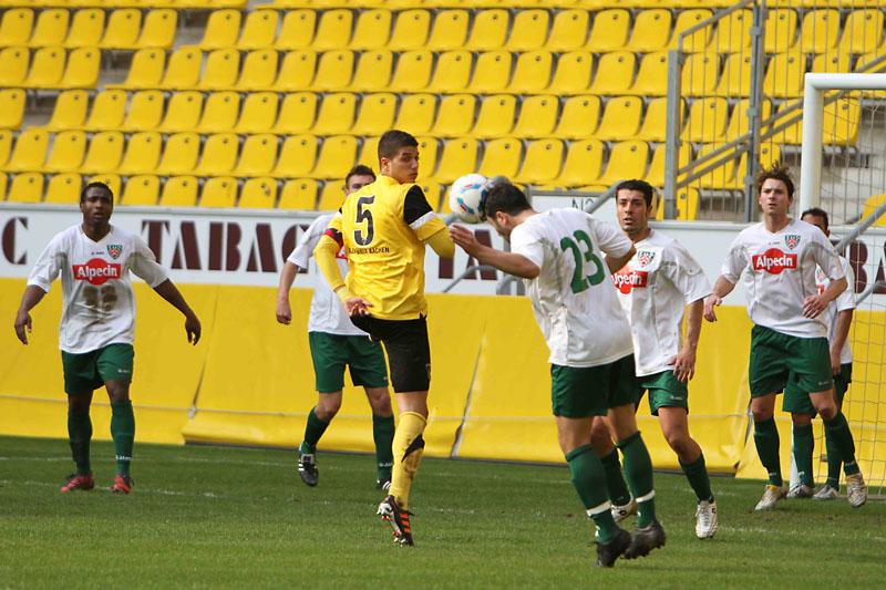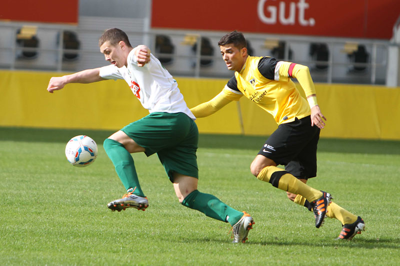 Abstellungen aus dem Profikader fielen mit David Hohs und Marco Stiepermann diesmal übersichtlicher aus, als in den Wochen zuvor. Nachdem sich beide Teams bei frühsommerlichen Temperaturen eine gute Viertelstunde beschnupperten, kamen die jungen Alemannen durch den aufgerückten Linksverteidiger Hermes zu ihrer ersten Gelegenheit kamen (18.). Zwei Sololäufe von Stiepermann führten anschließend ebenfalls nicht zu einem erfolgreichen Abschluss (23., 27.). Pech hatte Sascha Marquet, der mit einem fulminanten 20-Meter-Schuss nur die Latte traf (28.). Das Tor lag in der Luft – doch es fiel nicht. Einen Kopfball von Pozder wurde noch von der Linie gekratzt (32.), ehe Gästekeeper Riemer nach einem Distanzschuss von Lubasa die letzte Möglichkeit vor der Pause vereitelte (35.).