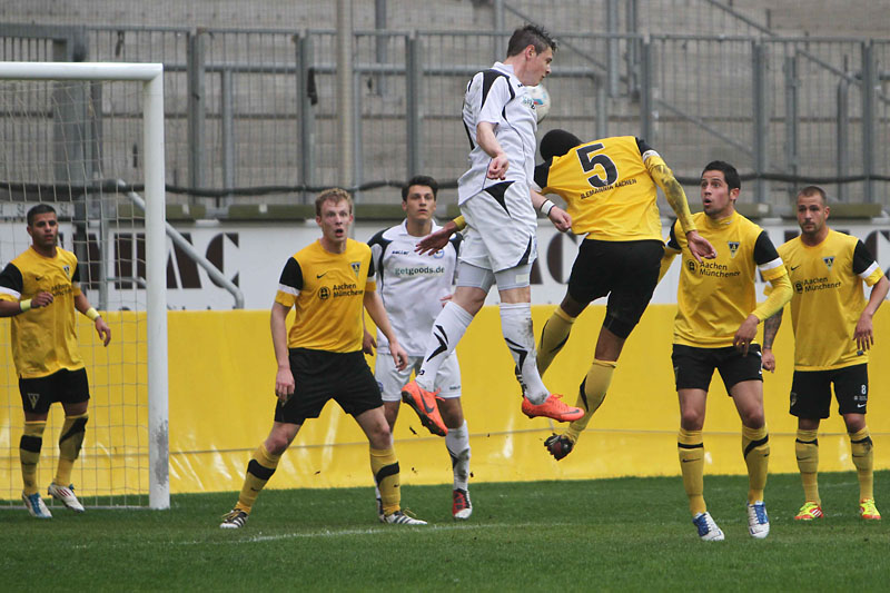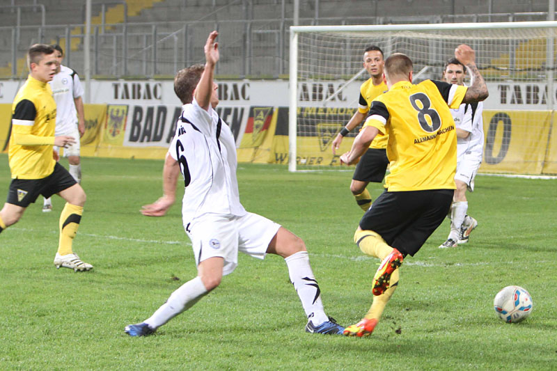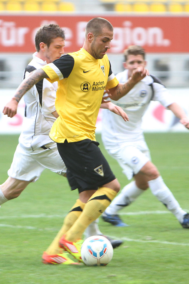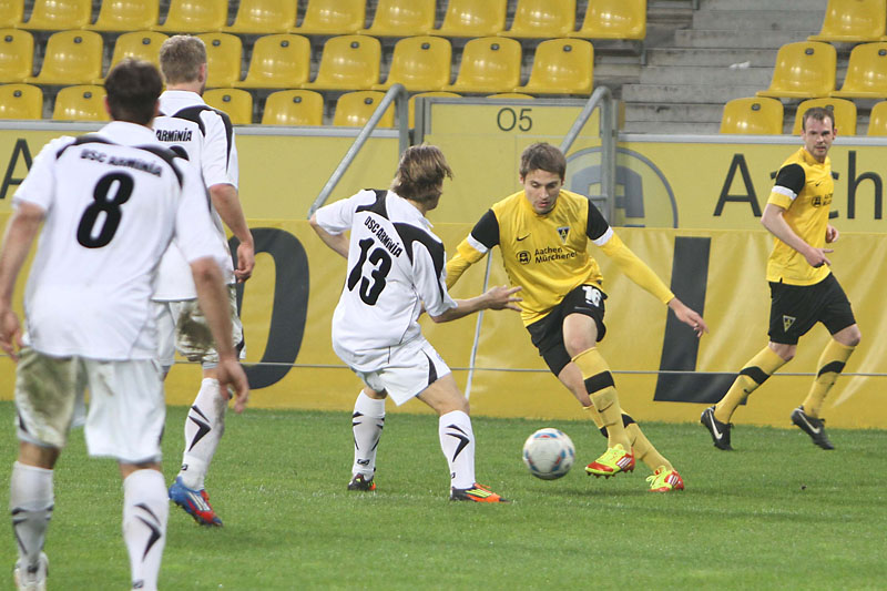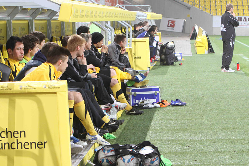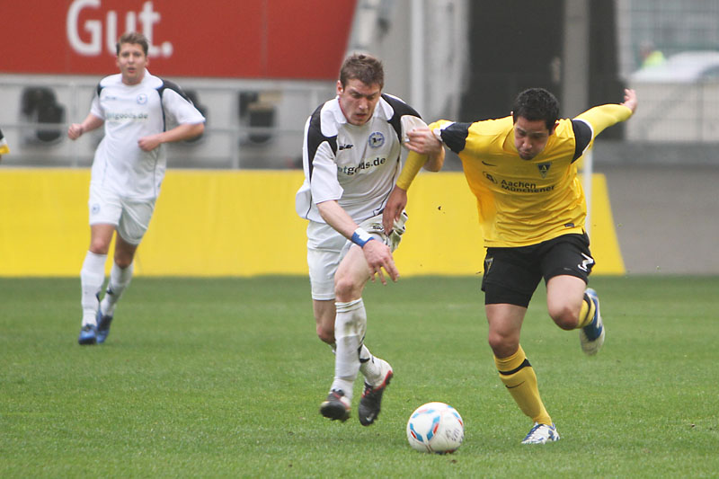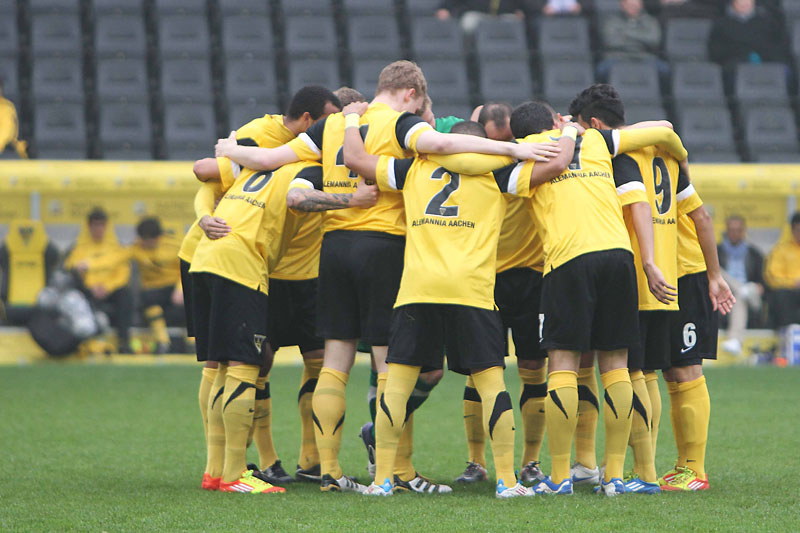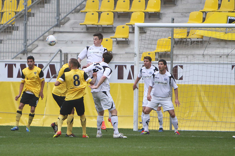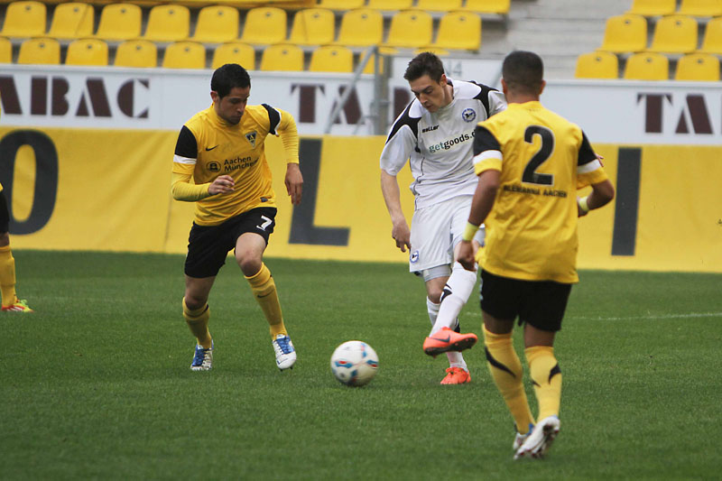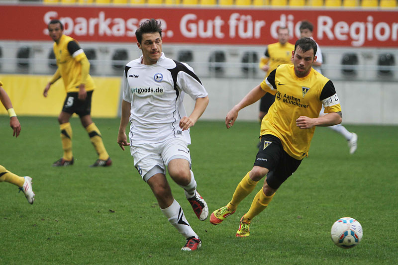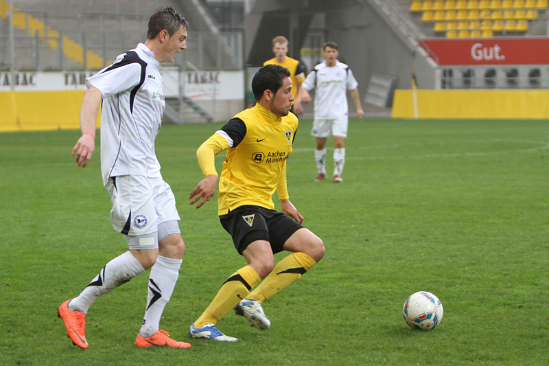 Markus Daun musste vor dem Spiel den Ausfall von nicht weniger als neun Akteuren kompensieren. So kam mit Innenverteidiger Jan-Frederick Göhsl aus der Aachener U19 bereits der 45. Spieler in dieser Saison zum Einsatz, der nach einer Rechtsecke auch die erste Gelegenheit des Spiels hatte (5.). Danach übernahmen die Gäste aus Ostwestfalen das Kommando und hatten alleine zwischen der 20. und 30. Minute vier hundertprozentige Chancen. Einzig der glänzend aufgelegte Tim Krumpen bewahrte die jungen Alemannen zur Pause vor einem deutlichen Rückstand. Mit der ersten gelungenen Offensivaktion stellten die Schwarz-Gelben den Spielverlauf Sekunden nach Wiederbeginn auf den Kopf. Andreas Korte hatte sich auf der linken Seite durchgesetzt und sein Zuspiel vollendete Denis Pozder mit seinem 17. Saisontor zum 1:0 (46.).