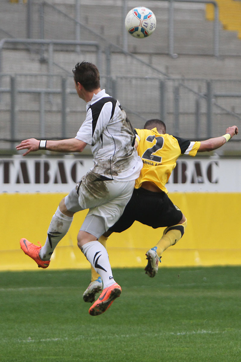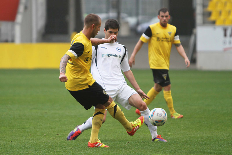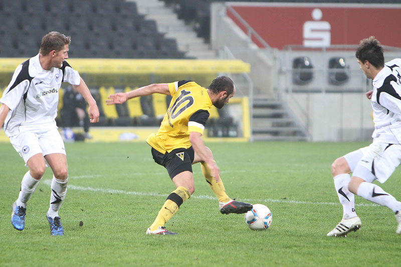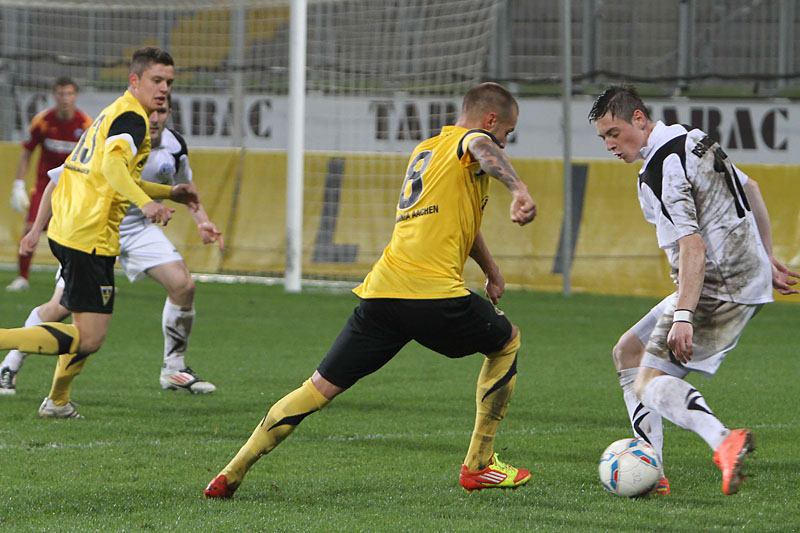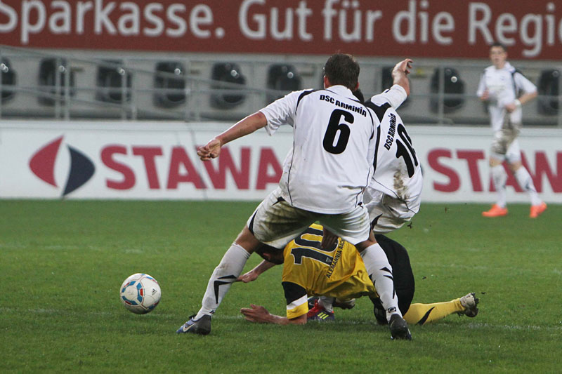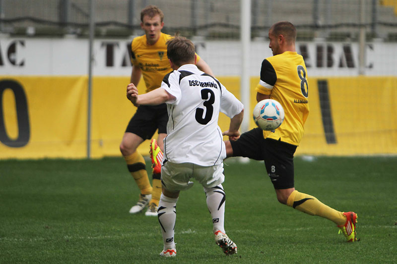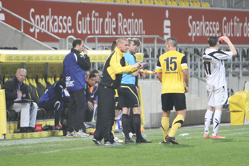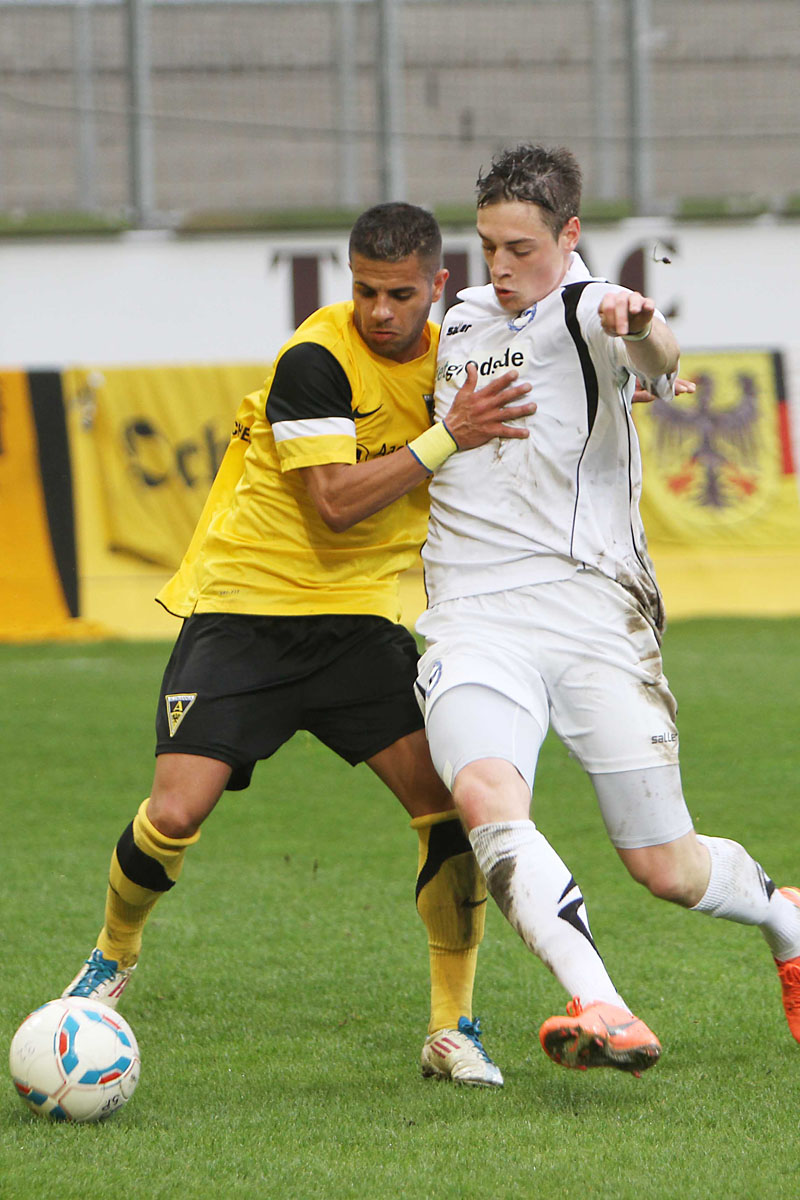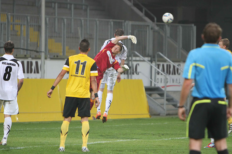 Markus Daun musste vor dem Spiel den Ausfall von nicht weniger als neun Akteuren kompensieren. So kam mit Innenverteidiger Jan-Frederick Göhsl aus der Aachener U19 bereits der 45. Spieler in dieser Saison zum Einsatz, der nach einer Rechtsecke auch die erste Gelegenheit des Spiels hatte (5.). Danach übernahmen die Gäste aus Ostwestfalen das Kommando und hatten alleine zwischen der 20. und 30. Minute vier hundertprozentige Chancen. Einzig der glänzend aufgelegte Tim Krumpen bewahrte die jungen Alemannen zur Pause vor einem deutlichen Rückstand. Mit der ersten gelungenen Offensivaktion stellten die Schwarz-Gelben den Spielverlauf Sekunden nach Wiederbeginn auf den Kopf. Andreas Korte hatte sich auf der linken Seite durchgesetzt und sein Zuspiel vollendete Denis Pozder mit seinem 17. Saisontor zum 1:0 (46.).