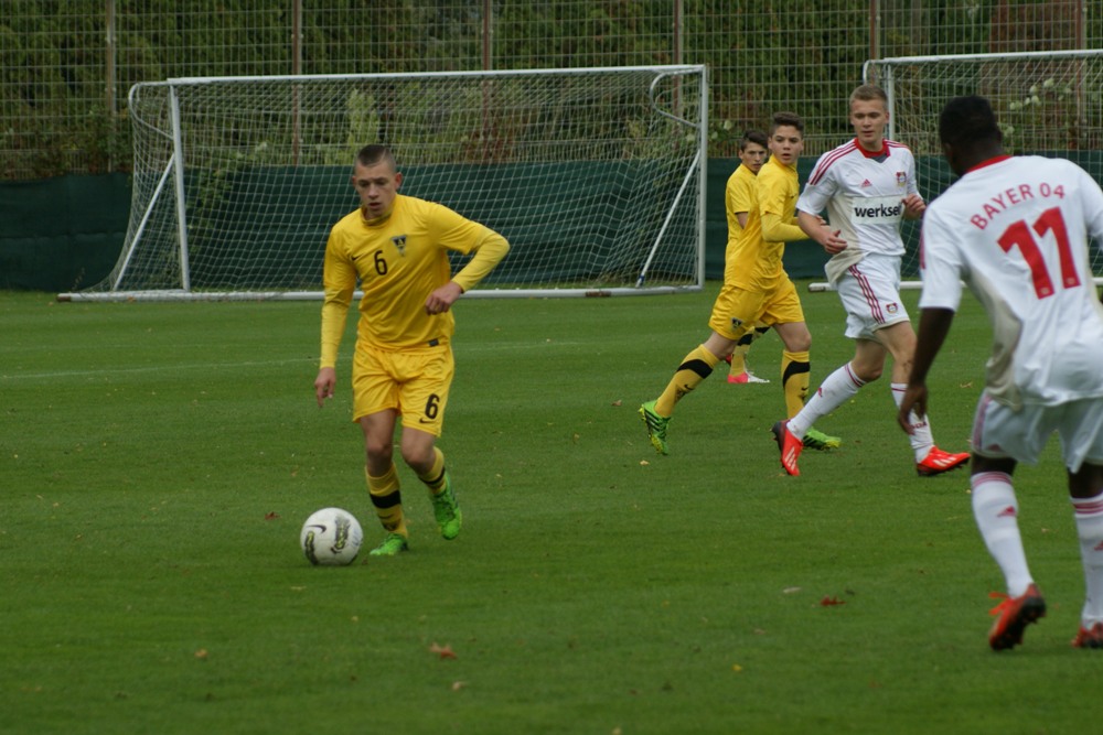 Vor 200 Zuschauern begegneten die Schwarz-Gelben dem Spitzenreiter eine gute halbe Stunde auf Augenhöhe und hatten sogar die besseren Chancen, um in Führung zu gehen. Effektiver machten es die Gäste. Nach dem 0:1 durch Pütz (34.), dem eine Unachtsamkeit bei einer Ecke vorausgegangen war, machte der Bayer-Nachwuchs dann innerhalb von sechs Minuten kurzen Prozess und legte durch Senic (35.) und Schmidt (40.) noch zwei weitere Treffer zum 0:3-Pausenstand nach.