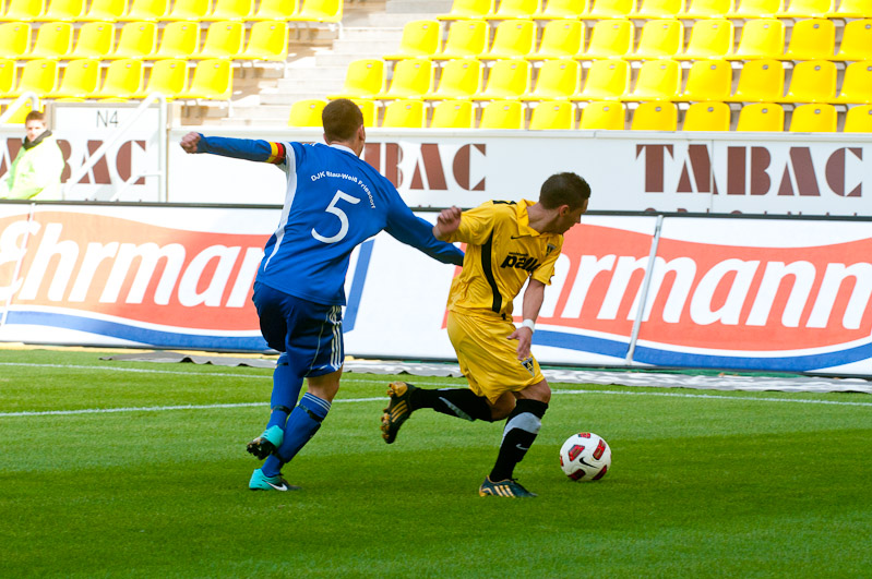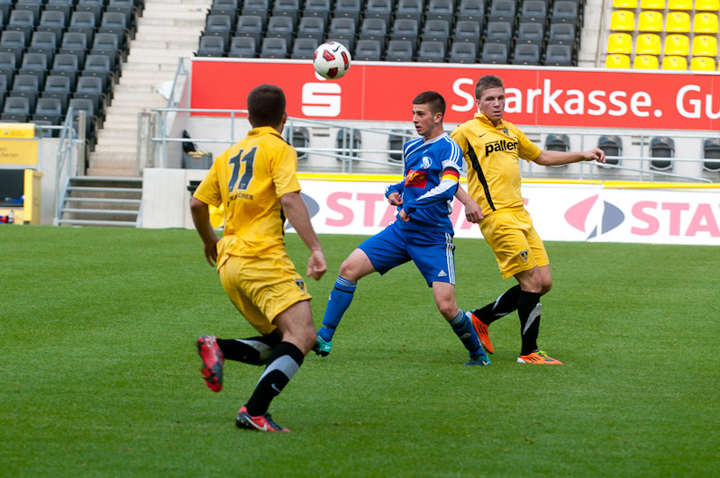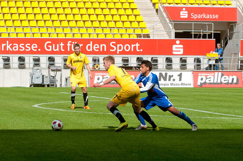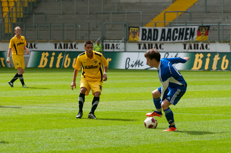 Im Hinspiel hatten sich die beiden besten Teams der Mittelrheinliga noch die Punkte geteilt, 0:0 hieß es damals nach 90 Minuten. Auch auf dem neuen Tivoli entwickelte sich am Sonntagmorgen in der Anfangsphase zunächst eine ausgeglichene Partie. Die Gäste aus Friesdorf versteckten sich nicht, klare Torchancen ergaben sich vor dem Kasten von Alemannias Keeper Mark Flekken allerdings vorerst nicht. Tim Wilden und Robert Leipertz sorgten nach knapp zehn Minuten erstmals für Gefahr, langsam aber sicher übernahmen die jungen Alemannen das Kommando. Auch wenn die Gäste nach einer Ecke an der Latte scheiterten, so lief die Partie größtenteils in eine Richtung. Özgün Günal scheiterte in der 20. Minute aus kurzer Distanz am gegnerischen Keeper, wenige Sekunden später wuchtete Alemannias Torjäger eine Ecke per Kopf zur verdienten 1:0-Führung ins Netz (20.).