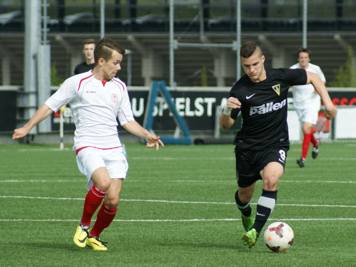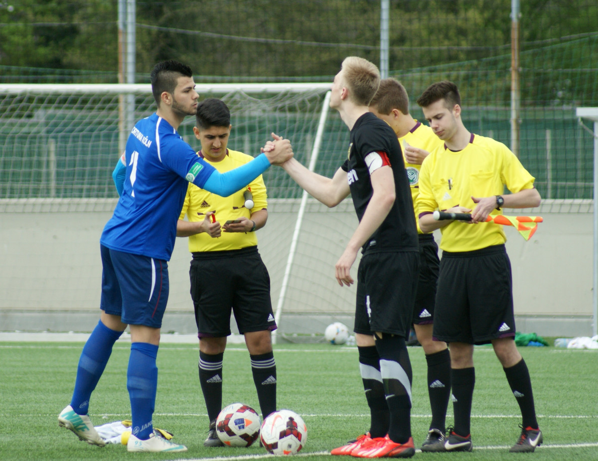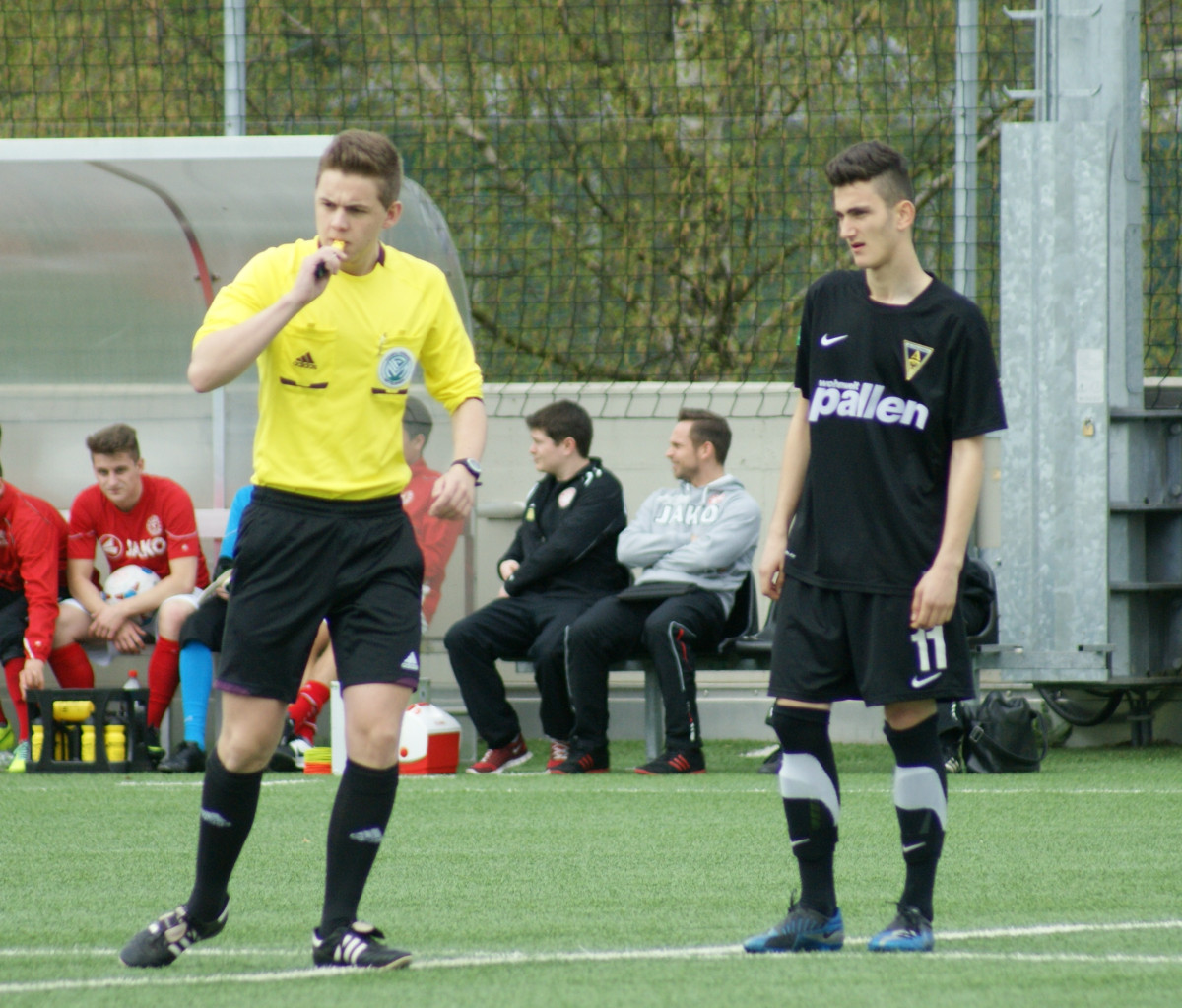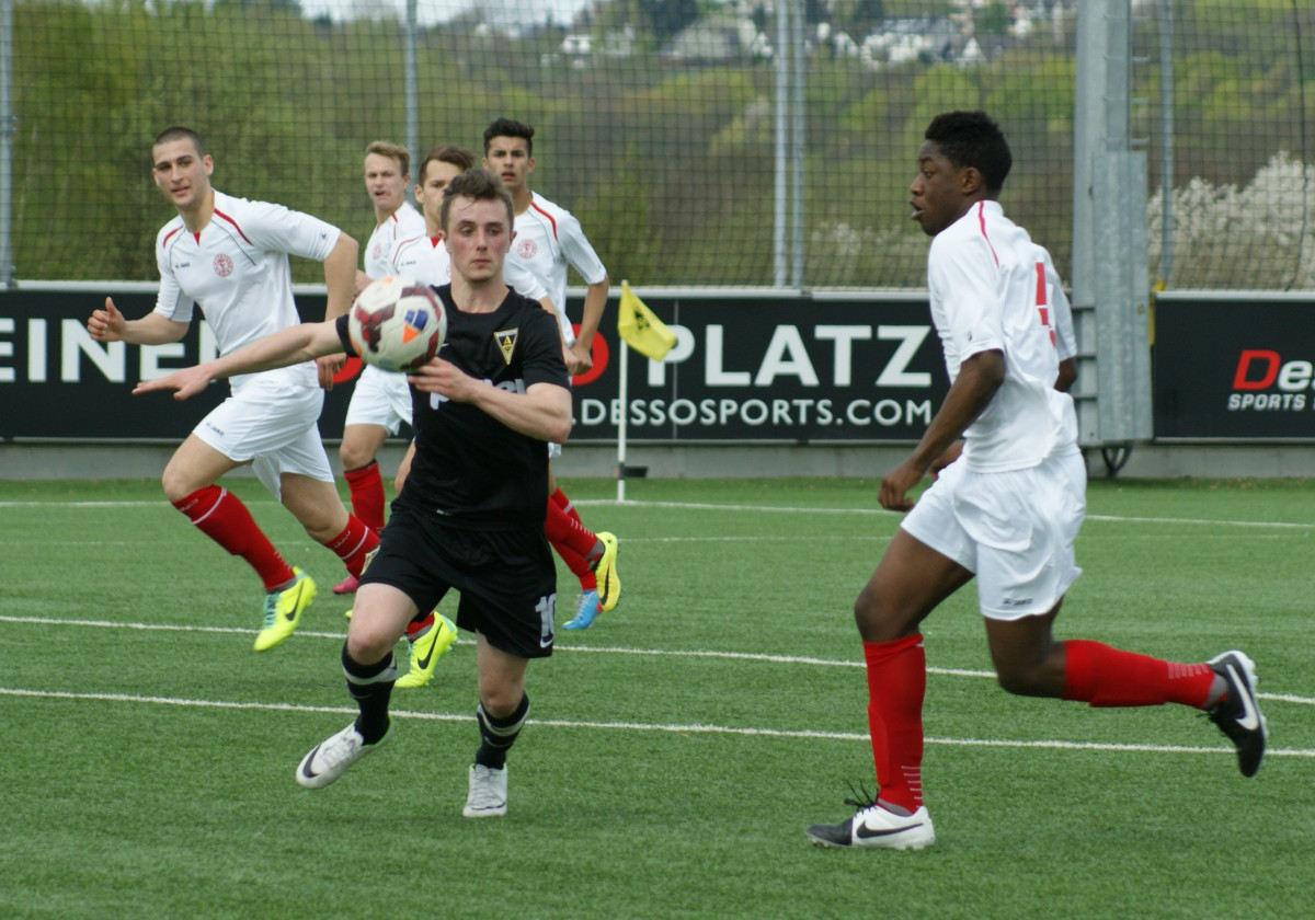Die beiden Führenden in der Tabelle, Viktoria Köln und der TSC Euskirchen, hatten bereits am Vortag vorgelegt und ihre Spiele gewonnen. Der Druck lastete am Sonntagmorgen somit bei den Tivoli-Kickern. Der Tabellenzwölfte aus der Kölner Südstadt, der den Schwarz-Gelben im Hinspiel die erste Saisonniederlage zugefügt hatte, erwischte auch diesmal den besseren Start und kam in den ersten 20 Minuten zu zwei guten Möglichkeiten. Die Aachener U19 hingegen agierte effektiv und nutze die erste Chance prompt zur Führung. Pascal Küßner schlug einen Freistoß von der linken Seite auf den kurzen Pfosten, wo Meik Kühnel mit dem Kopf zur Stelle war – 1:0 (26.).