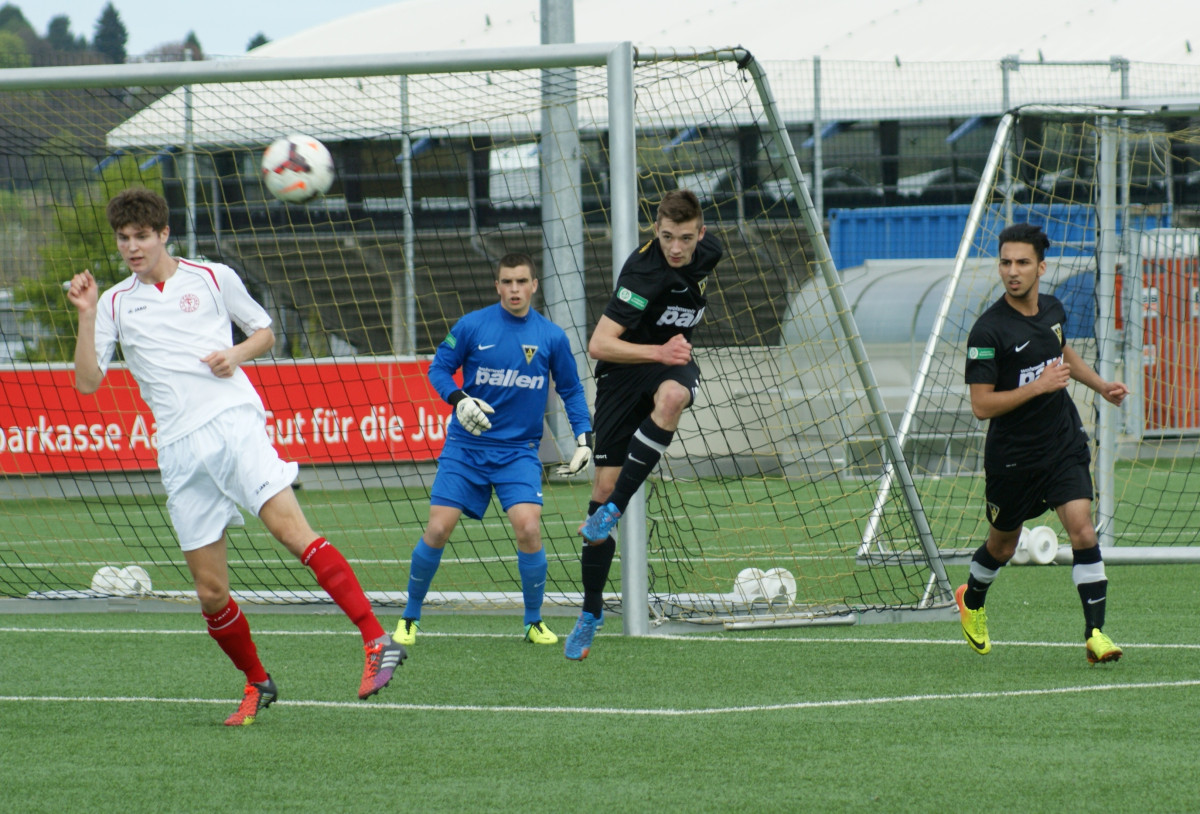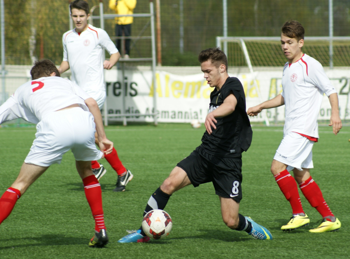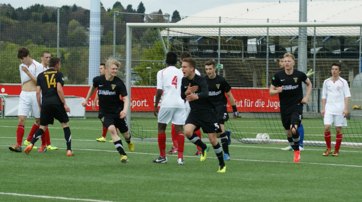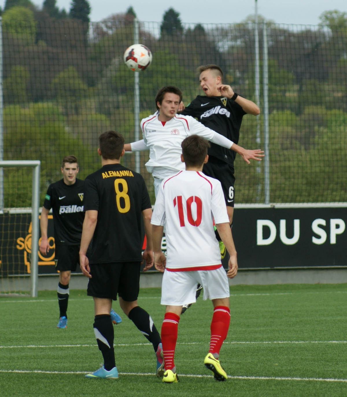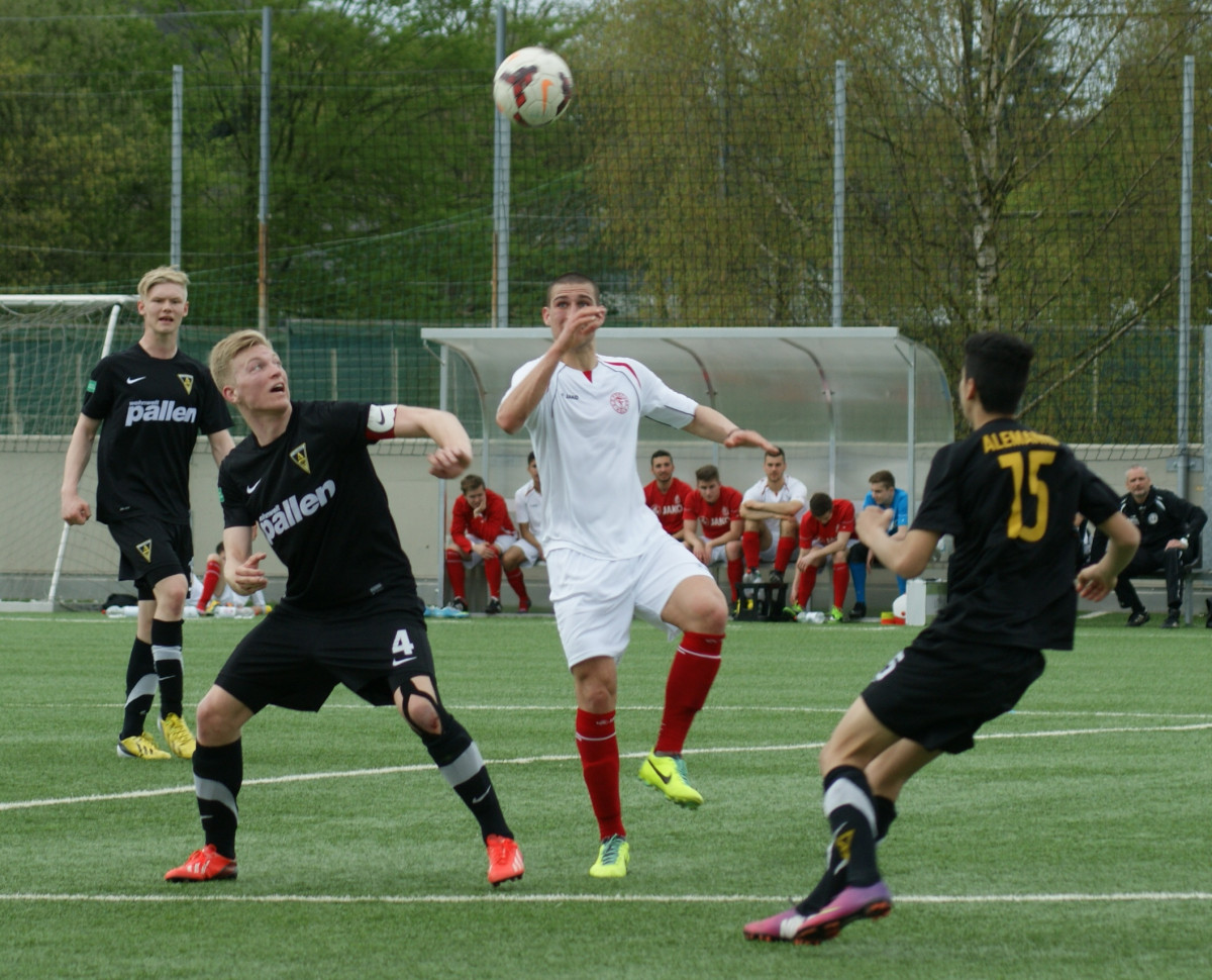 Der Dreikampf an der Tabellenspitze der A-Junioren-Verbandsliga geht weiter. Die Schlussphase beim 2:1-Erfolg der Aachener U19 gegen Fortuna Köln war allerdings nichts für schwache Nerven. Die Gäste waren in der 87. Minute zunächst zum Ausgleich gekommen, ehe Andreas Mertens den Alemannen mit einem Kopfball in der Schlussminute doch noch ein Happy-End bescherte.