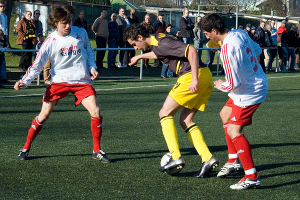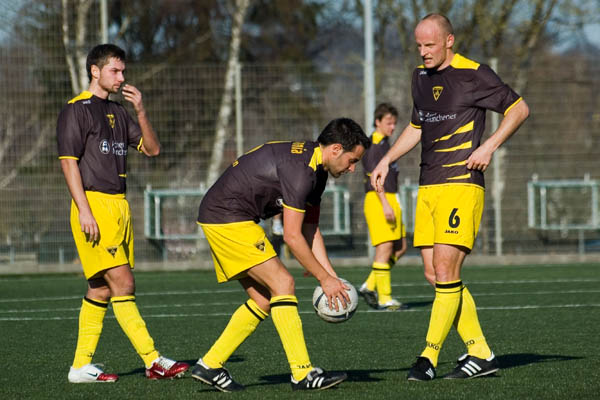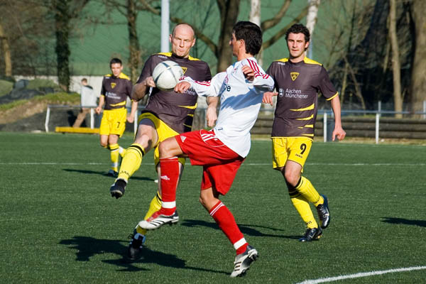 Bei frühsommerlichen Temperaturen präsentierten sich die Emmerling-Schützlinge vor rund 300 Zuschauern von Beginn an Feldüberlegen, zwingende Torgelegenheiten blieben jedoch hüben wie drüben Mangelware. Also mussten zwei Standardsituationen für die Highlights des ersten Spielabschnitts herhalten. Zunächst ließ Tom Moosmayer mit einem direkt verwandelten Freistoß aus 18 Metern Keeper Poremba keine Abwehrchance (43.) und nur eine Minute später hätte der Aachener Kapitän um ein Haar einen Eckball direkt verwandelt, traf jedoch nur die Latte.