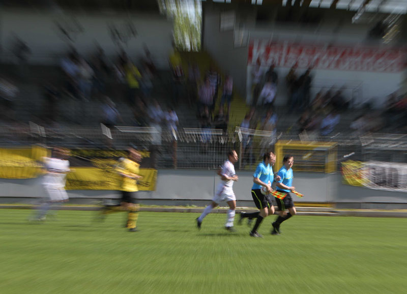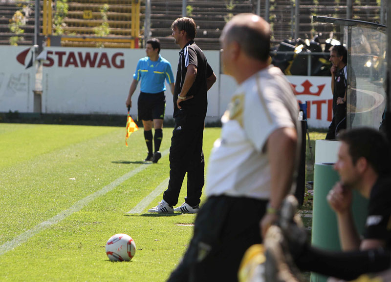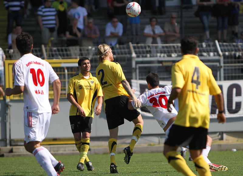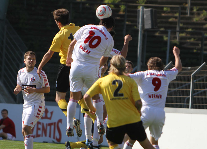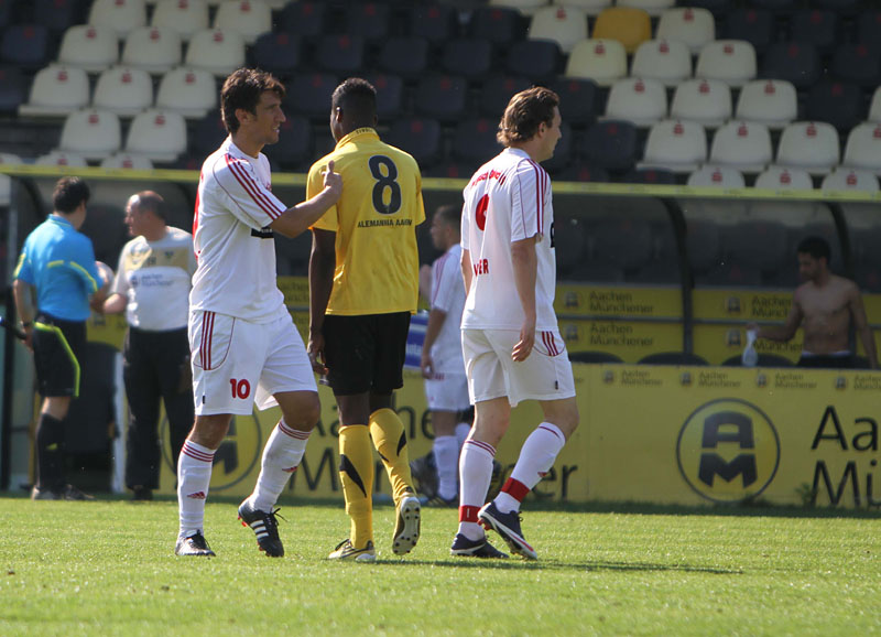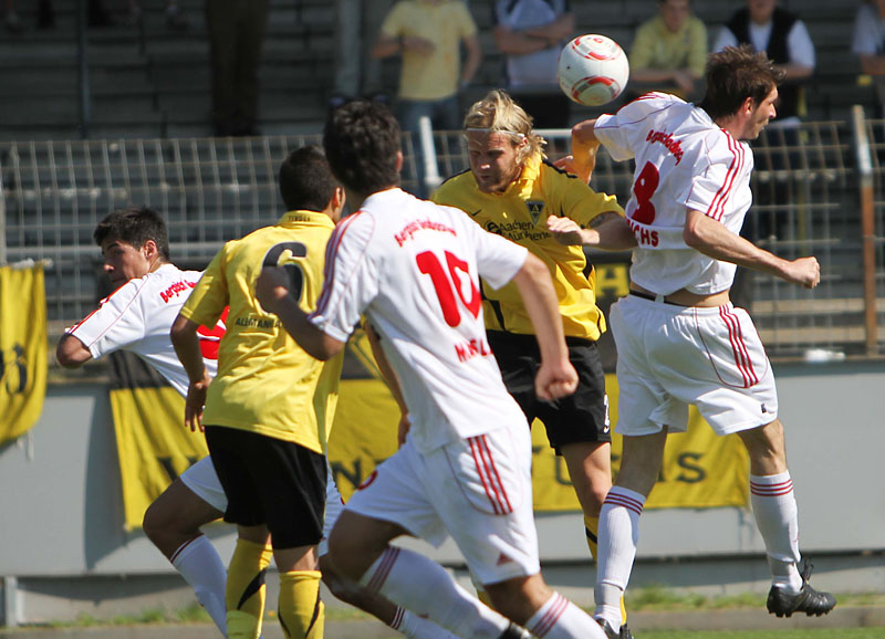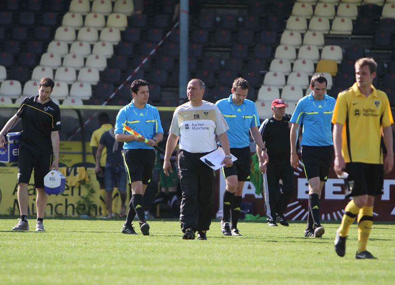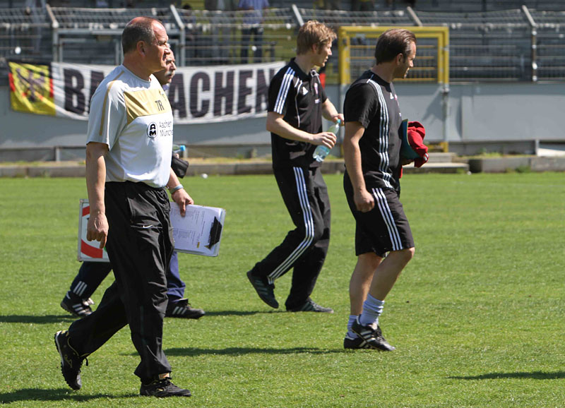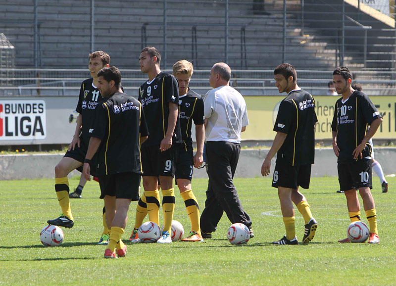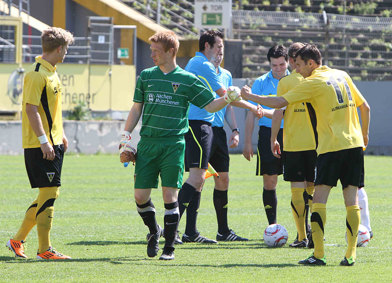 Auch im zweiten Spielabschnitt gingen die ersten Möglichkeiten auf das Konto der Aachener. Einen Distanzschuss von Marquet fischte Forsbach noch aus dem linken Torwinkel und bei der anschließenden Ecke konnte Eumann einen Kopfball von Herzig für den bereits geschlagenen Keeper noch von der Torlinie (49.) entschärfen. Die Alemannen blieben am Drücker und gingen nach 66 Minuten verdient in Führung. Bei einem 18m-Freistoß von Lekesiz rettete Forsbach zunächst ein weiteres Mal bravourös, doch im Nachsetzen köpfte Marquet das Leder zum 2:1 über die Linie. Doch die Gäste steckten nicht auf und kamen nach einer Rechtsecke noch zum Ausgleich. Erneut war es Schilamow, der die zu kurze Abwehr mit einem verdeckten Schuss aus 18 Metern zum 2:2 nutzten konnte (77.). Zwei Minuten später verfehlte Heinrichs mit einem Distanzschuss nur knapp das Aachener Gehäuse. So blieb es am Ende bei einer insgesamt leistungsgerechten Punktteilung, die beide Teams beim Erreichen ihres Saisonziels nicht wesentlich weiter hilft „Wir haben heute ein gutes Oberligaspiel gesehen. Wenn wir am Ende jedoch Dritter werden wollen, war dieser Punkt heute zu wenig“, brachte es Ralf Aussem nach dem Spiel auf den Punkt.