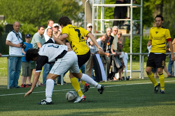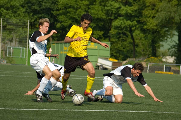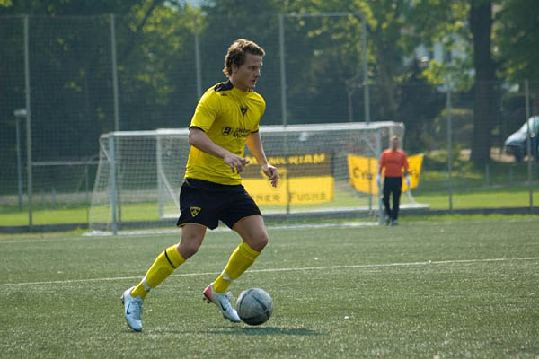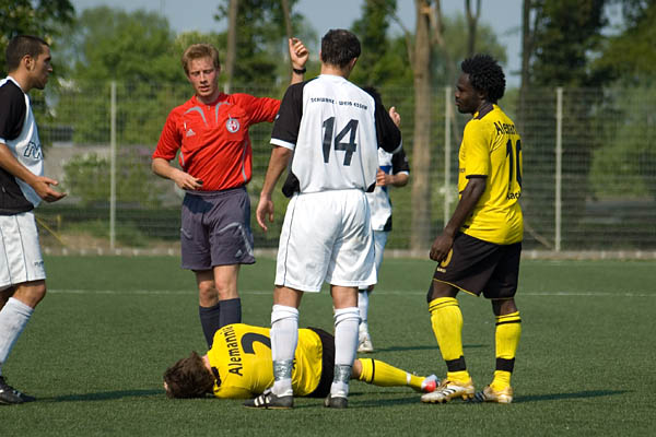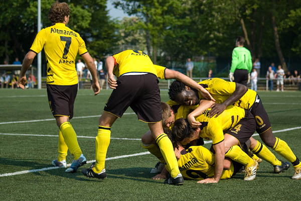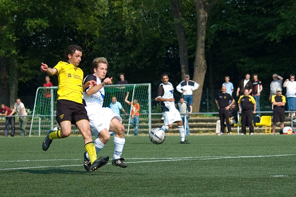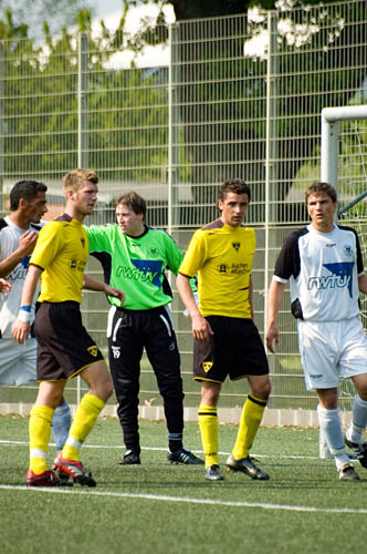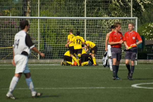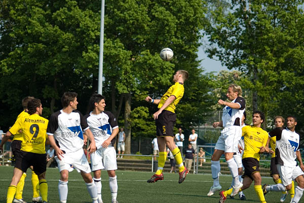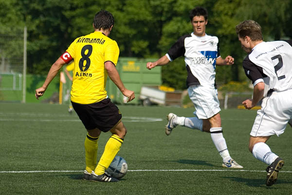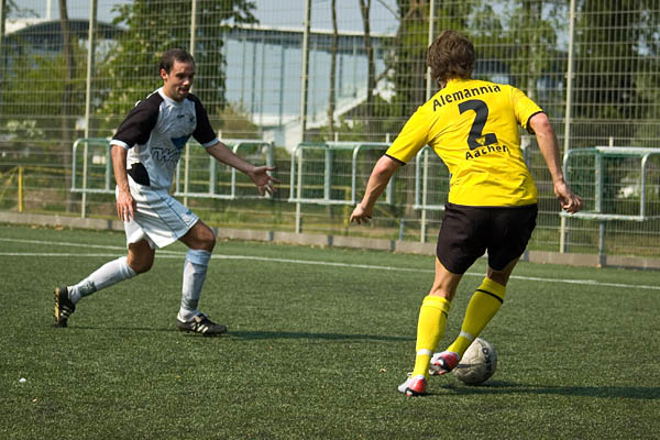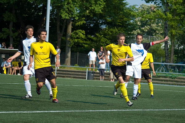Das Spiel begann mit einer kalten Dusche, auf die die Tivoli-Kicker trotz hochsommerlicher Pause gerne verzichtet hätten. Denn bereits nach 50 Sekunden gingen die Gäste - als einziges in der Rückrunde noch ungeschlagenes Team als Tabellendritter nach Aachen gereist - in Führung. Hupperts hatte einen Freistoß von der rechten Seite auf den kurzen Pfosten gezogen und die Aachener Abwehr einschließlich Torwart Daniel Schell ziemlich schlecht aussehen lassen. Die jungen Alemannen präsentierten sich in der Folgzeit zwar Feld überlegen, zwingende Torchancen blieben dabei jedoch Mangelware. Erst kurz vor der Pause musste Gästeschlussmann Johns bei einem Schuss von Özgen erstmals ernsthaft eingreifen.