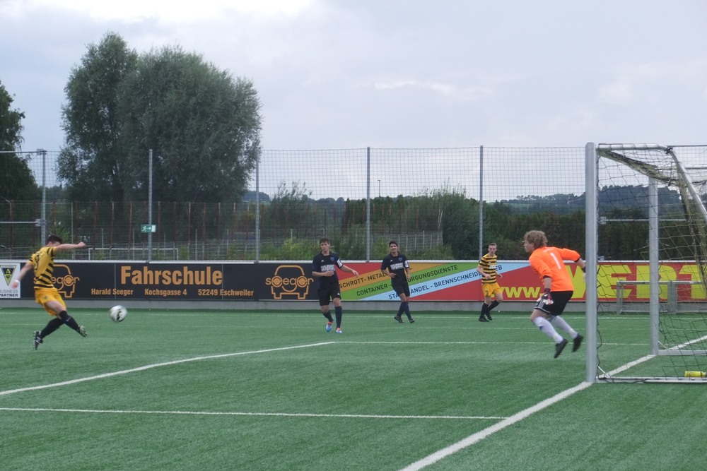 Aus dem Regionalligakader sammelten Kengo Fukudome, Marvin Brauweiler, Bastian Müller, Jannik Stevens, Florian Abel und Tobias Mohr in der Mittelrheinliga Spielpraxis, nachdem sie am Tag zuvor nicht zum Einsatz gekommen waren. Den besseren Auftakt erwischten jedoch die Gäste. Fukudome konnte eine Hereingabe von der linken Seite nicht festhalten, Kara staubte ab, stand jedoch bei der Flanke im Abseits - gerade einmal 40 Sekunden waren zu diesem Augenblick gespielt. Das 0:1 fiel nach acht Minuten und das regelkonform. Nach einem Aachener Ballverlust lief Gästekapitän Camuralioglu aus der eigenen Hälfte los und hielt aus 30 Metern einfach mal drauf. Fukudome kam nicht ran und Bergheim lag vorne. Nur vier Minuten später wurde ein Freistoß von Kühnel per Kopf vor die Füße von Abel abgewehrt, der das Leder mit links aus 17 Metern volley in die Maschen zimmerte. Der im passiven Abseits stehende Dautzenberg soll dem Torhüter dabei die Sicht versperrt haben, deswegen zählte auch dieser Treffer nicht. Kühnel verfehlte anschließend mit einem Distanzschuss nur knapp den Ausgleich (16.). Dieser fiel dann wenig später mit Unterstützung der Gäste. Nach einem weiten Einwurf von Alagöz nahm Jagusch bei seinem Klärungsversuch die Hand zur Hilfe. Schiri Kudela zeigte sofort auf den Elfmeterpunkt. Brauweiler übernahm die Verantwortung und verwandelte sicher zum 1:1 (22.). Im Anschluss an eine Bergheimer Ecke legten die Schwarz-Gelben nach. Mohr war nach einem Doppelpass mit Abel frei durch und vollendete den Konter eiskalt zur Führung – 2:1 (28.). Auf Vorarbeit von Mohr scheitere Dautzenberg danach noch an Gästekeeper Kraus (36.), sodass es mit einem knappen Vorsprung in die Kabine ging.