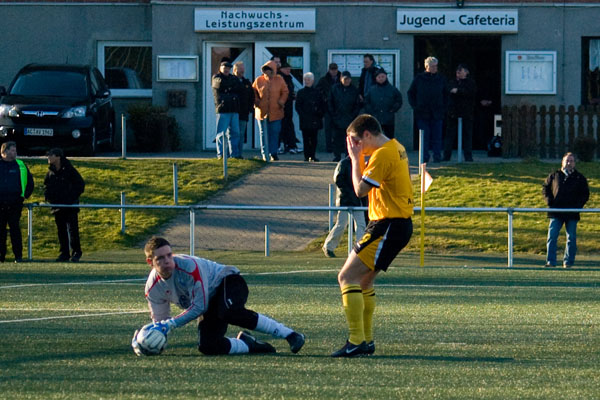 Wer allerdings dachte, die schmeichelhafte Halbzeitführung würde der Mannschaft für den zweiten Spielabschnitt das nötige Selbstvertrauen geben, sah sich getäuscht. Die Gäste waren weiterhin Feld überlegen, hatten allerdings im Abschluss kein Glück oder scheiterten am gut aufgelegten David Hohs. Einen Tosonoglu-Freistoß lenkte der Schlussmann mit den Fingerspitzen noch an die Latte (55.) und 10 Minuten vor dem Ende gewann der Keeper auch das letzte Duell des Tages, indem er einen 20m-Schuss des Duisburger Offensivmanns noch über die Latte bugsierte.