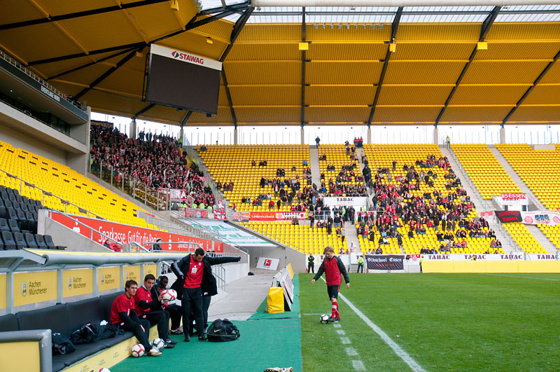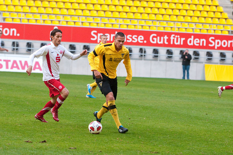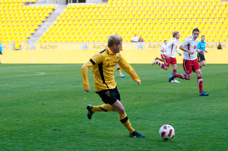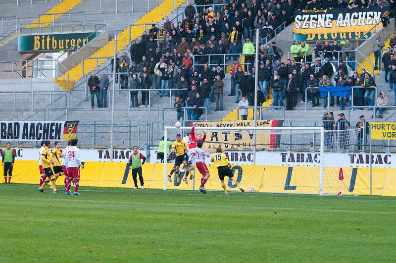 Nach dem Seitenwechsel hatte der Liga-Primus das Spielgeschehen dann besser im Griff. Brauer verfehlte mit einem Distanzschuss zunächst knapp den zweiten Treffer. Nach einer guten Stunde einteilte Avci nach einem Abstimmungsfehler der Aachener Hintermannschaft und vollendete frei vor Jorzig zum 0:2 (62.). Ralf Aussem reagierte und stellte auf einen 3er-Abwehrreigel um. Eine Maßnahme, die kurzzeitig zu fruchten schien. Nach einem Foul von Thamm an Engelbrecht übernahm der Gefoulte die Verantwortung selbst und verwandelte den fälligen Strafstoß mit seinem achten Saisontreffer sicher zum 1:2 (73.). Die Schwarz-Gelben witterten nun noch einmal Morgenluft und hatten Pech, dass ein wuchtiges Geschoss des eingewechselten Demir in höchster Not von Wagner noch abgeblockt werden konnte (76.). Praktisch im Gegenzug war das Spiel dann entschieden. Nach einem Einwurf in der eigenen Hälfte verloren die Tivoli-Kicker unnötig das Leder und Nutznießer Tokat beendete mit seinem Treffer zum 1:3 alle Aachener Hoffnungen (77.).