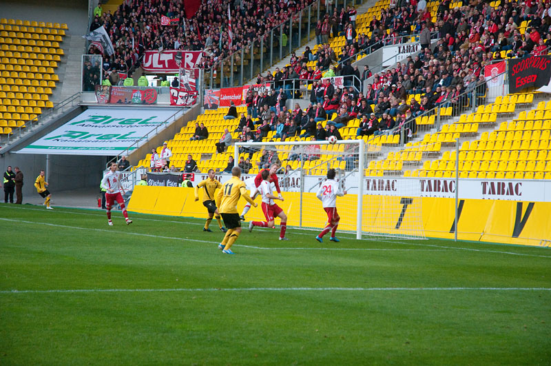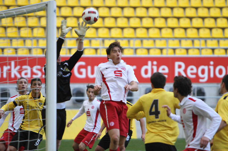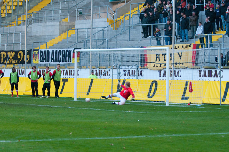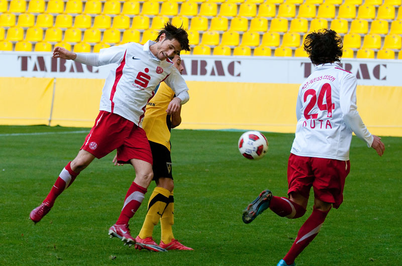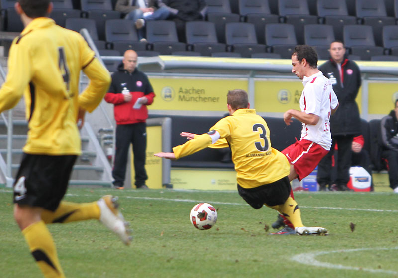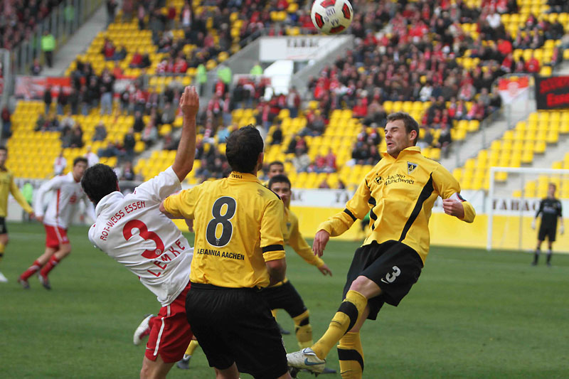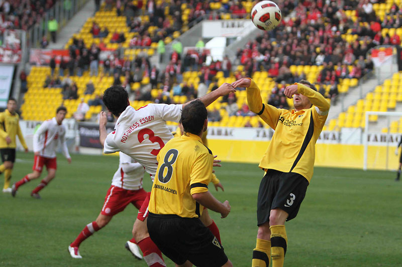 Während Henrik Ojamaa erneut Spielpraxis in der NRW-Liga sammelte, wurde neben Robert Wilschrey auch Narciso Lubasa kurzfristig noch für das Profi-Aufgebot nachnominiert. Trotz personeller Umstellungen fand die junge Aachener Mannschaft gut ins Spiel. Zunächst konnten Hereingaben von Sabacinski (2.) und Ojamaa (17.) im letzten Augenblick noch entschärft werden, dann klärten die Gäste nach einer Rechtsecke von Schnier einen Kopfball von Frau noch von der Torlinie (18.). Nach einer halben Stunde musste RWE-Keeper Lamczyk sich bei einem Aufsetzer von Temeltas mächtig strecken. Vier Minuten später wurde der Spielverlauf auf den Kopf gestellt, weil eine Kopfball-Abwehr von Alemannia-Schlussmann Jorzig vor dem Strafraum zum Boomerang wurde. Enzmann hielt aus gut 40 Metern einfach drauf und Aachens Malget fälschte das Leder unglücklich mit dem Hinterkopf zur schmeichelhaften Essener Pausenführung ab (34.).