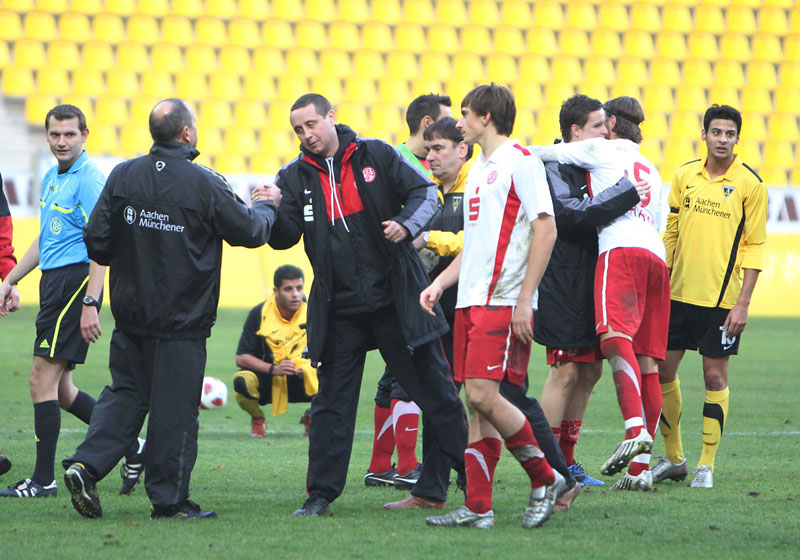 „Es war ein enges Spiel mit einem sehr, sehr glücklichen Sieger. Aachen war uns in der ersten Halbzeit in allen Belangen überlegen. Ein Unentschieden wäre sicherlich das gerechtere Ergebnis gewesen“, fasste Gästetrainer Waldemar Wrobel das Spielgeschehen treffend zusammen. Von diesen Komplimenten konnte sich Aachens U23-Coach Ralf Aussem derweil leider nichts kaufen. „Wir haben den Gegner bei allen drei Gegentoren mit Fehlern eingeladen. Eine Spitzenmannschaft wie Rot-Weiss Essen nutzt solche Fehler eiskalt aus. Mir wäre ein unverdienter Sieg heute sicherlich lieber gewesen“, so der Aachener Trainer.
