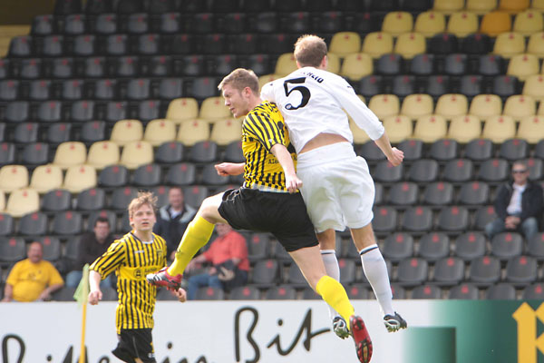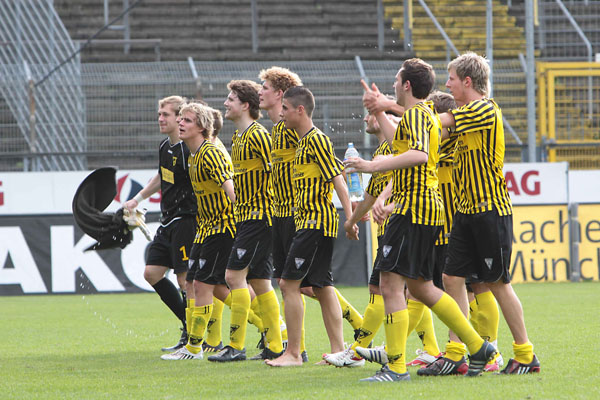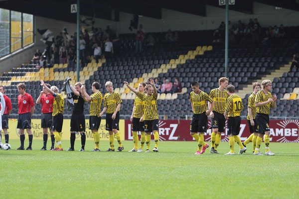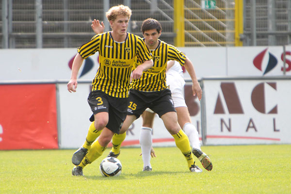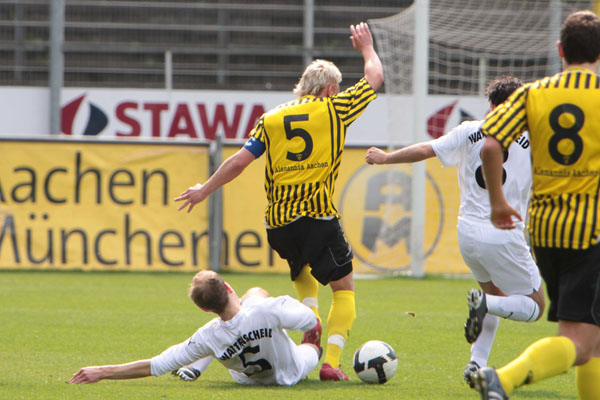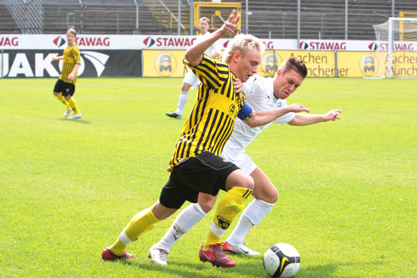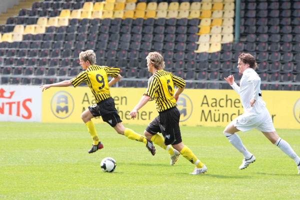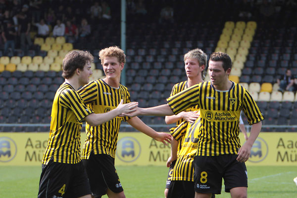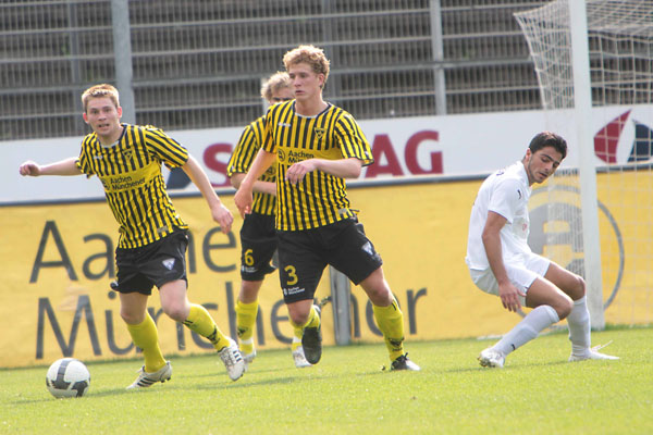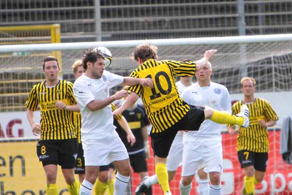 Eric van der Luer musste kurzfristig den Ausfall von drei Stammkräften kompensieren. Abdul Özgen und Manuel Junglas, die gemeinsam 29 der zuvor 48 Aachener Tore erzielen konnten, wurden ins Profiaufgebot für das Ahlen-Spiel berufen und der etatmäßige Kapitän Thomas Sabacinski nahm stark grippegeschwächt nur auf der Bank platz. Dafür erhielten die U19-Akeure Alper Uludag und Alexander Keller erstmals eine Bewährungschance von Beginn an. Die Gäste aus dem Ruhrgebiet, die zuvor 11 Spiele in Serie nicht gewinnen konnten, versteckten sich bei frühsommerlichen Temperaturen keineswegs und hatten durch Diaz (16.) und Toku (28.) gleich zweimal die Führung auf dem Fuß. Wie aus dem Nichts fiel das Tor indes auf der Gegenseite. Tibor Heber zirkelte einen Freistoß von der linken Seite an Freund und Feind vorbei ins lange Eck zur Pausenführung (38.).
