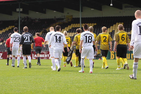 Nach furiosem Saisonstart zierten die Lohrheide-Kicker bis zum achten Spieltag sogar die Tabellenspitze der NRW-Liga. Auch im Hinspiel sah es für die Schwarz-Weißen zunächst gut aus. Nach dem Wechsel drehten die jungen Alemannen dann aber mächtig auf und konnten die Partie nach einem Pausenrückstand am Ende noch klar mit 3:1 für sich entscheiden. „Vielleicht ein Knackpunkt“, vermutet Eric van der Luer. Denn seit dem ging des mit dem Bochumer Traditionsverein eigentlich stetig bergab. Die aktuelle Serie von 11 Spielen ohne Sieg hat die 09er sogar in den Abstiegsstrudel geschwemmt. Am Mittwoch unterlag Wattenscheid vor heimischer Kulisse auch dem Tabellenvorletzten Oestrich-Iserlohn mit 0:2. „Die ersten Spiele haben gezeigt, dass Wattenscheid eigentlich eine gute Mannschaft hat“, kann Eric van der Luer den Absturz der Gäste nicht ganz nachvollziehen und fügt hinzu: „Wir werden den Gegner mit Sicherheit nicht unterschätzen.“