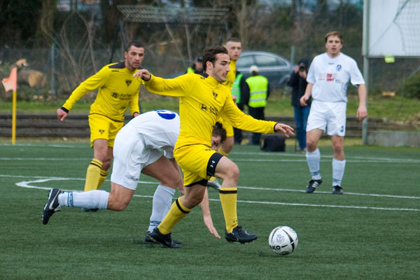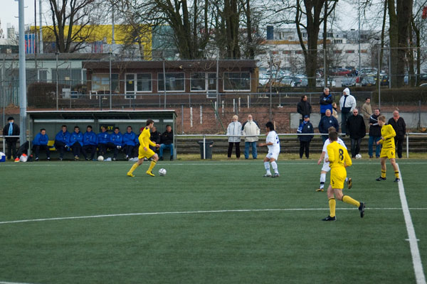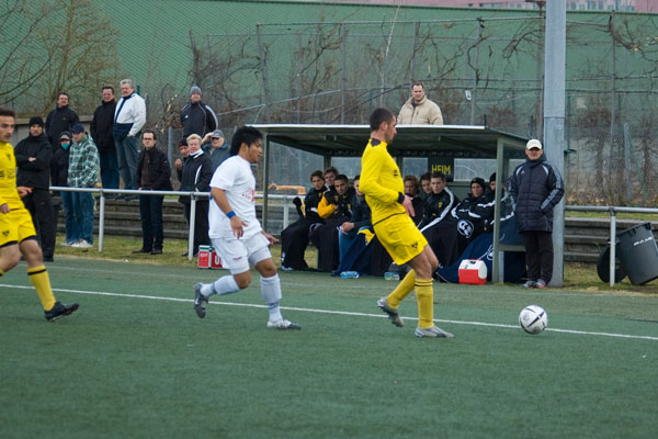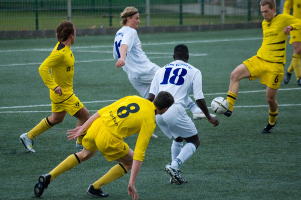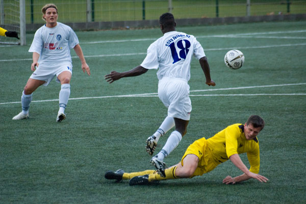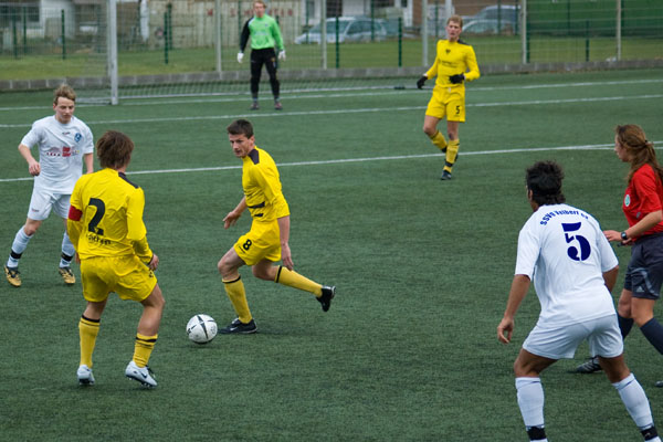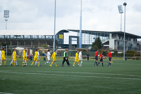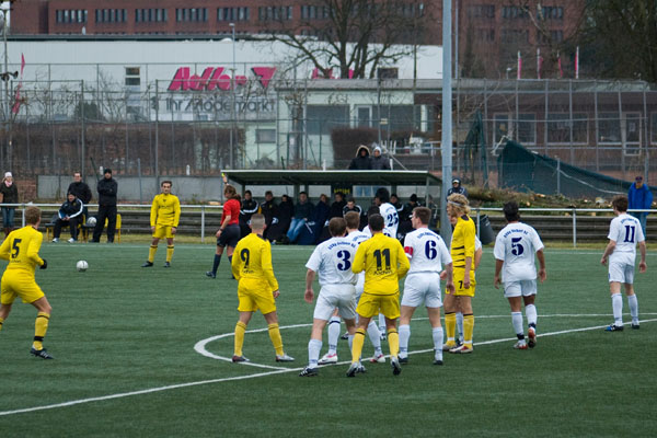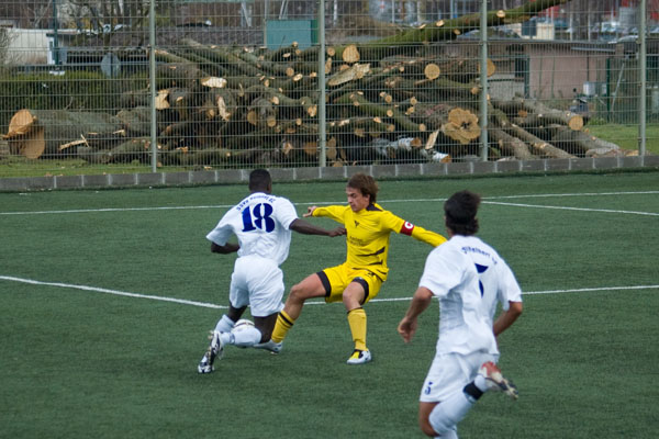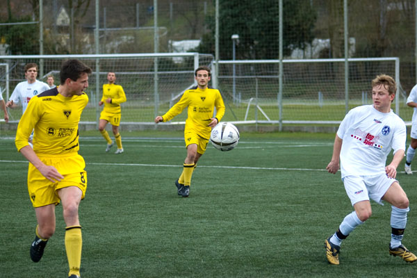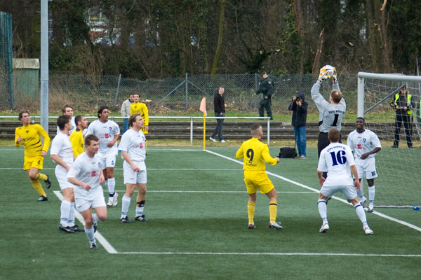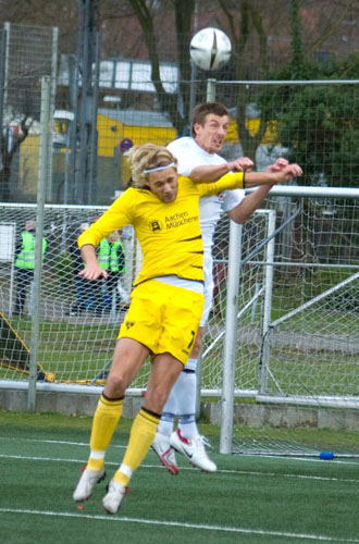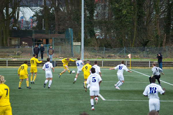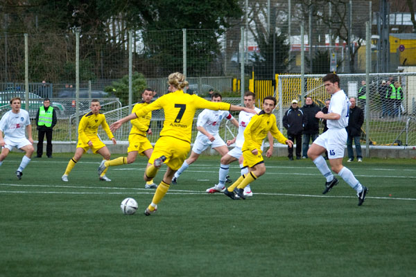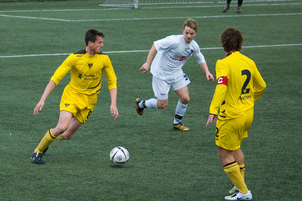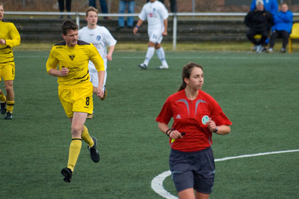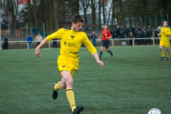 Neben David Hohs und Faton Popova sammelten auch Reiner Plaßhenrich und Daniel Brinkmann Spielpraxis in der Oberliga. Den ersten Aufreger des Spiels gab es nach rund einer Viertelstunde, als die Gäste nach einem Tackling von Sabacinski gegen Angreifer Finnern einen Strafstoß reklamierten. Die souverän leitende Unparteiische Marija Kurtes entschied jedoch zu Recht auf Weiterspielen. Mitte der ersten Halbzeit kam der Alemannen-Express so langsam ins Rollen. Scheiterten Mijlkovic (Außennetz, 26.), Kaesberg (abgeblockt, 28.) und Haas (Kopfball, 33.) noch knapp, zappelte die Kugel wenig später doch zur verdienten Führung im Netz. Popova setzte Mijlkovic im Strafraum in Szene, der die Kugel überlegt in den linken Torwinkel schlenzte - 1:0 (35.). Die junge Aachener Elf blieb am Drücker und legte nach. Erneut war Popova mit einem genialen Pass der Wegbereiter. Özgen schüttelte gleich zwei Bewacher ab und traf mit einem trockenen Flachschuss zum 2:0 (37.).