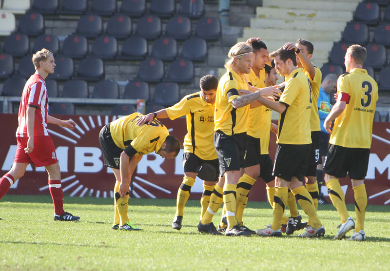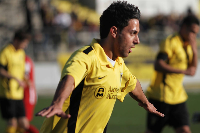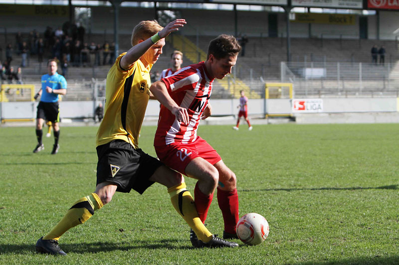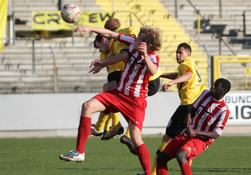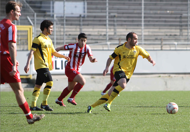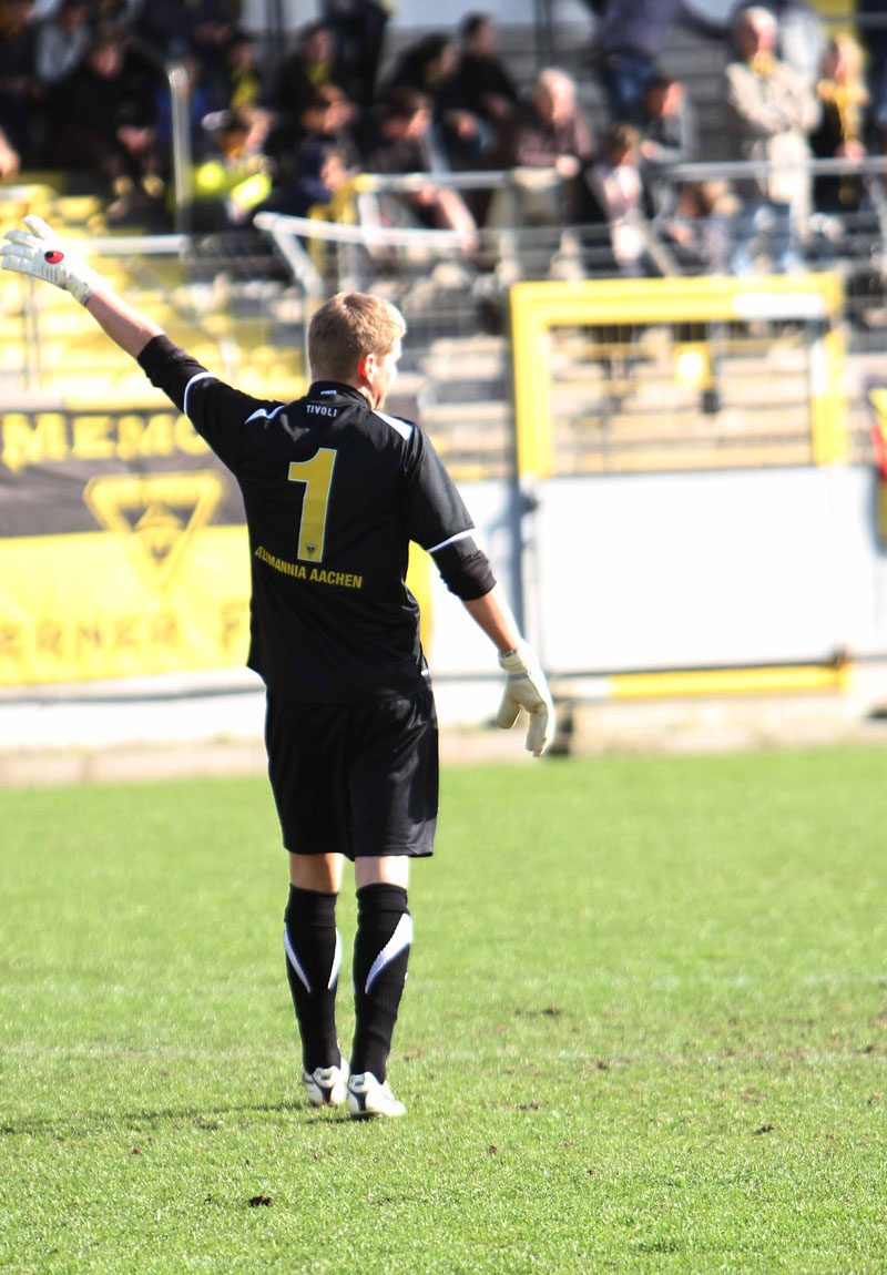 Mit Tim Krumpen, Nico Herzig, Bilial Cubukcu und Juvhel Tsoumou sammelten gleich vier Akteure Spielpraxis im Aachener Amateurteam. Bei frühlingshaftem Sonnenschein beschnupperten sich beide Teams eine gute Viertelstunde lang, bevor die ersten Torchancen notiert werden konnten. Nach einer Flanke von Ali Mostowfi wurde ein Kopfball von Stephan Wanneck vom rechten Innenpfosten leider nicht ins Tor gelenkt und im Gegenzug musste sich Krumpen bei einem Schuss von Bönighausen mächtig strecken (19.). Zwei Minuten später kullerte eine Direktabnahme von Binder parallel entlang der Torlinie, ohne einen Vollstrecker zu finden (21.). „Die erste richtig gute Kombination“, es wie Ralf Aussem auf der Pressekonferenz später treffend formulierte, führte nach 36 Minuten zur Aachener Führung. Ein Anspiel von Herzig wurde von Cubukcu auf Daniel Engelbrecht weitergeleitet und der Torjäger vollendete die Profi-Koproduktion mit seinem bereits 14. Saisontor eiskalt zum 1:0. Fünf Minuten vor dem Seitenwechsel wäre Engelbrecht mit einem 25-Meter-Kracher fast erneut erfolgreich gewesen.