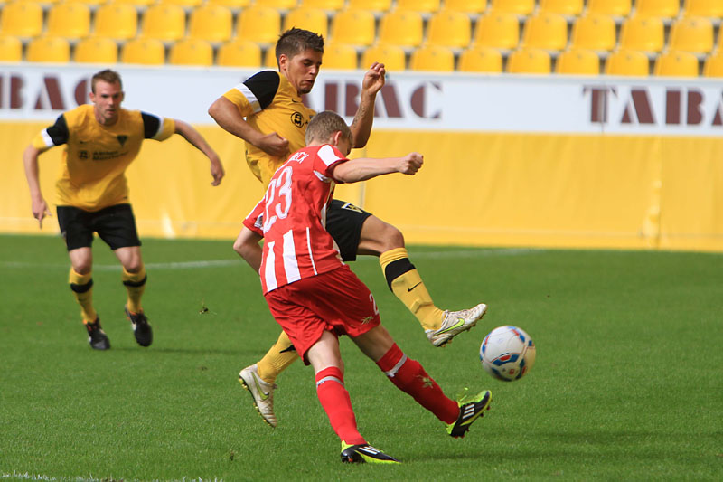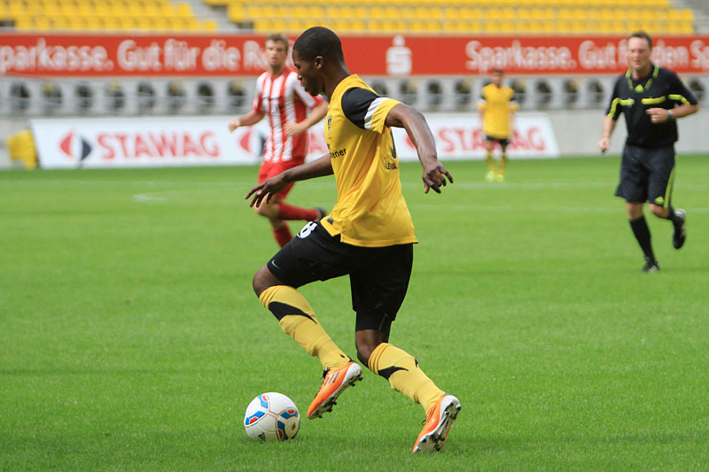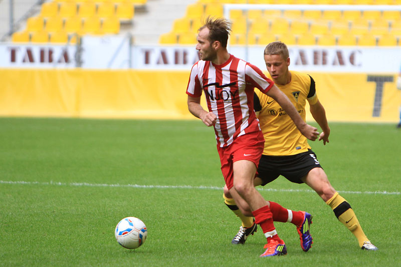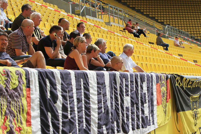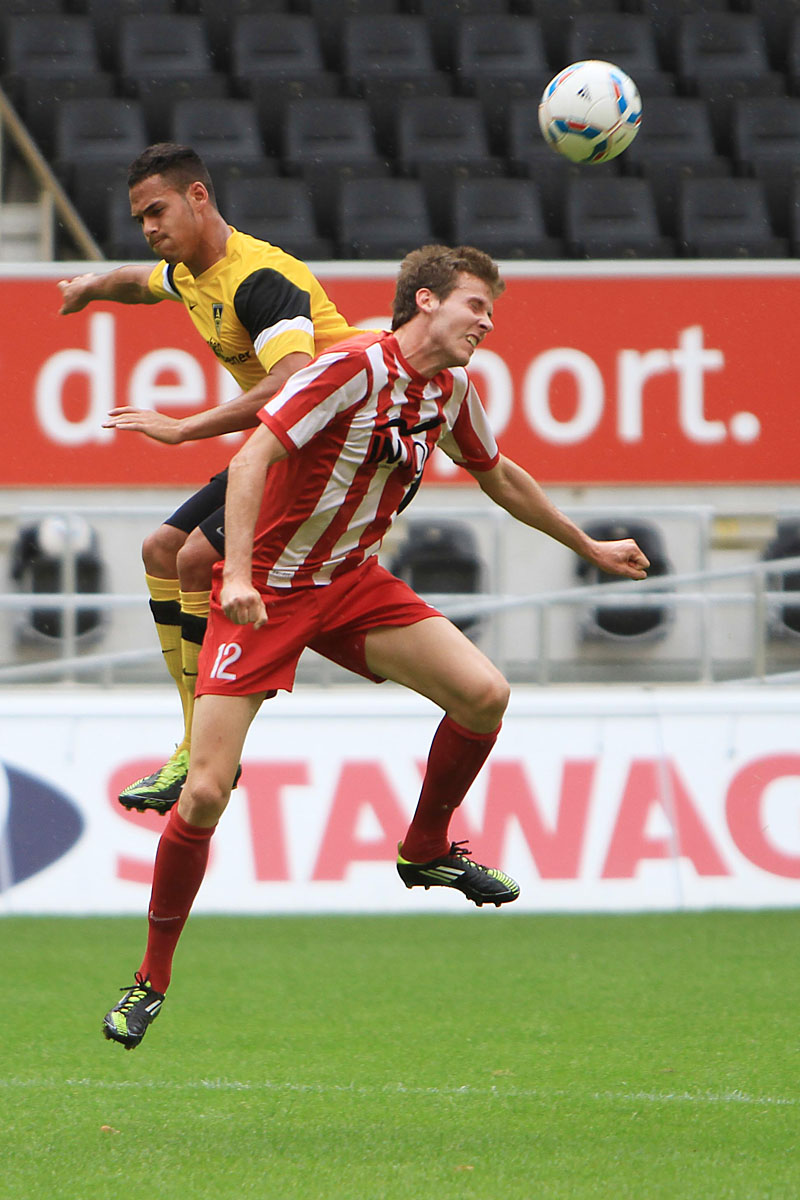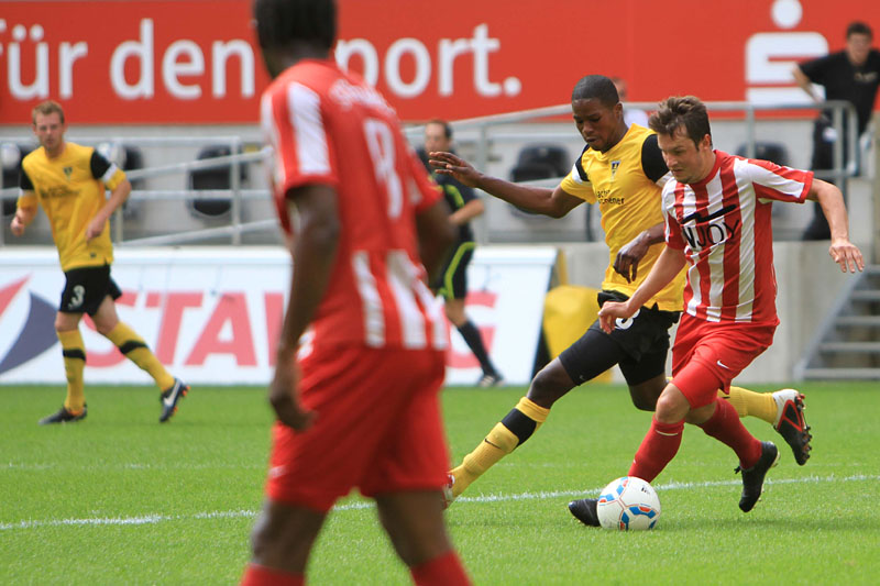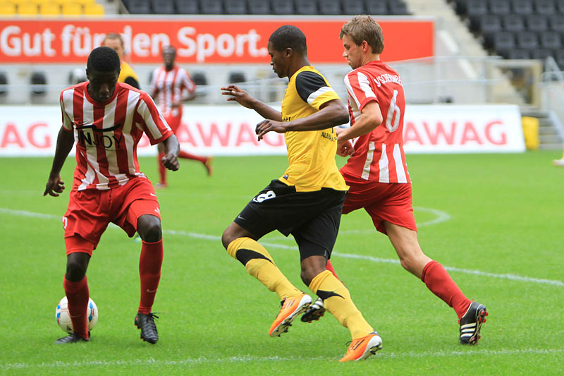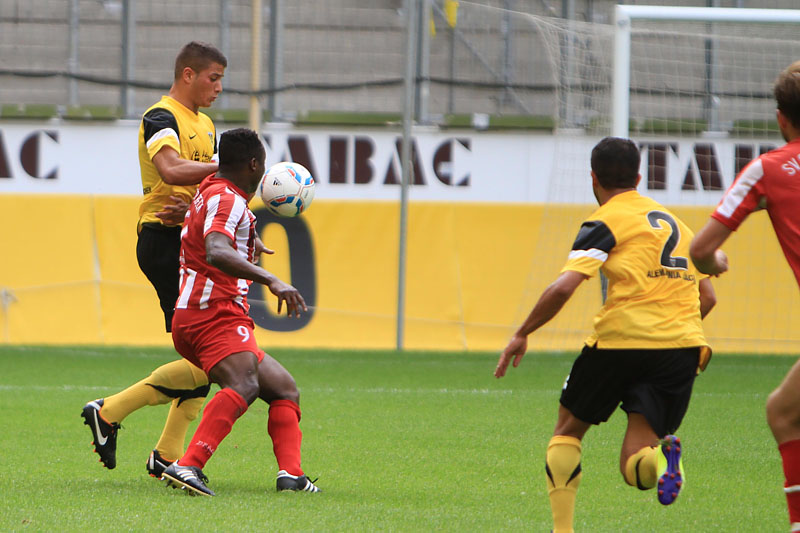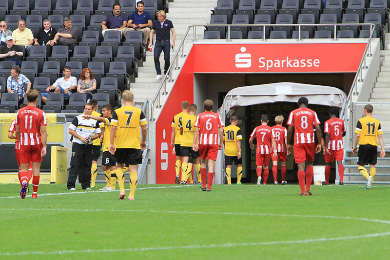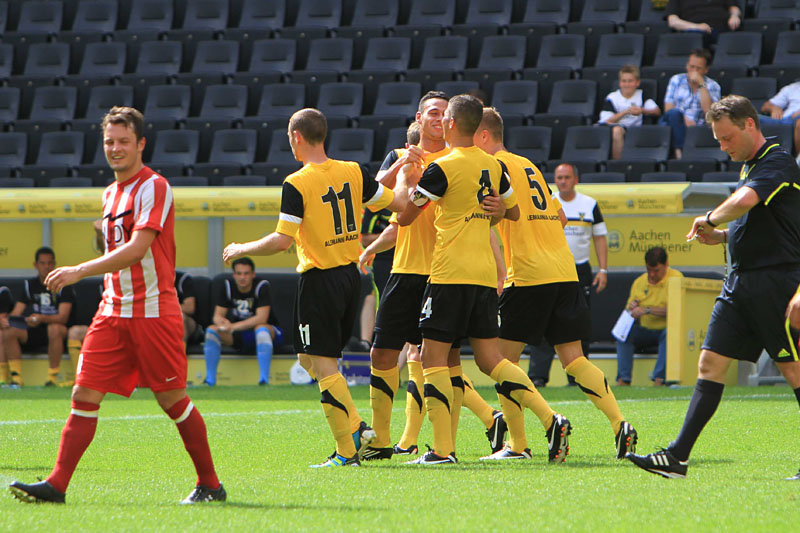 Die Schwarz-Gelben erwischten den besseren Start, Fabian Bäcker, der auf der linken Seite einen Gegenspieler umkurvte, hatte nach rund 90 Sekunden die erste Chance, die erst Torwart Christoph Müller zunichte machte. Auf der anderen Seite tauchte Nassirou Ouro-Akpo nach einer zum langen Pfosten verlängerten Ecke erstmals gefährlich vor Jared Jorzig auf. Wenig später fasste sich Daniel Engelbrecht aus 22 Metern ein Herz, seinen Flachschuss ließ Müller zum 1:0 "durch die Hosenträger" rutschen (6.). In einer sehr munteren ersten Hälfte versteckten sich die Gäste aus Westfalen keineswegs. Eine scharfe Hereingabe von Yves Ntungi Lupitu (12.), ein 20m-Schuss von Mirko Urban (20.), ein Schlenzer von Marek Klimczok (26.) und wieder Klimczok aus spitzem Winkel (30.) brachten jeweils Gefahr für das Aachener Tor. Für die Alemannia hatten Bäcker nach Anspiel von Hartmann (16.), Sascha Marquet nach einem Sololauf (18.) und Engelbrecht nach Flanke von Korte (32.) gute Szenen. In der 34. Minute war es wieder ein Distanzschuss von Engelbrecht, der die Zuschauer im Block O3 jubeln ließ. Dieses Mal überwand er Torwart Müller mit einem hart ins linke Eck getretenen Freistoß aus rund 30 Metern. Die Gäste versäumten es bei einem Heber von Mirko Urban, den Jorzig noch aus dem Winkel holte (38.), einem Freistoß des starken Linksaußen Klimczok (42.) sowie einem Flachschuss von Klimczok, bei dem Jorzig stark reagierte (44.), vor der Pause den Rückstand zu verkürzen.