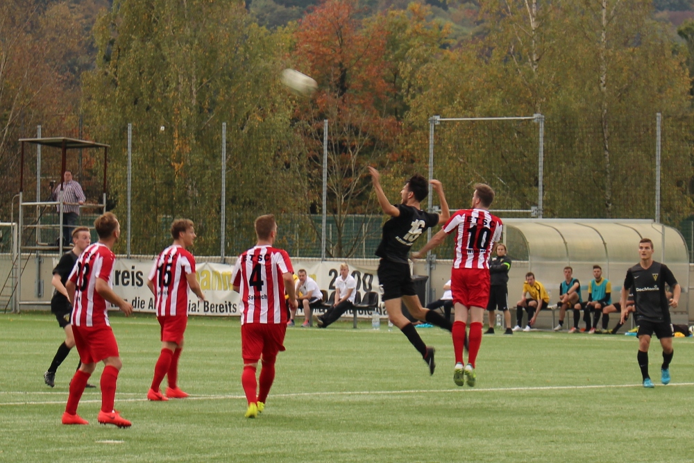 Vor rund 100 Zuschauern gehörte den Tivoli-Kickern die erste gute Möglichkeit des Spiels. Auf Zuspiel von Ito tauchte Dautzenberg frei vor Gästekeeper Grieshop auf, der das Duell jedoch für sich entscheiden konnte (16.). Wie am vergangenen Mittwoch beim Nachholspiel in Wegberg-Beeck war es ein Freistoß aus 18 Metern, der die Alemannen ins Hintertreffen brachte. Hoose schoss die Kugel durch die Mauer, Fukudome sah das Leder daher zu spät und hatte keine Abwehrchance – 0:1 (21.). In der 35. Minute legten die Gäste nach. Engel bereitete über die rechte Seite vor, Leßenich legte die Kugel vorbei an Fukudome und traf zum 0:2 ins verwaiste Tor. Die Antwort der Schwarz-Gelben folgte vier Minuten später. TSC-Schlussmann Grieshop konnte einen Freistoß von Mohr nicht festhalten und Ito staubte zum 1:2 ab (39.). Kurz darauf hatte Dautzenberg mit einem Kopfball den sogar die Gelegenheit zum Ausgleich. Dabei prallte der Angreifer so heftig mit seinem Gegenspieler Golz zusammen, dass beide Minuten lang behandelt und letztendlich mit Platzwunden per Krankenwagen abtransportiert werden musste. Schiri Weidrich bat vorzeitig zum Pausentee (41.).