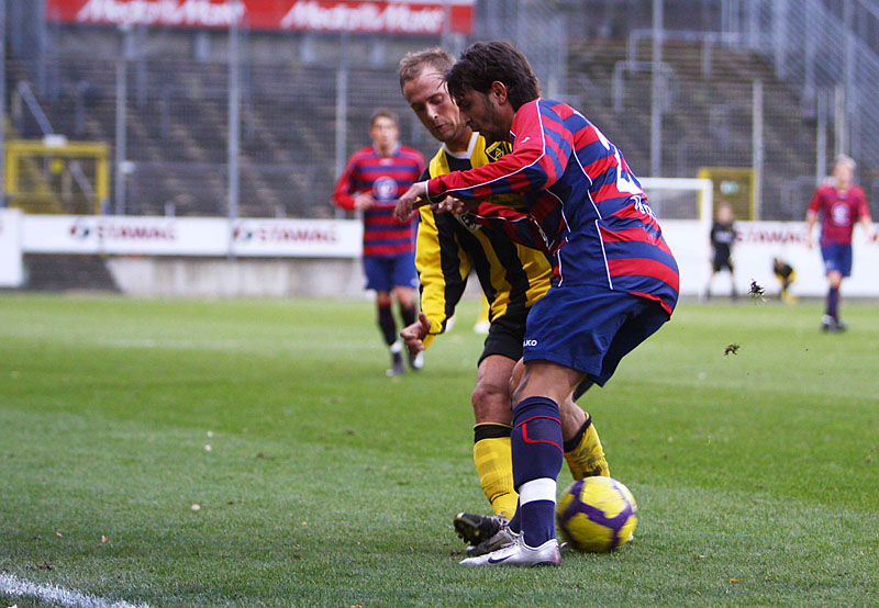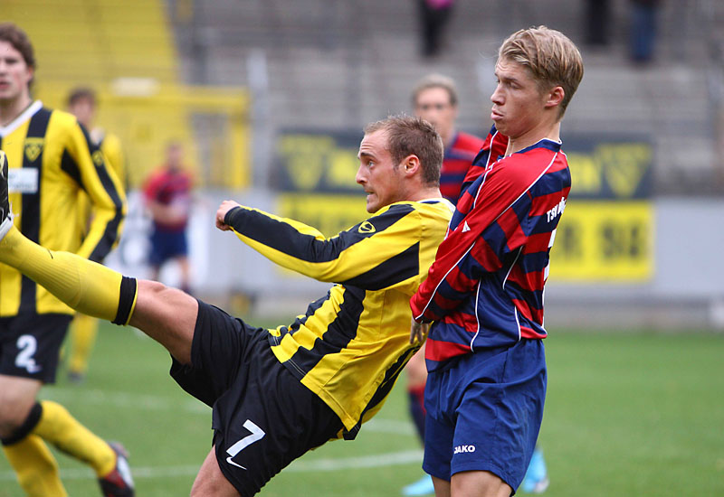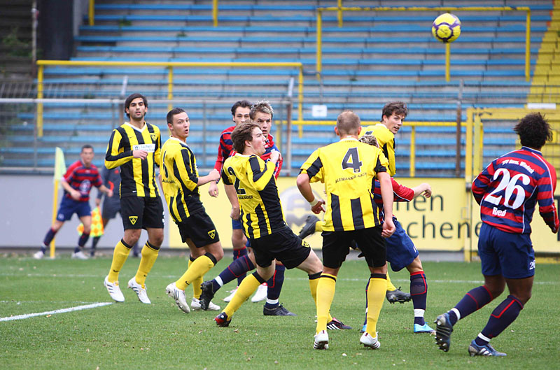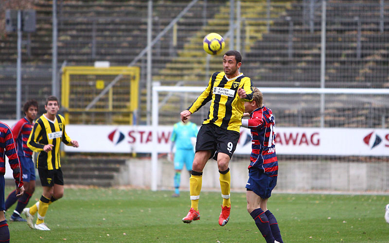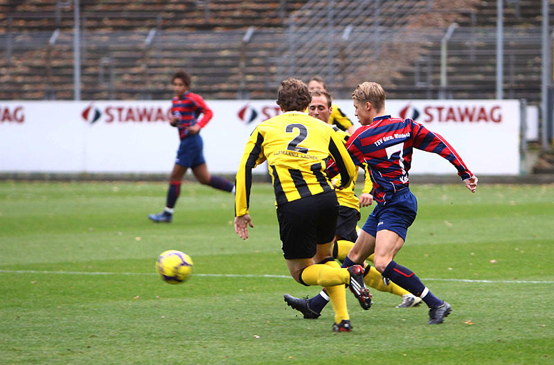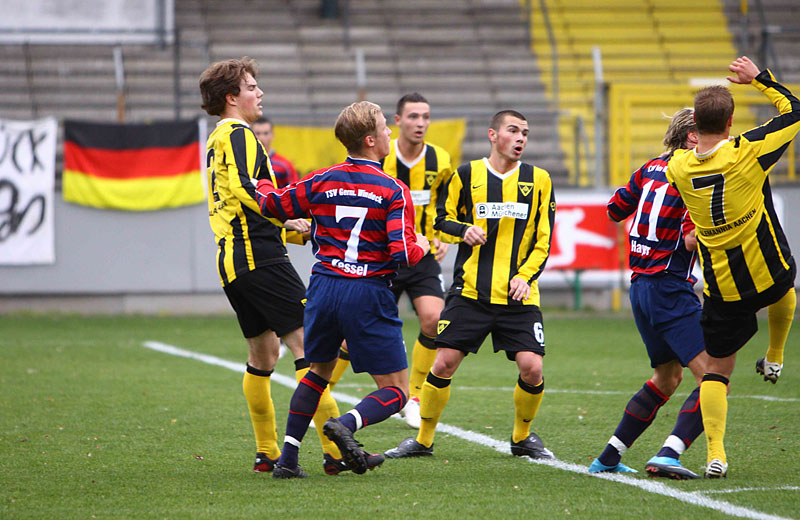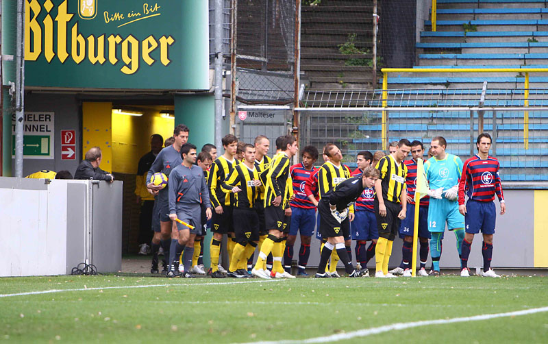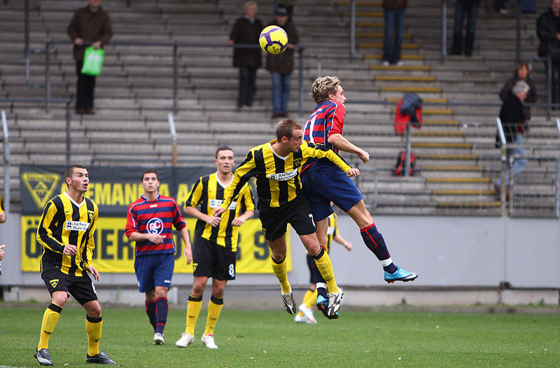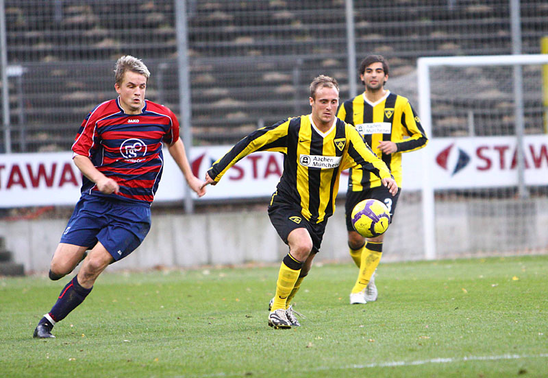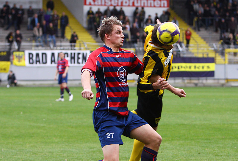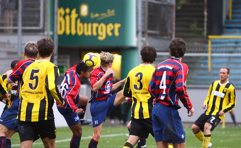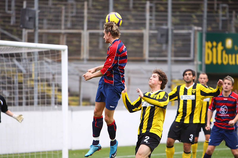 Erstmals im 16. Saisonspiel konnte Eric van der Luer die gleiche Formation der Vorwoche mit der einzigen Profi-Leihgabe im Abdul Özgen im Sturm aufbieten. Die erste Chance der Partie war jedoch den Gästen von der Sieg vorbehalten. Zweite-Keeper Tim Krumpen konnte Hayer aber im letzten Moment das Leder noch vom Fuß spitzeln (7.). Danach kam die Aachener Angriffsmaschinerie - angekurbelt vom stark aufspielenden Kapitän Marco Höger - immer besser in Fahrt. Zlatko Muhovic (22.) und Abdul Özgen (24.) scheiterten jeweils auf Zuspiel von Höger knapp. Nach einer guten halben Stunde war es erneut Höger, der Özgen frei spielte. Der Torjäger der letzten beiden Jahre ließ sich die Gelegenheit diesmal nicht nehmen und versenkte die Kugel trocken ins rechte Eck - 1:0 (32.). Vier Minuten später konnte Gästekeeper Cebula einen Distanzschuss von Muhovic mit den Fingerspitzen noch über die Latte lenken (36.) und kurz vor dem Seitenwechsel gab es nach einer Standardsituation tatsächlich noch ein Lebenszeichen der Germanen-Offensive. Dennis Lang konnte einen Kopfball von Sebastian Schoofs, der bei Bayer Leverkusen einst Bundesliga-Luft schnupperte, jedoch noch vor der Torlinie entschärfen (42.).