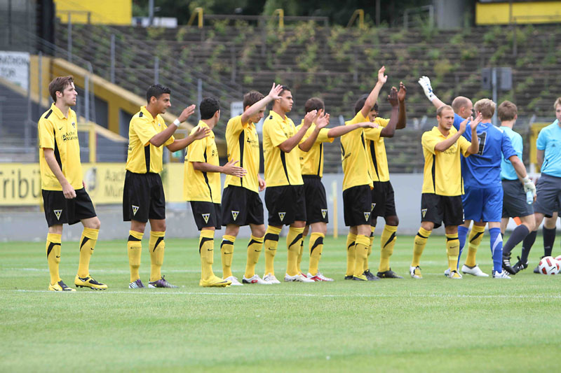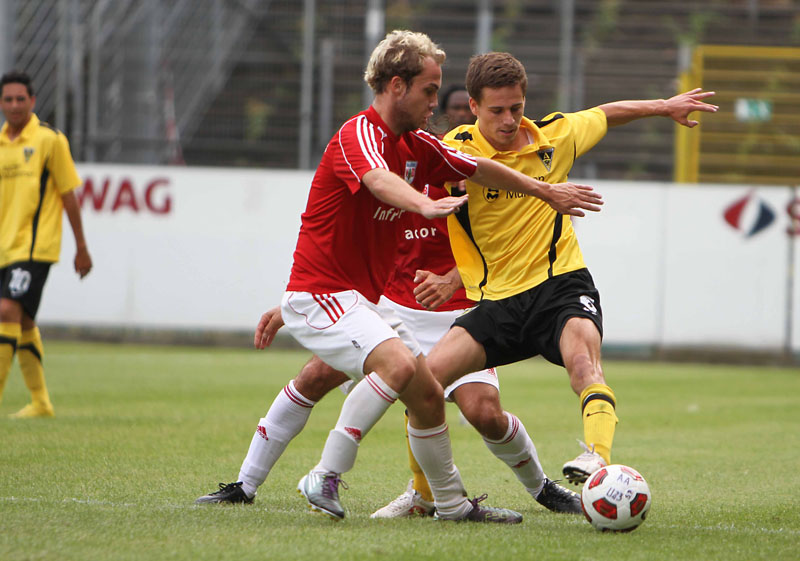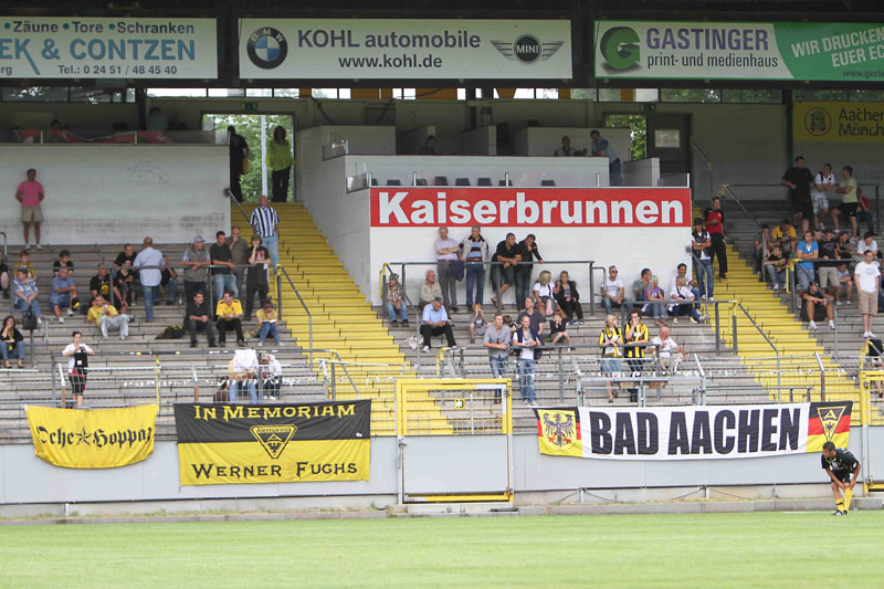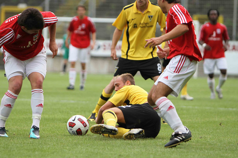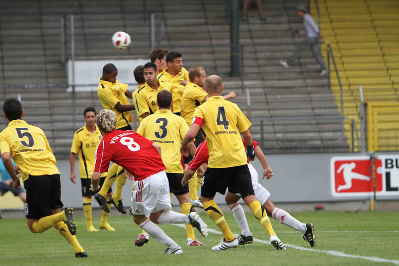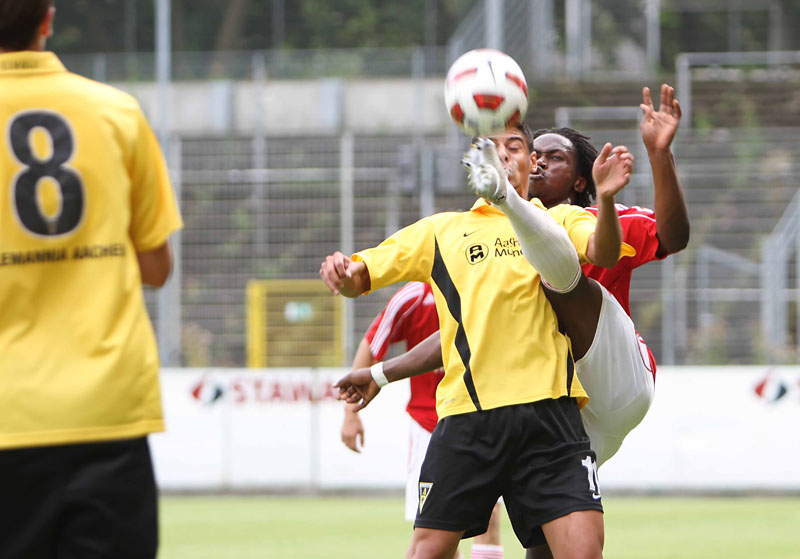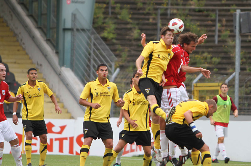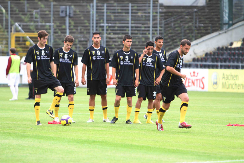 Vor den Augen von Sportdirektor Erik Meijer sowie dem Trainergespann Peter Hyballa und Eric van der Luer konnte Tim Krumpen Spielpraxis zwischen den Pfosten sammeln. Zudem präsentierten sich gleich fünf Neuzugänge in der Startformation. Keine vier Minuten waren gespielt, als die jungen Schwarz Gelben kalt erwischt wurden. Karagülmez zirkelte einen Freistoß aus 20 Metern zur frühen Gästeführung unter die Latte ins Netz. Es dauerte einige Zeit, ehe sich die junge Aachener Truppe von diesem frühen Rückschlag erholte und zu ihrer ersten Gelegenheit kam. Nach einer Linksflanke von Thomas Sabacinski überwand Stephan Wanneck Gästekeeper Rantzow mit einem wuchtigen Kopfball aus acht Metern, doch der Schiedsrichterassistent monierte Fahnen schwenkend eine Abseitsstellung (21.). Auf der Gegenseite hätten die Gäste um ein Haar ihren Vorsprung nur eine Minute später ausgebaut. Einen Freistoß aus 35 Metern halbrechter Position zirkelte Köse vorbei an Freund und Feind an den rechten Aachener Pfosten. Die beste Chance zum Ausgleich folgte erneut aus einer Co-Produktion der beiden Protagonisten des aberkannten Treffers. Nach einer Rechtsecke von Sabacinski köpfte Wanneck das Leder jedoch freistehend einen Meter rechts am Gästetor vorbei (37.).