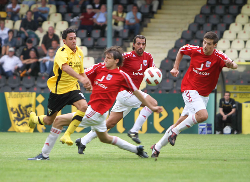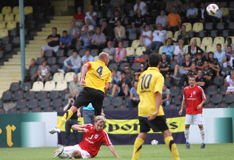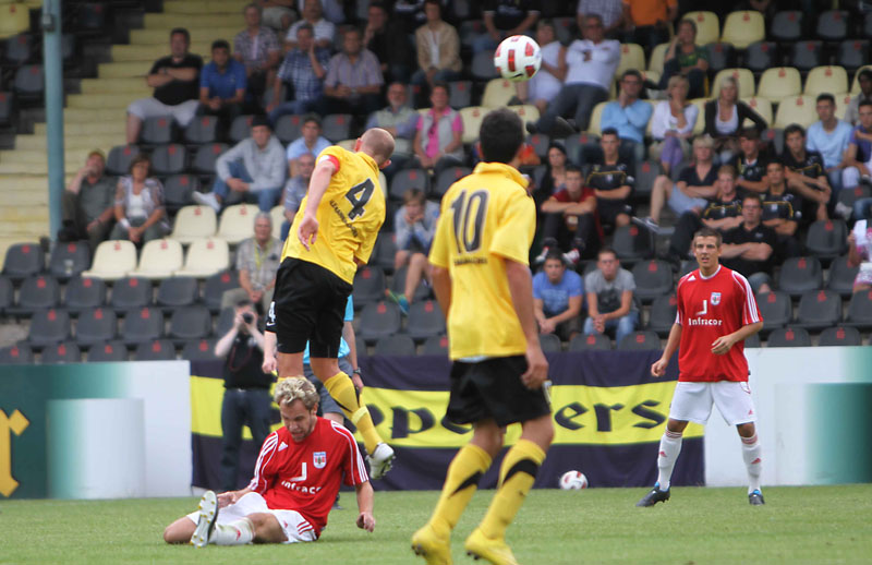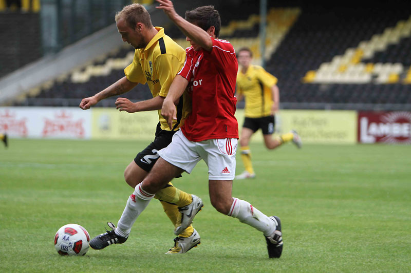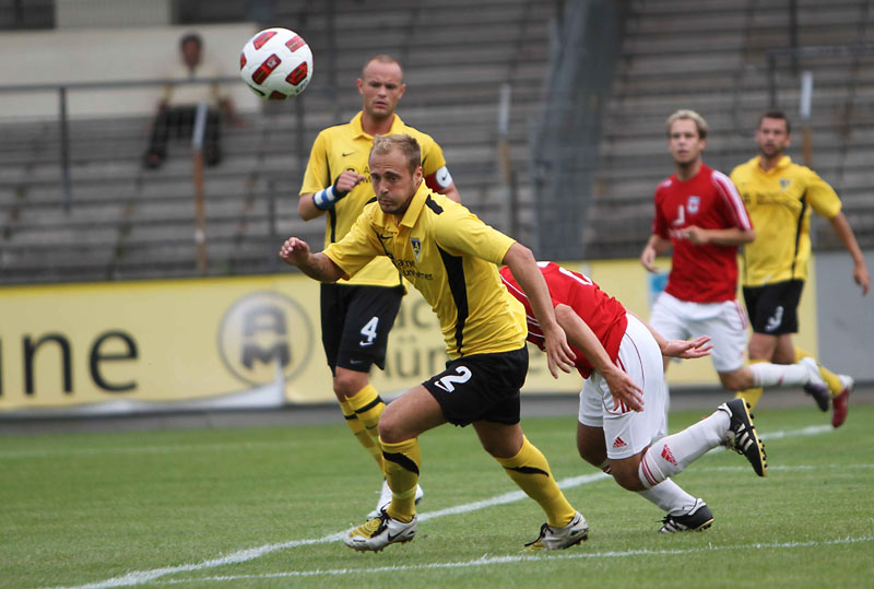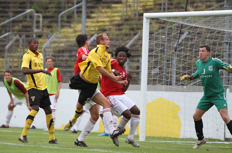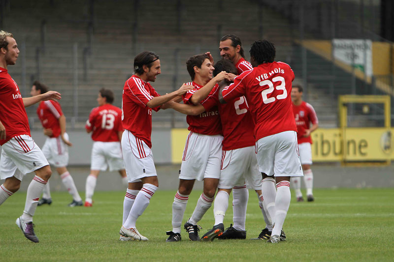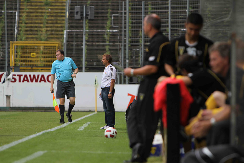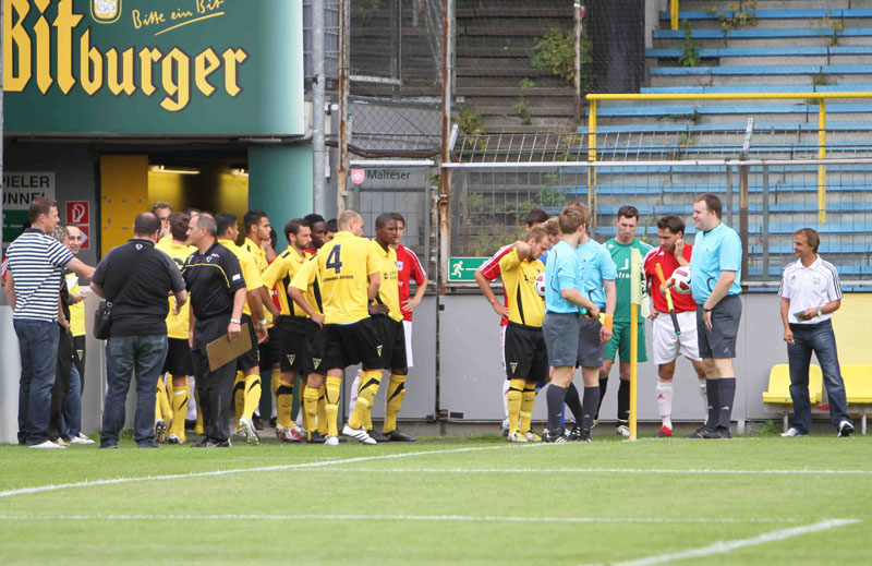 Vor den Augen von Sportdirektor Erik Meijer sowie dem Trainergespann Peter Hyballa und Eric van der Luer konnte Tim Krumpen Spielpraxis zwischen den Pfosten sammeln. Zudem präsentierten sich gleich fünf Neuzugänge in der Startformation. Keine vier Minuten waren gespielt, als die jungen Schwarz Gelben kalt erwischt wurden. Karagülmez zirkelte einen Freistoß aus 20 Metern zur frühen Gästeführung unter die Latte ins Netz. Es dauerte einige Zeit, ehe sich die junge Aachener Truppe von diesem frühen Rückschlag erholte und zu ihrer ersten Gelegenheit kam. Nach einer Linksflanke von Thomas Sabacinski überwand Stephan Wanneck Gästekeeper Rantzow mit einem wuchtigen Kopfball aus acht Metern, doch der Schiedsrichterassistent monierte Fahnen schwenkend eine Abseitsstellung (21.). Auf der Gegenseite hätten die Gäste um ein Haar ihren Vorsprung nur eine Minute später ausgebaut. Einen Freistoß aus 35 Metern halbrechter Position zirkelte Köse vorbei an Freund und Feind an den rechten Aachener Pfosten. Die beste Chance zum Ausgleich folgte erneut aus einer Co-Produktion der beiden Protagonisten des aberkannten Treffers. Nach einer Rechtsecke von Sabacinski köpfte Wanneck das Leder jedoch freistehend einen Meter rechts am Gästetor vorbei (37.).