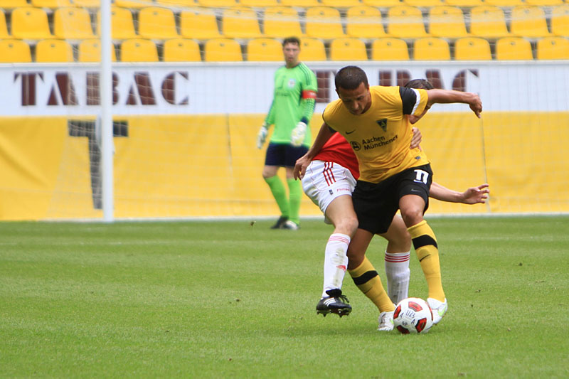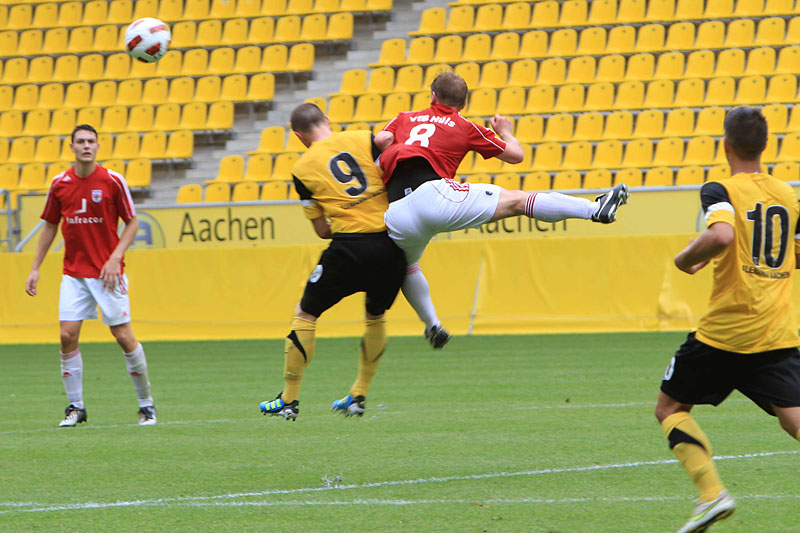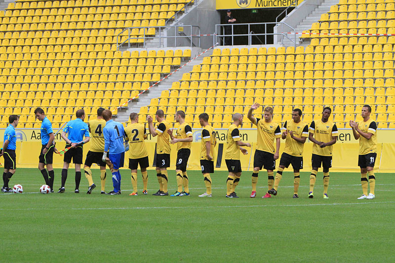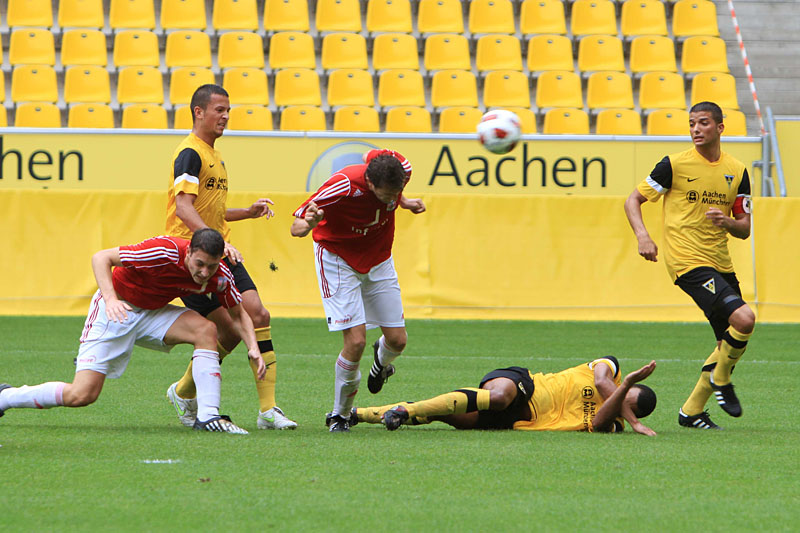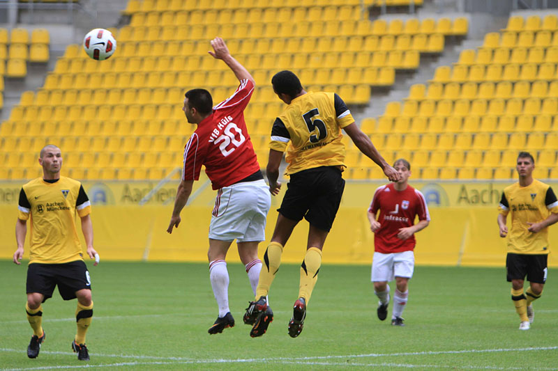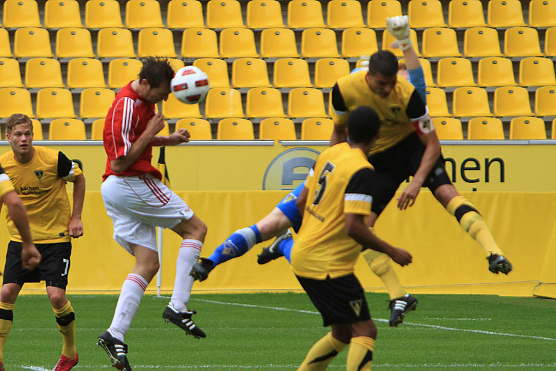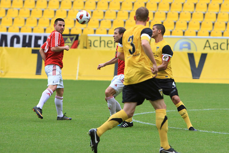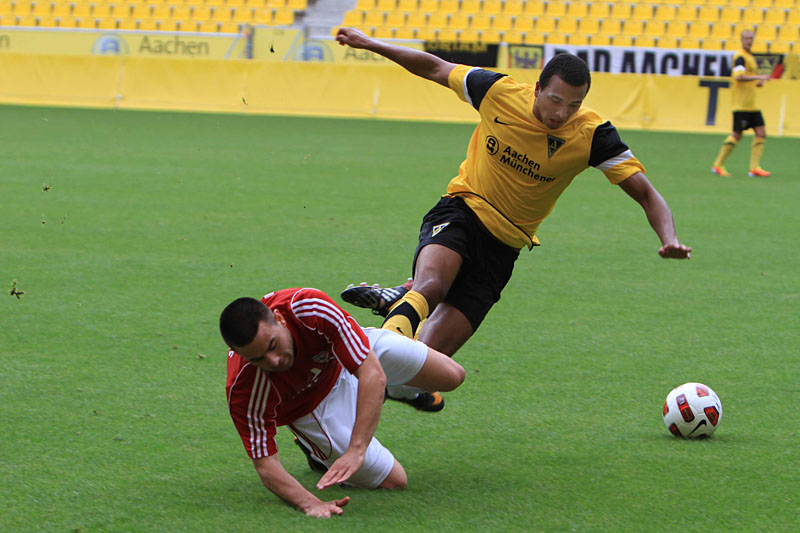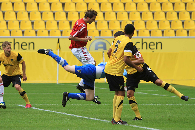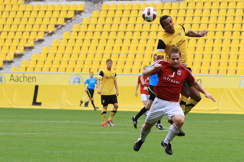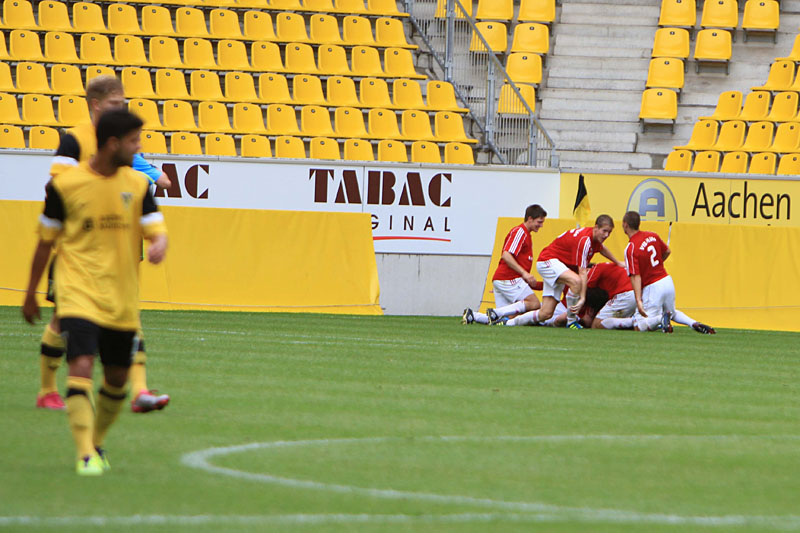 Mit den Profis Andreas Korte, Lennart Hartmann und Fabian Bäcker in der Startformation übernahmen die jungen Alemannen zunächst die Kontrolle und kamen durch zwei Distanzschüsse von Neuzugang Denis Pozder zu ersten Gelegenheiten. Das Tor indes fiel wie aus heiterem Himmel auf der Gegenseite. Die zuvor offensiv nicht in Erscheinung getretenen Gäste profitierten dabei allerdings von tatkräftiger Unterstützung der Aachener. Nach einer Rechtsecke segelte Alemannia-Keeper Jorzig erst unter den Ball hinweg, und im Torraum konnte Planhof das Leder sträflich freistehend zum 0:1 über die Linie köpfen (22.). Die Schwarz-Gelben suchten vergeblich nach einer Antwort. Einen Freistoß von Hartmann aus 25 Metern konnte Gästekeeper Rantzow noch zur Ecke bugsieren (36.) und kurz vor der Pause fand Lubasa aus spitzem Winkel die Lücke in der Abwehr nicht (43.).