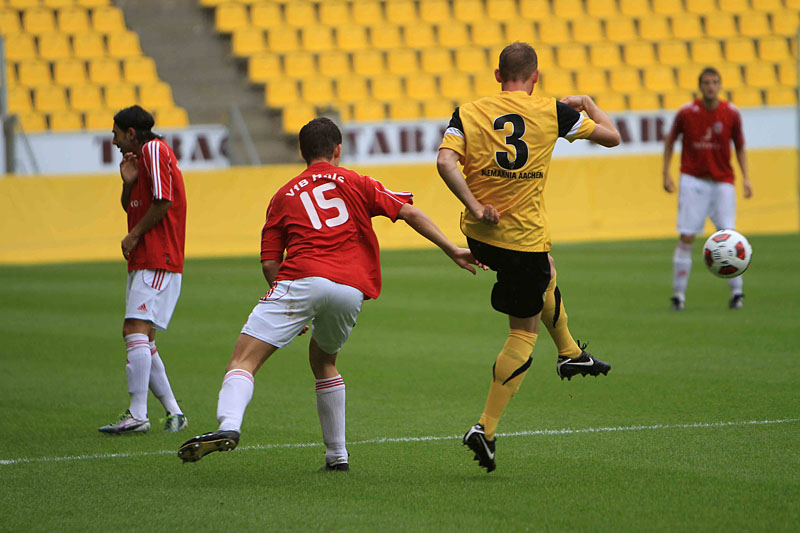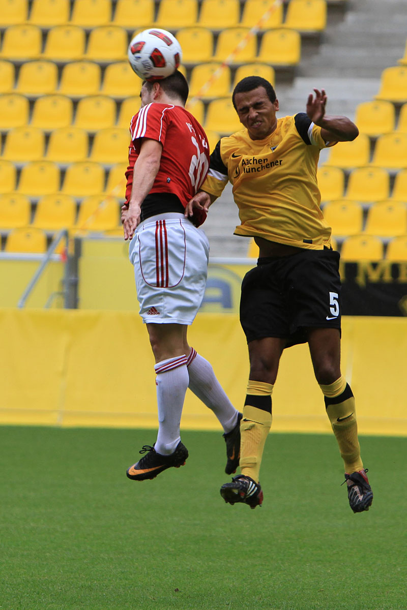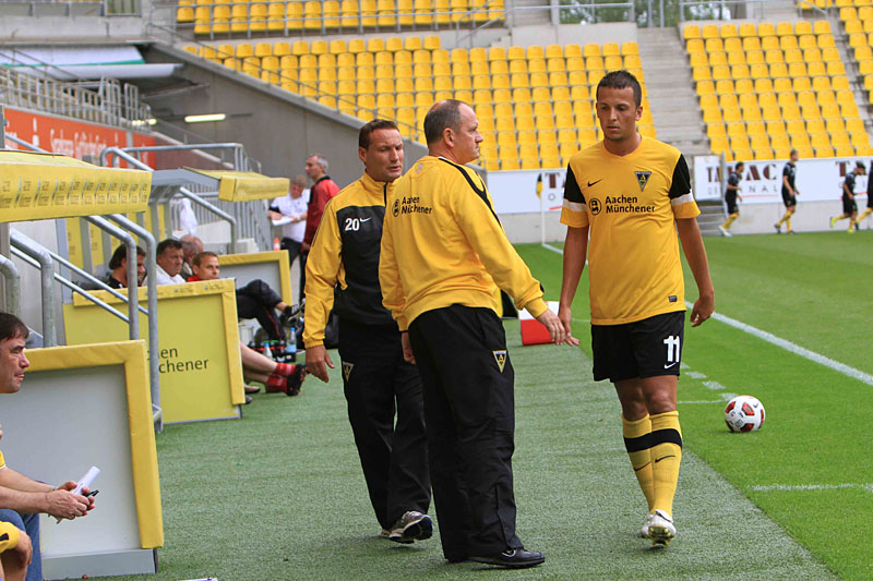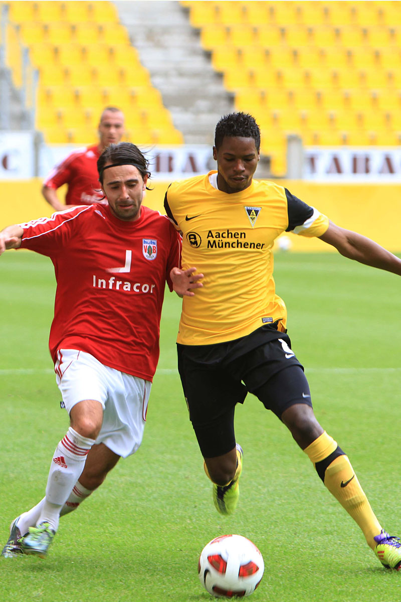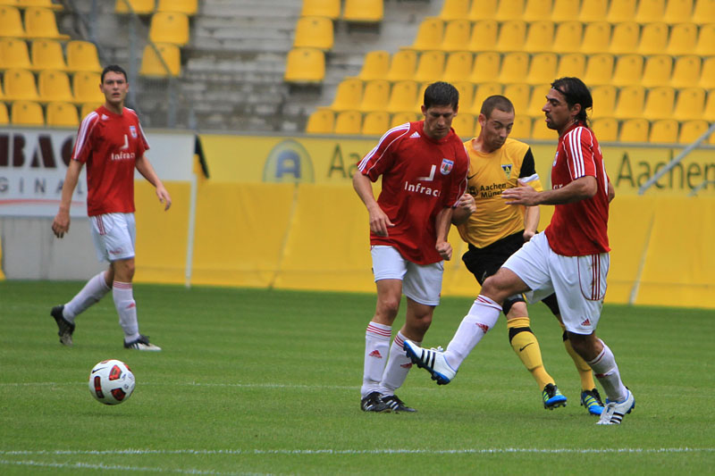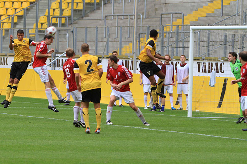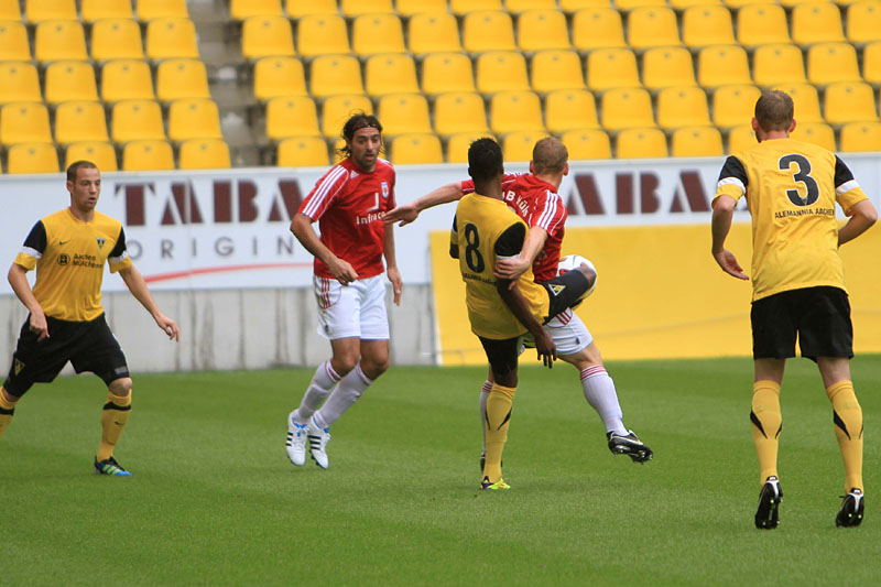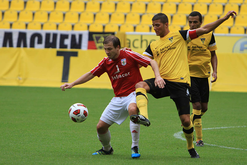 Mit den Profis Andreas Korte, Lennart Hartmann und Fabian Bäcker in der Startformation übernahmen die jungen Alemannen zunächst die Kontrolle und kamen durch zwei Distanzschüsse von Neuzugang Denis Pozder zu ersten Gelegenheiten. Das Tor indes fiel wie aus heiterem Himmel auf der Gegenseite. Die zuvor offensiv nicht in Erscheinung getretenen Gäste profitierten dabei allerdings von tatkräftiger Unterstützung der Aachener. Nach einer Rechtsecke segelte Alemannia-Keeper Jorzig erst unter den Ball hinweg, und im Torraum konnte Planhof das Leder sträflich freistehend zum 0:1 über die Linie köpfen (22.). Die Schwarz-Gelben suchten vergeblich nach einer Antwort. Einen Freistoß von Hartmann aus 25 Metern konnte Gästekeeper Rantzow noch zur Ecke bugsieren (36.) und kurz vor der Pause fand Lubasa aus spitzem Winkel die Lücke in der Abwehr nicht (43.).
