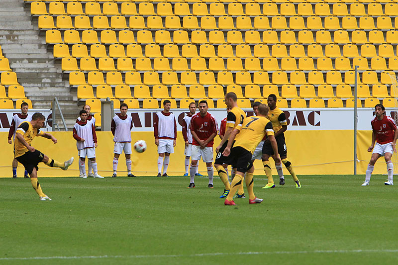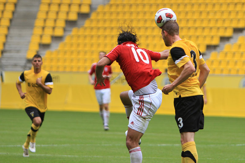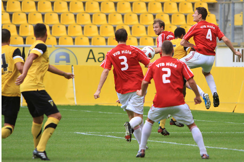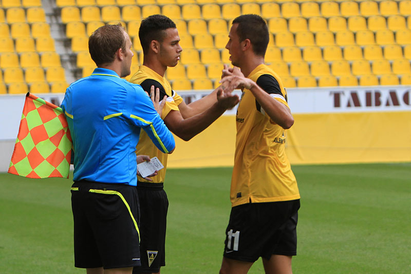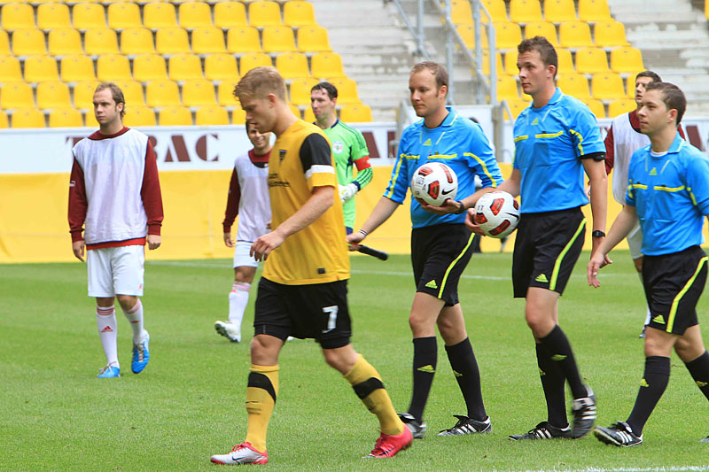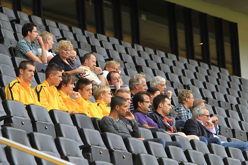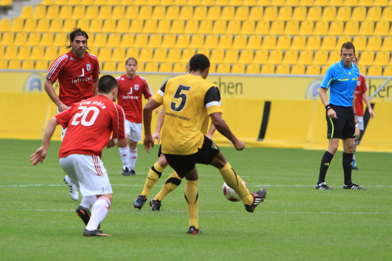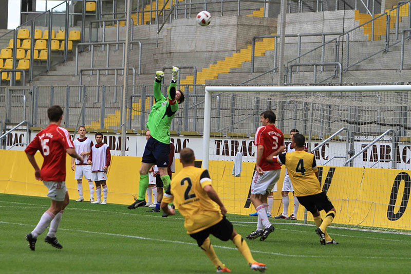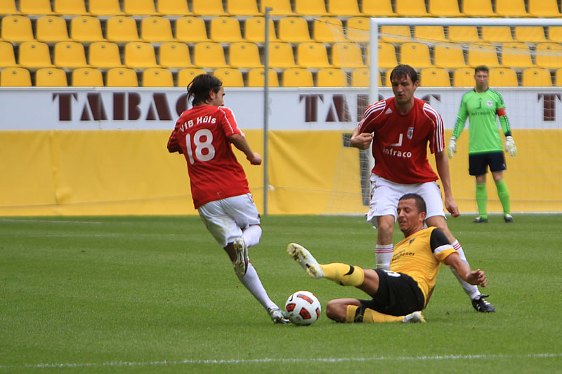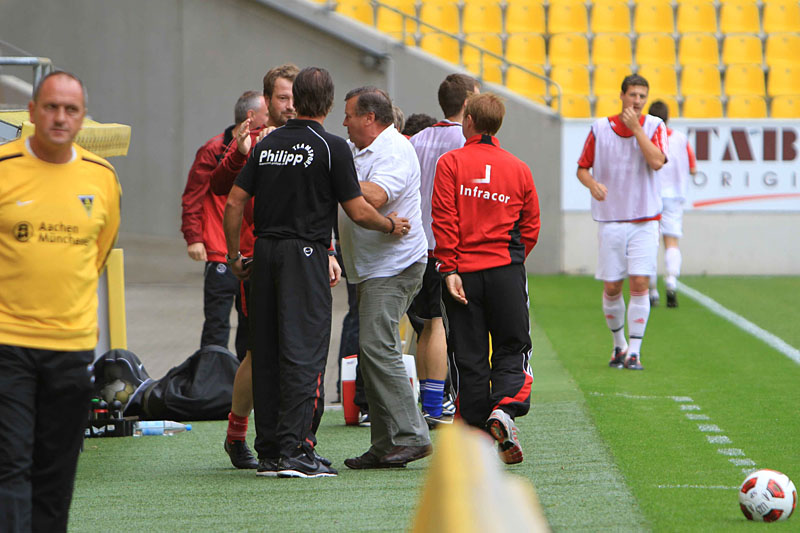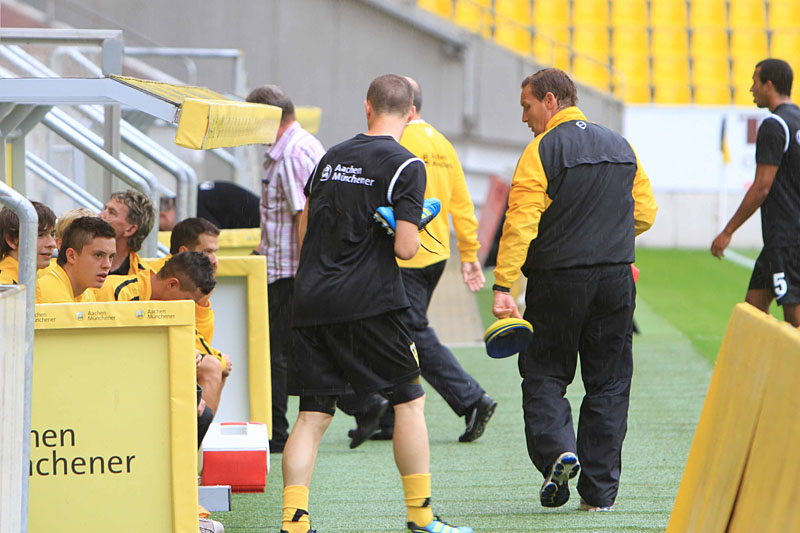 Mit den Profis Andreas Korte, Lennart Hartmann und Fabian Bäcker in der Startformation übernahmen die jungen Alemannen zunächst die Kontrolle und kamen durch zwei Distanzschüsse von Neuzugang Denis Pozder zu ersten Gelegenheiten. Das Tor indes fiel wie aus heiterem Himmel auf der Gegenseite. Die zuvor offensiv nicht in Erscheinung getretenen Gäste profitierten dabei allerdings von tatkräftiger Unterstützung der Aachener. Nach einer Rechtsecke segelte Alemannia-Keeper Jorzig erst unter den Ball hinweg, und im Torraum konnte Planhof das Leder sträflich freistehend zum 0:1 über die Linie köpfen (22.). Die Schwarz-Gelben suchten vergeblich nach einer Antwort. Einen Freistoß von Hartmann aus 25 Metern konnte Gästekeeper Rantzow noch zur Ecke bugsieren (36.) und kurz vor der Pause fand Lubasa aus spitzem Winkel die Lücke in der Abwehr nicht (43.).