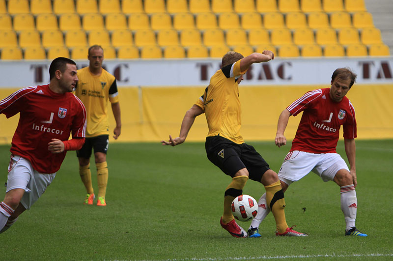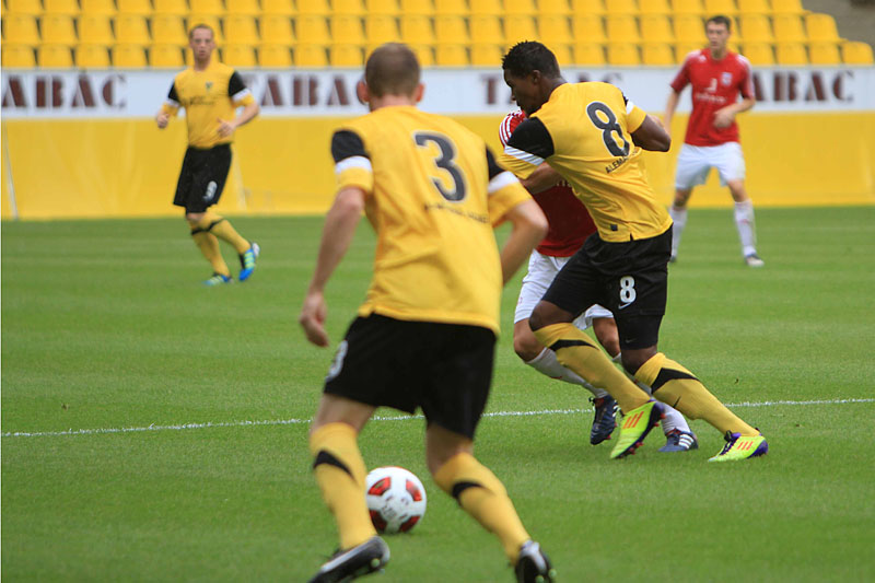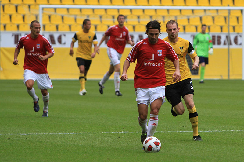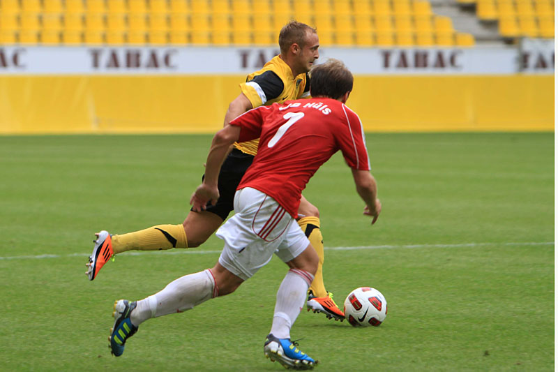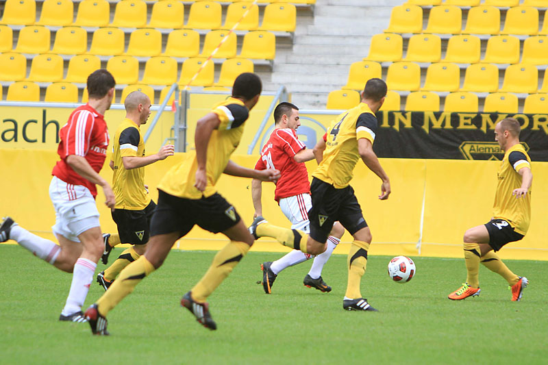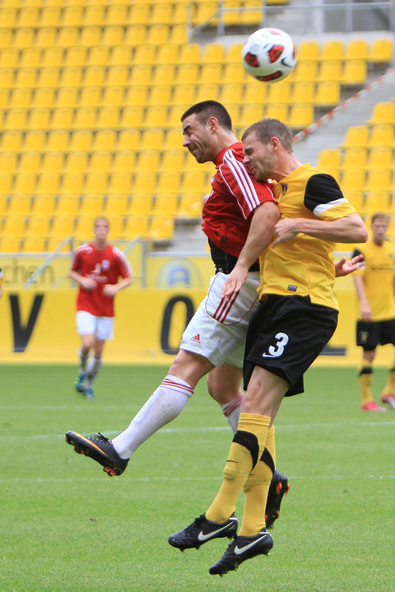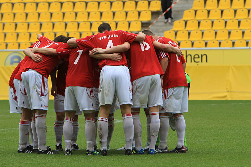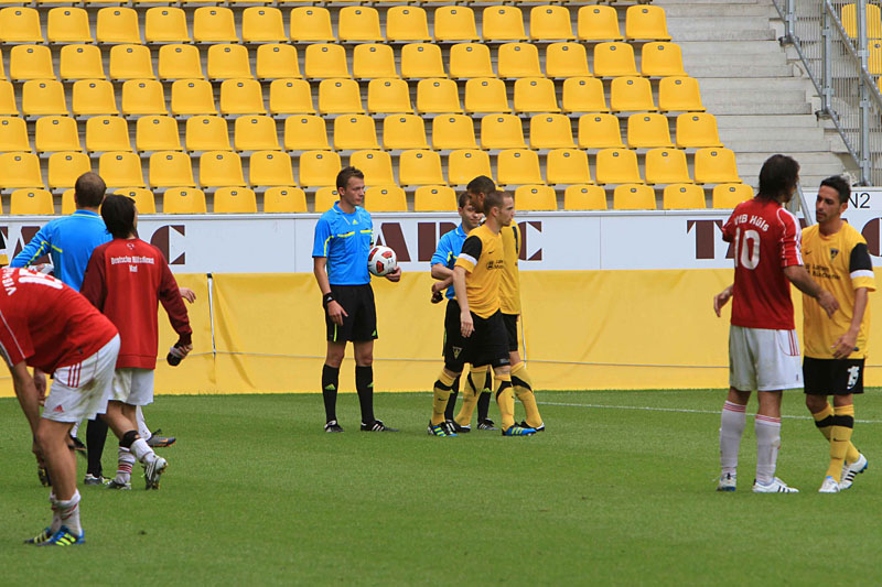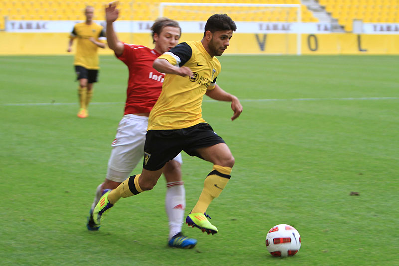 Mit den Profis Andreas Korte, Lennart Hartmann und Fabian Bäcker in der Startformation übernahmen die jungen Alemannen zunächst die Kontrolle und kamen durch zwei Distanzschüsse von Neuzugang Denis Pozder zu ersten Gelegenheiten. Das Tor indes fiel wie aus heiterem Himmel auf der Gegenseite. Die zuvor offensiv nicht in Erscheinung getretenen Gäste profitierten dabei allerdings von tatkräftiger Unterstützung der Aachener. Nach einer Rechtsecke segelte Alemannia-Keeper Jorzig erst unter den Ball hinweg, und im Torraum konnte Planhof das Leder sträflich freistehend zum 0:1 über die Linie köpfen (22.). Die Schwarz-Gelben suchten vergeblich nach einer Antwort. Einen Freistoß von Hartmann aus 25 Metern konnte Gästekeeper Rantzow noch zur Ecke bugsieren (36.) und kurz vor der Pause fand Lubasa aus spitzem Winkel die Lücke in der Abwehr nicht (43.).