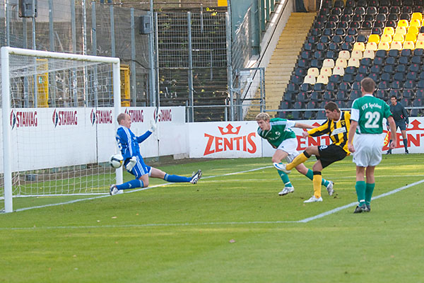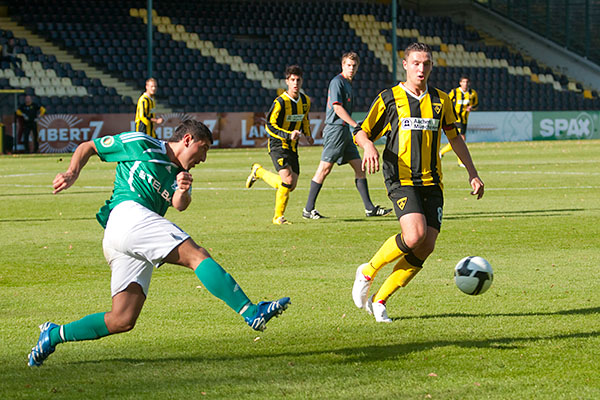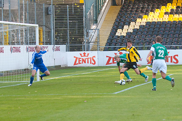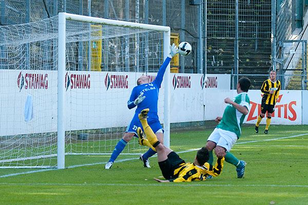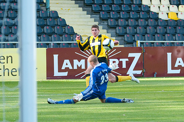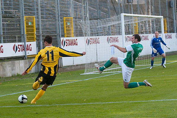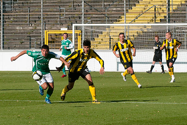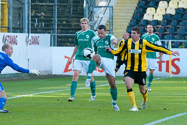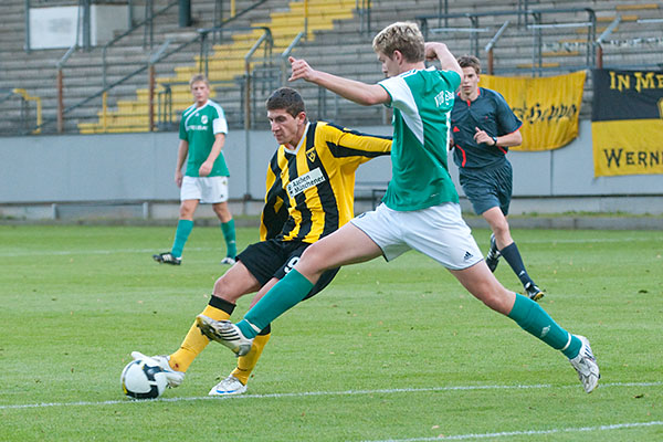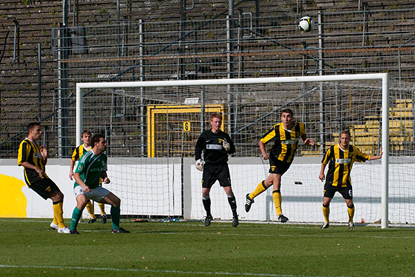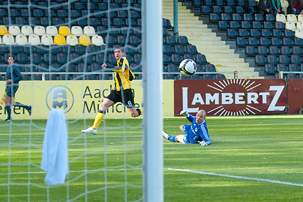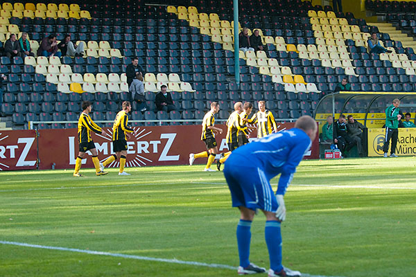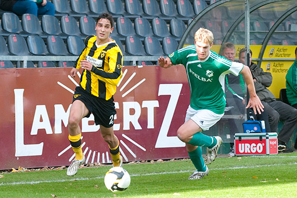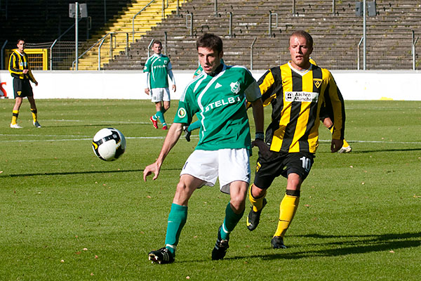 26 Akteure hatte Eric van der Luer in den bisherigen 10 Spielen bereits einsetzen müssen und gegen Speldorf kamen mit Keeper Jared Jorzig sowie den Profis Jerome Polenz und Mirko Casper, die ebenso wie Daniel Adlung Spielpraxis im Amateurteam sammelten, sogar noch drei weitere hinzu. Trotz der personellen Umstellungen fand die junge Aachener Mannschaft gut ins Spiel und ging bereits nach sieben Minuten in Führung. Nach einer Rechtsecke von Alper Uludag ließ Mirko Casper Gästekeeper Grote mit einem wuchtigen Kopfball keine Abwehrchance - 1:0. Nur sechs Minuten später legten die Schwarz-Gelben nach. Mirko Casper leitete den tollen Angriff über die linke Seite ein und die genaue Hereingabe von Uludag vollendete Zlatoko Muhovic trocken zum 2:0 (13.). Als der von Tibor Heber frei gespielte Muhovic mit seinem zweiten Treffer die Weichen endgültig auf Sieg gestellt hatte (21.), schalteten die jungen Alemannen einen Gang zurück.