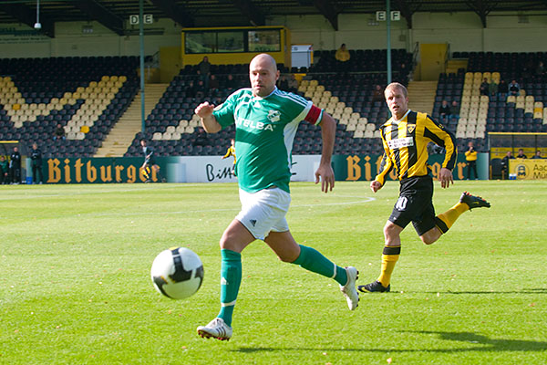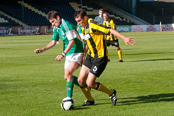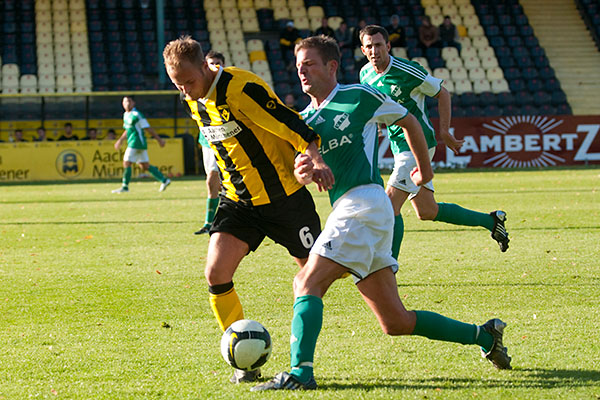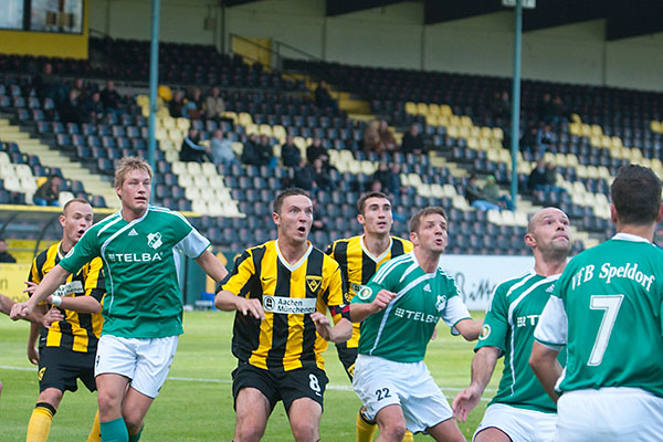 Der Höhepunkt der Saison liegt für die Kicker aus dem Mülheimer Stadtteil Speldorf gut zwei Monate zurück. Nachdem sich die Mannen vom Blötter Weg als Niederrheinpokalsieger für den DFB-Pokal qualifizieren konnten, meinte die Losfee es gut mit den Grün-Weißen. Gegen Rot-Weiß Oberhausen kam es vor fast 8.000 Zuschauern in der Duisburger MSV-Arena zu einem echten Revierderby, welches der Zweitligist am Ende allerdings standesgemäß mit 3:0 gewann. Doch auch in der NRW-Liga hat der VfB bislang auf sich aufmerksam machen können. Mit 14 Punkten platziert sich der Verein im gesicherten Mittelfeld der Tabelle und konnte dabei gleich zehn Zähler auf fremden Plätzen holen. Mit den beiden jüngsten Erfolgen gegen den VfB Hüls und bei den Sportfreunden Siegen konnte zudem immerhin der aktuelle Dritte und Vierte des Klassements bezwungen werden. Eric van der Luer und seine Schützlinge sind also gewarnt. „Speldorf hat viele groß gewachsene Akteure in ihren Reihen, die robust zu Werke gehen“, weiß Aachens Trainer um die Zweikampfstärke des Gegners, den er am vergangenen Dienstag noch einmal persönlich unter die Lupe nahm. Beim Verbandsligisten KFC Uerdingen musste der Titelverteidiger im Niederrheinpokal nachsitzen und setzte sich nach torlosen 120 Minuten am Ende mit 5:3 im Elfmeterschießen durch.