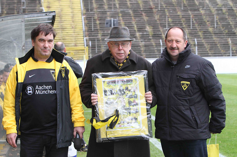 Entsprechend zufrieden zeigte sich Ralf Aussem nach dem Spiel. „Der Sieg ist verdient. Wir haben stark begonnen und dem Gegner so gut wie keine Chance zugelassen“, sagte der Trainer. Einen langjährigen Weggefährten unserer zweiten Mannschaft dürfte dieser Erfolg besonders gefreut haben. Dr. Edgar Cremer vom Förderkreis der Alemannia erhielt vor dem Anpfiff durch den verletzten Sebastian Jansen und Obmann Manfred Werner ein Präsent zu seinem 80. Geburtstag überreicht, welches anschließend mit einem Sieg seiner Lieblingsmannschaft noch vergoldet wurde.