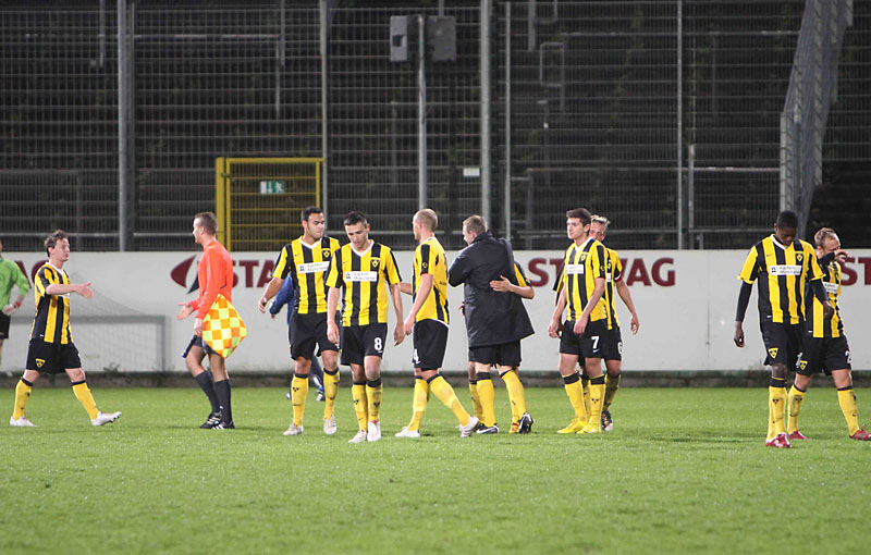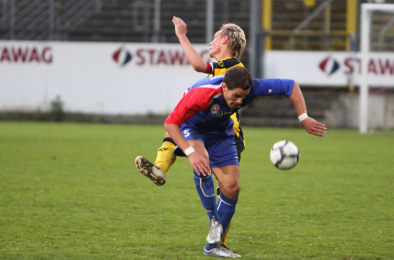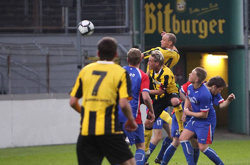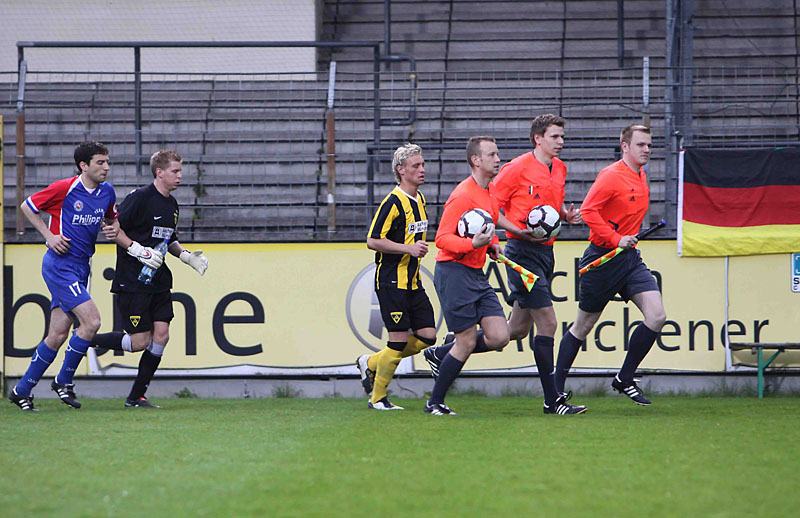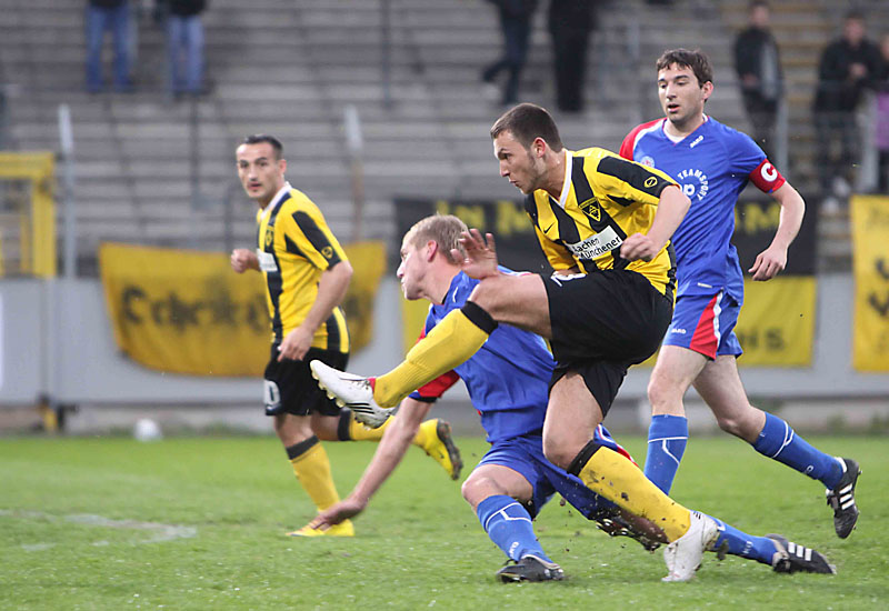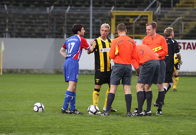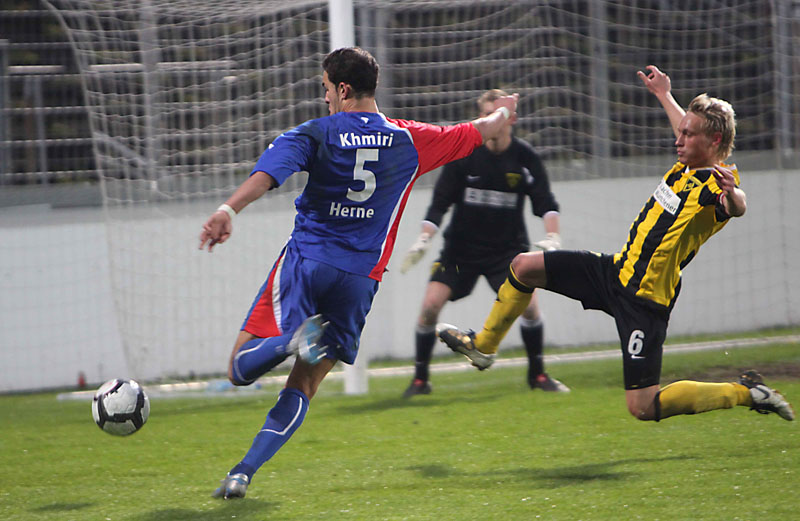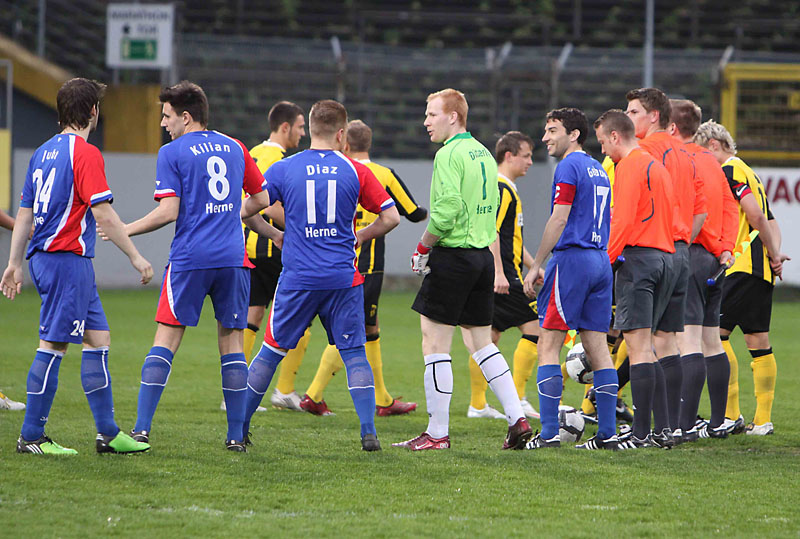 Eric van der Luer konnte erstmals seit Januar noch einmal auf die Dienste von Marco Höger in der NRW-Liga zählen. Alper Uludag hingegen darf in den letzten vier Spielen nicht mehr zum Einsatz kommen, da er zu viele Einsätze im Profiteam zu verzeichnen hat. Die jungen Alemannen ergriffen von Beginn an die Initiative und gingen bereits nach sechs Minuten in Führung. Ein Schussversuch von Heber wurde in den Lauf von Faton Popova abgeblockt, der Gästekeeper Ditterle das Leder durch die Beine spitzelte – 1:0 (6.). Das Spiel ging weiter nur in eine Richtung. Alleine Daniel Engelbrecht hatte vor der Pause drei gute Gelegenheiten, von denen nur eine nutzen konnte. Allerdings wurde dem Treffer wurde aufgrund einer vermeintlichen Abseitsstellung die Anerkennung verweigert (21.). Um ein Haar hätte sich die mangelnde Chancenauswertung fünf Minuten vor der Halbzeit gerächt, doch Urban zielte bei einem Herner Konter freistehend rechts am Tor vorbei.